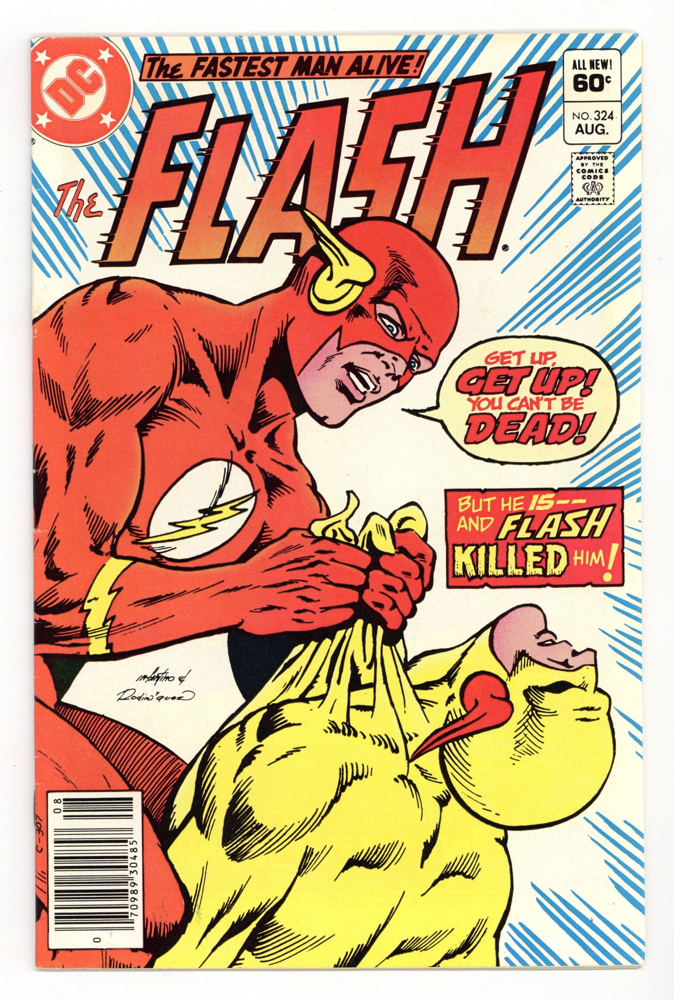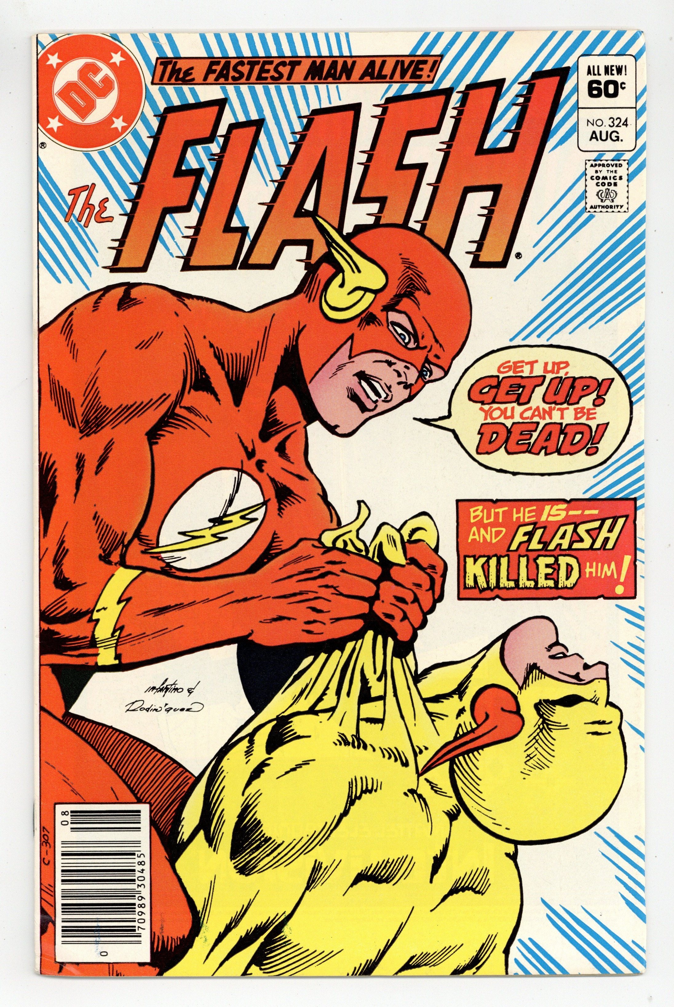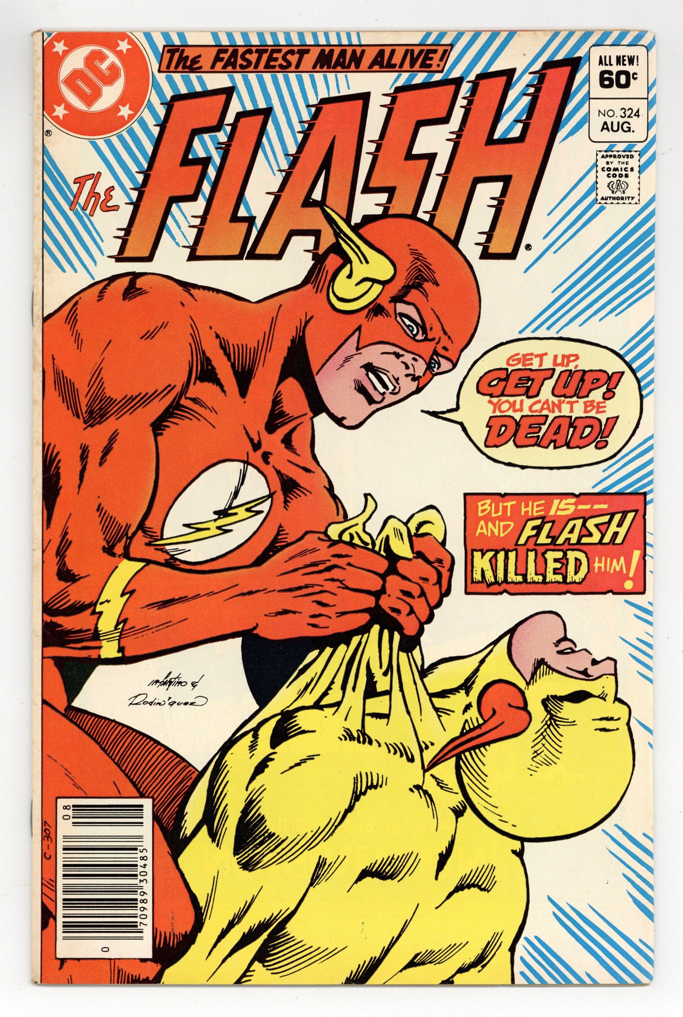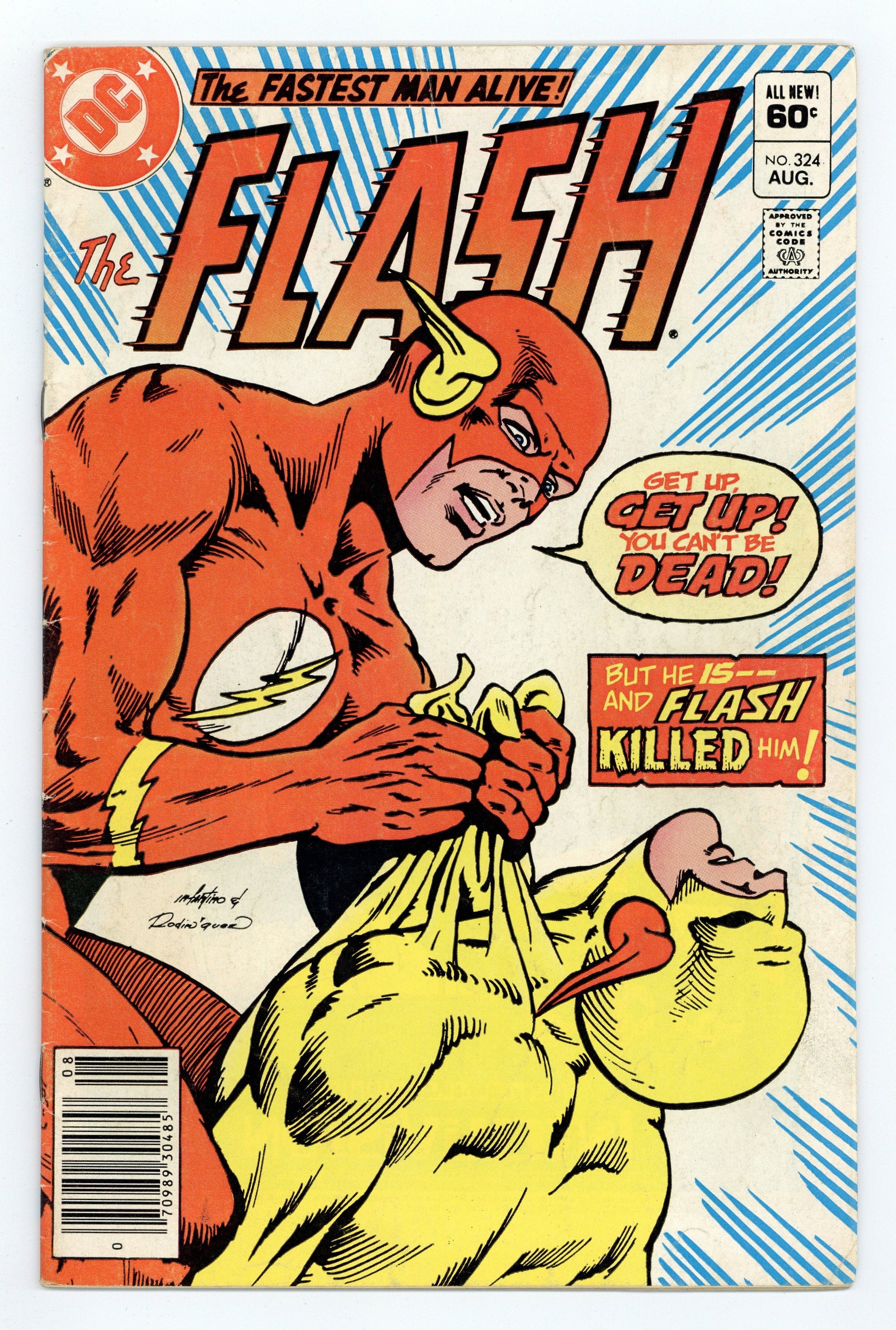 Tags: Flash$50.00Newsstand Edition. Cover pencils by Carmine Infantino, inks by Rodin Rodriguez. The Slayer and the Slain, script by Cary Bates, pencils by Carmine Infantino, inks by Dennis Jensen; While Fiona Webb waits at the altar, Flash engages in an epic battle with Reverse-Flash and ends up killing him to save Barry's bride to be; Kid Flash makes a guest appearance; This leads to the dominant story-line of the last 26 issues, the trial of Flash for the murder of Prof Zoom. Advanced Dungeons & Dragons Intellivision ad. Warlord toy ad from Remco. Batman and the Outsiders ad, art by Jim Aparo. Meanwhile… column by Dick Giordano. Universal Monsters model kits ad from Monogram. Tron Atari 2600 ad. 36 Pages, Full Color. Cover price $0.60.