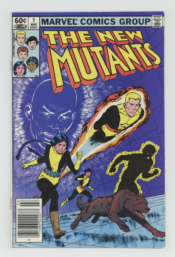 Starts Jan 3 Direct Edition. Regular series begins (first appearance is in Marvel Graphic Novel 4). Cover art by Bob McLeod. Initiation!, script by Chris Claremont, pencils by Bob McLeod, inks by Mike Gustovich; The New Mutants get acclimated to their new home, new talents, new friends, and new teachers, unaware that they are being watched; Moira learns that Professor X has a son; and Psyche is attacked in the Danger Room by an unknown assailant; Origin of Karma. Second appearance of the New Mutants (after Marvel Graphic Novel #4). Cover price $0.60.