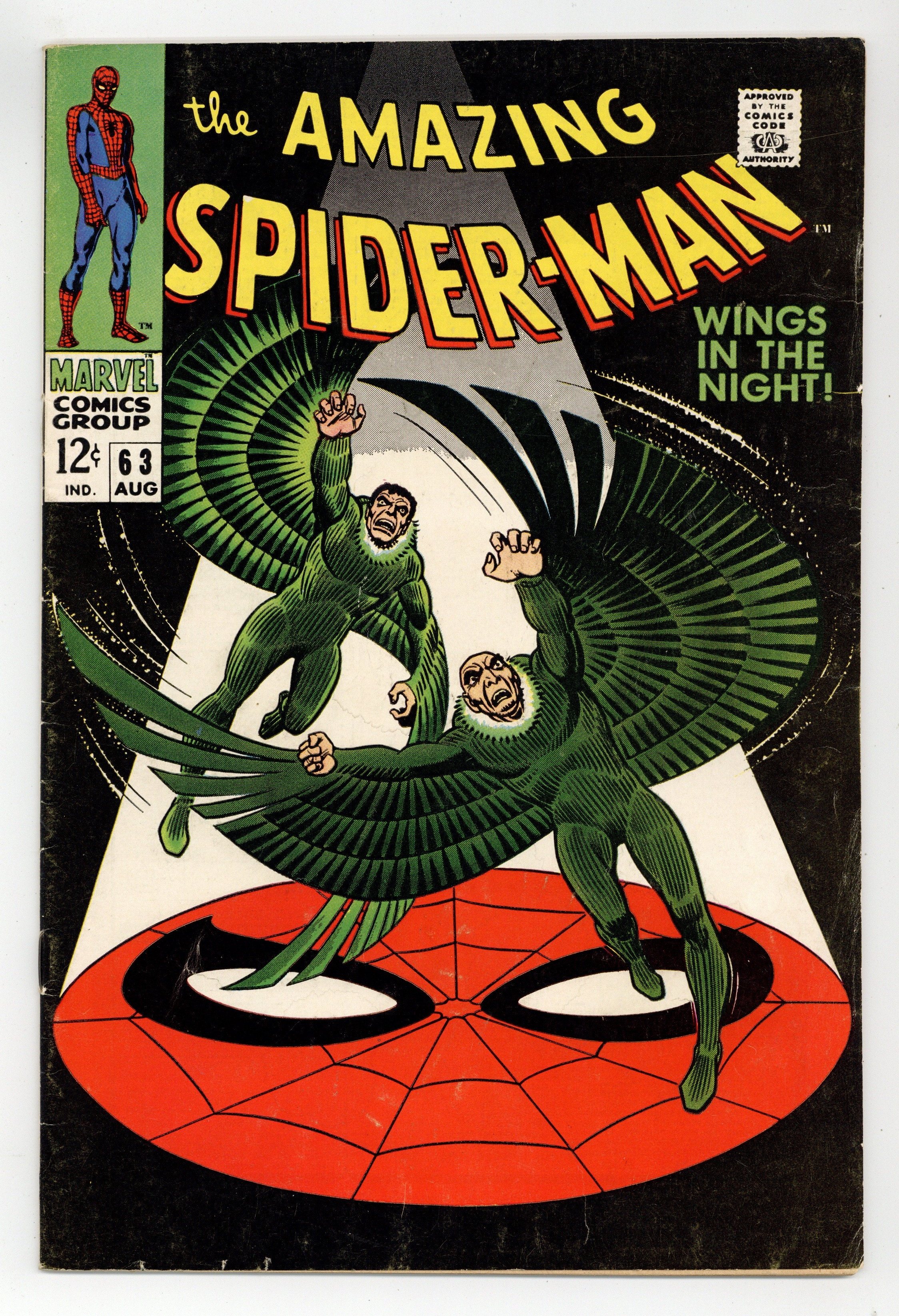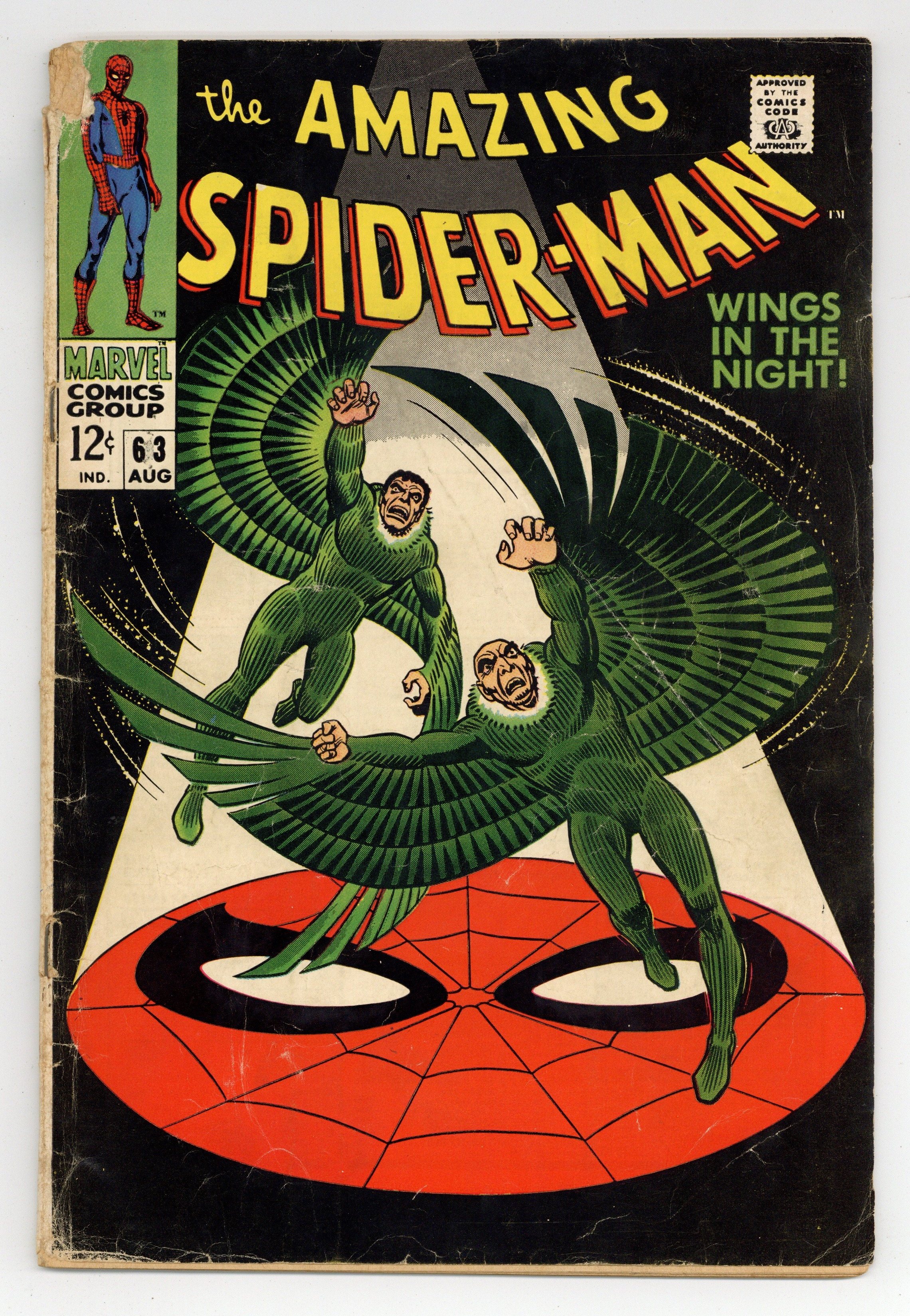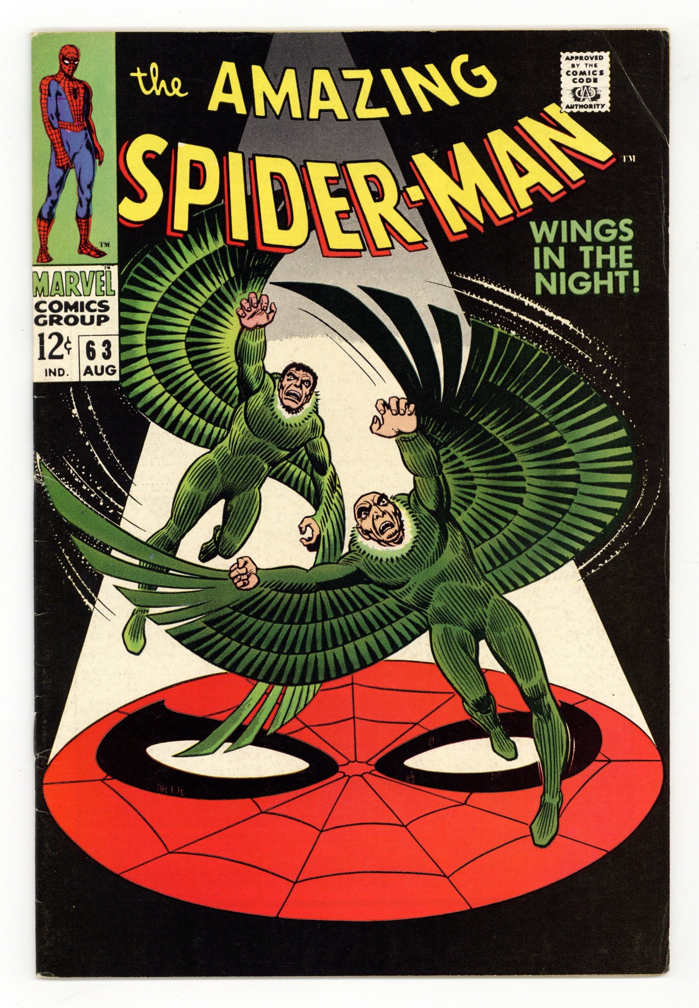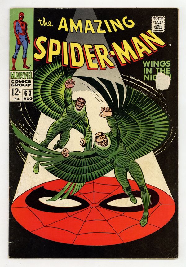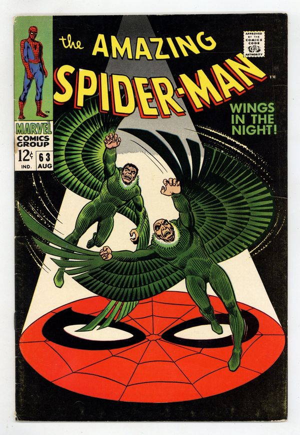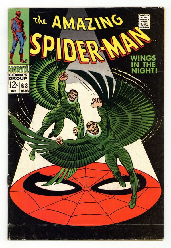 Tags: Marvel Legacy Numbering: Amazing Spider-Man (part 63), Spider-Man$53.00"Wings in the Night!" Part 1 of 2. Script by Stan Lee. Art by John Romita (layouts) and Don Heck (pencils). Inks by Mike Esposito (as Mickey Demeo). Cover by John Romita. Young Mr. Parker is on the outs with Gwen Stacy after the misunderstanding with her father three issues ago. Peter would like to mend fences with his girlfriend, but he has a second problem. Norman Osborn is hallucinating about Spider-Man -- and that could mean really big trouble! In the meantime, the original Vulture has returned! Adrian Toomes did not die in Amazing Spider-Man #48. And surprisingly, the old Vulture wants to team up with the new Vulture (aka Blackie Drago). But Blackie wants nothing to do with Adrian, so the war of the Vultures begins! And the winner gets the Amazing Spider-Man next! Cameo appearances by Harry Osborn, Professor Miles Warren, Captain Stacy, Betty Brant, and J. Jonah Jameson. (Notes: The letters page includes a letter from comics writer Don McGregor. This issue was reprinted in Marvel Tales #46.) 36 pages. Cover price $0.12.
