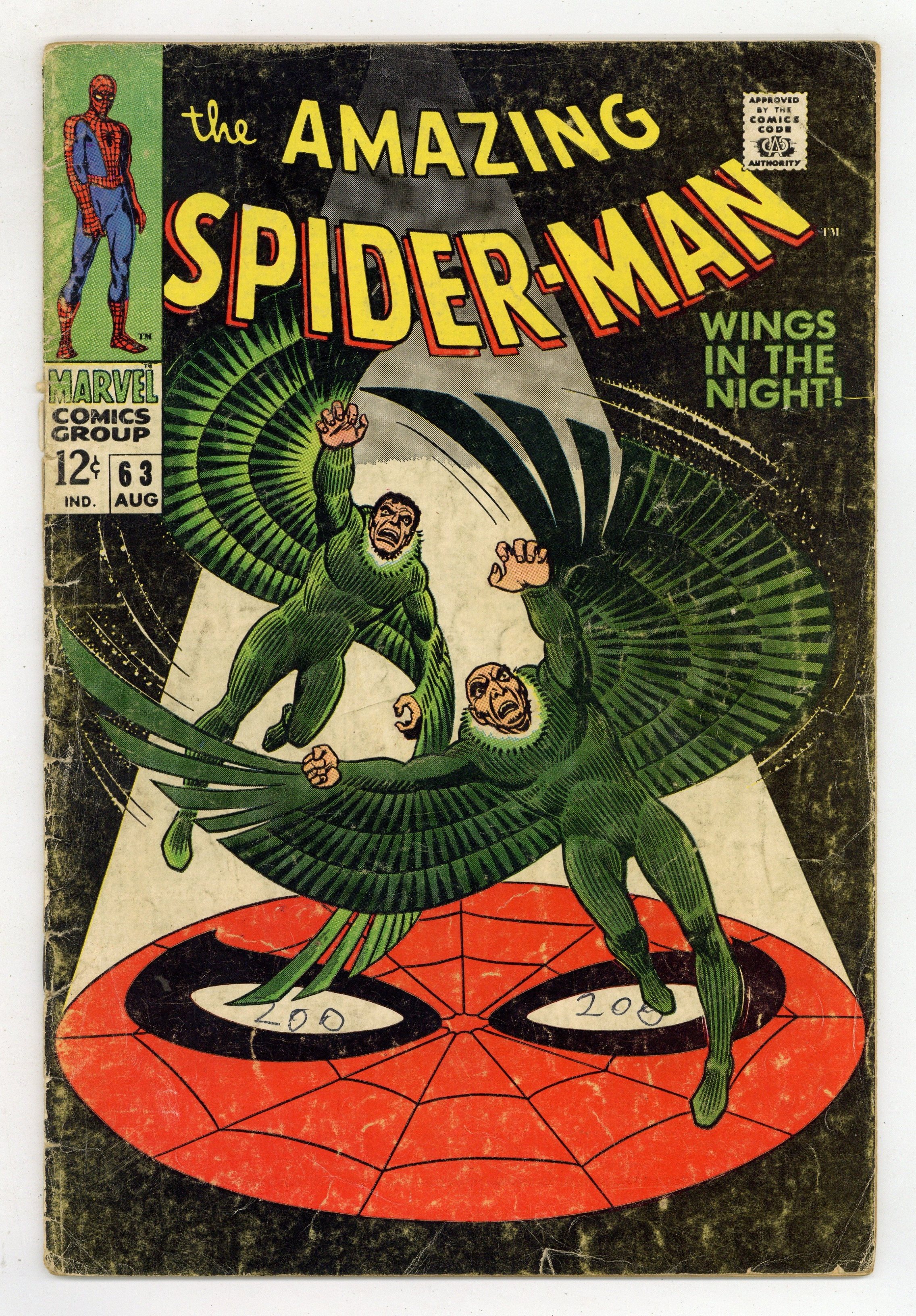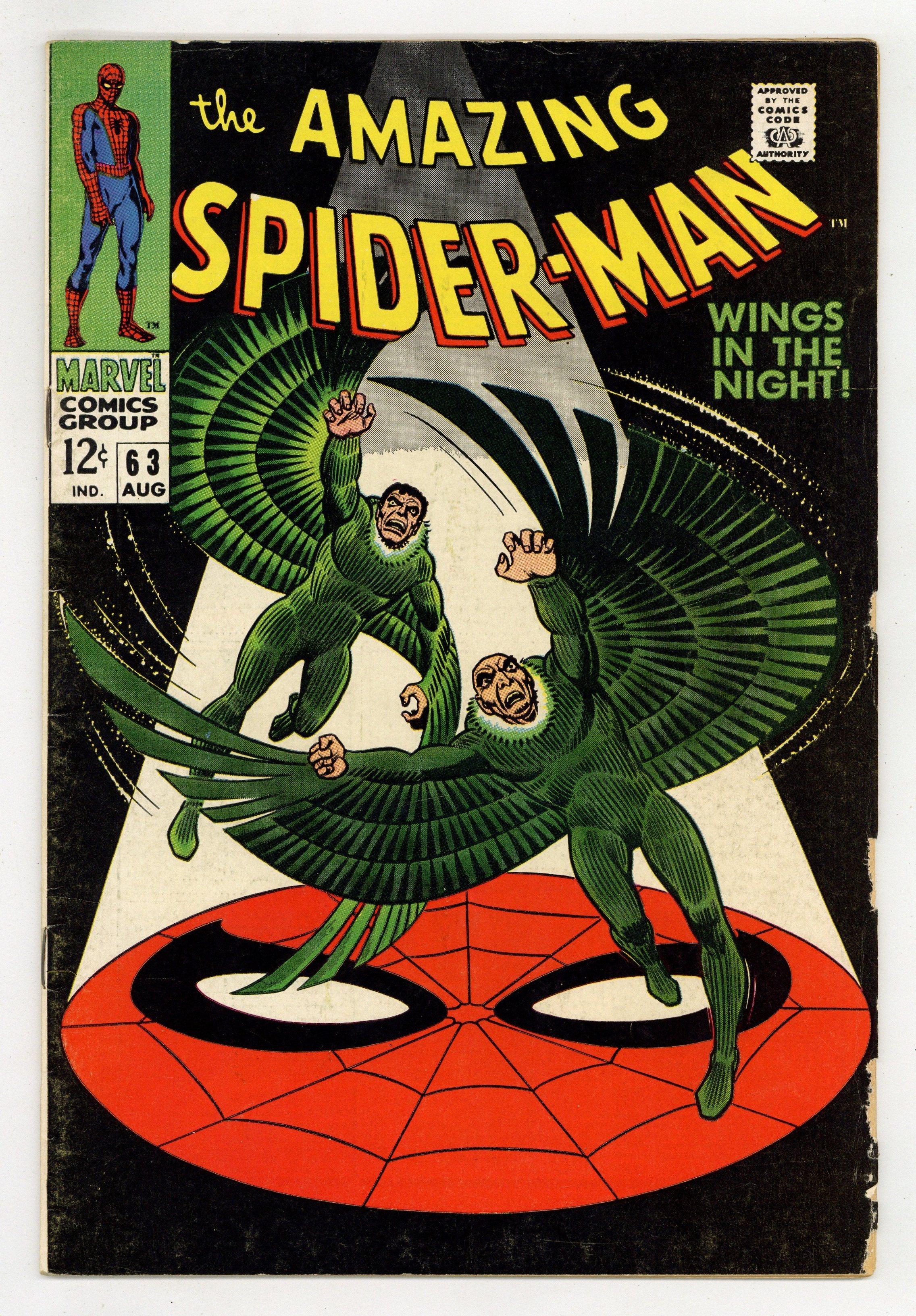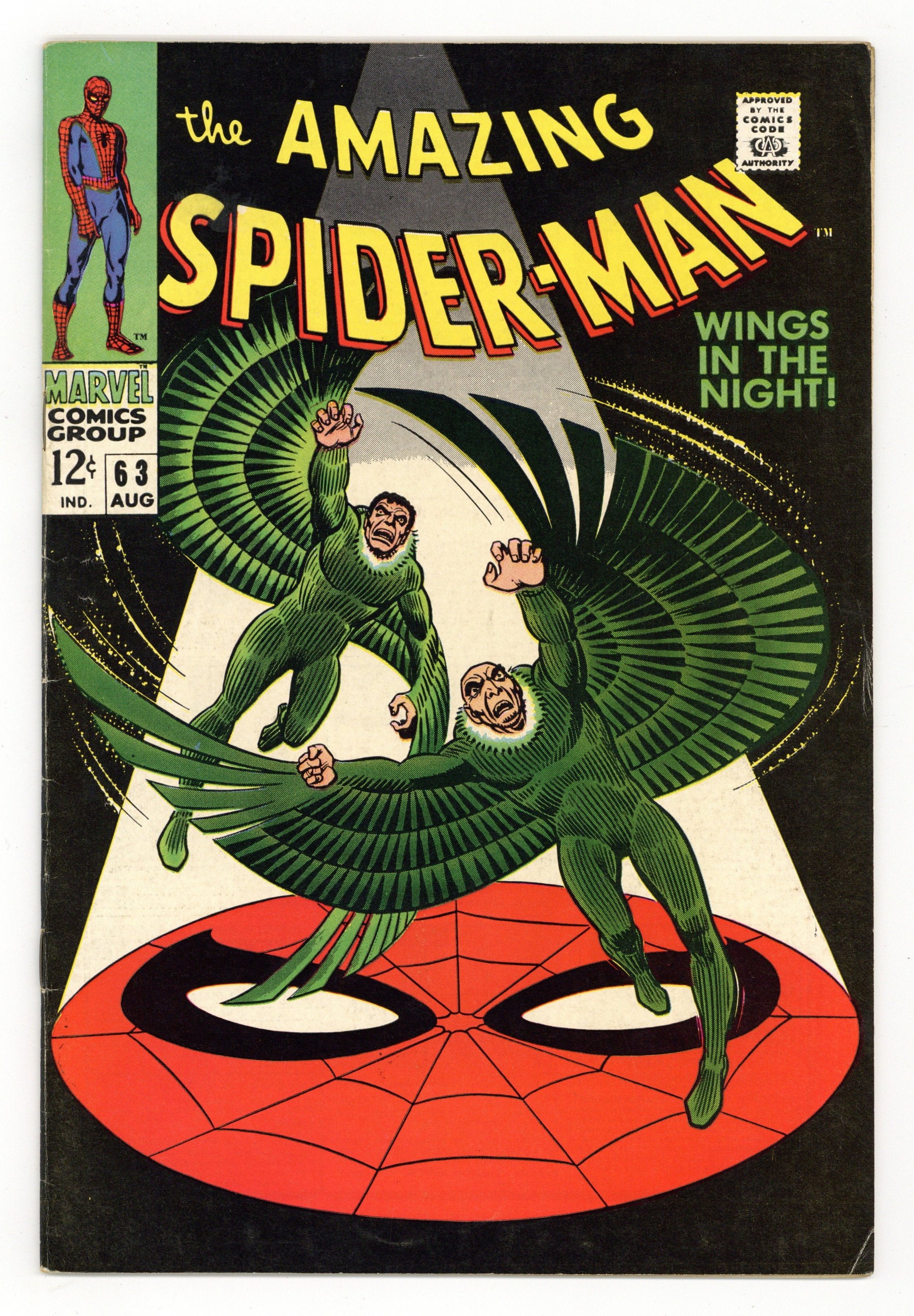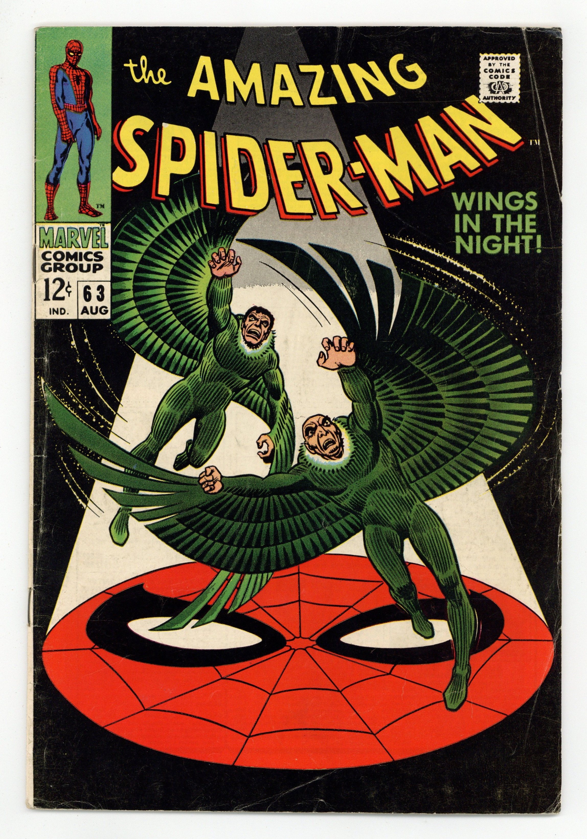 Tags: Marvel Legacy Numbering: Amazing Spider-Man (part 63), Spider-Man$53.00"Wings in the Night!" Part 1 of 2. Script by Stan Lee. Art by John Romita (layouts) and Don Heck (pencils). Inks by Mike Esposito (as Mickey Demeo). Cover by John Romita. Young Mr. Parker is on the outs with Gwen Stacy after the misunderstanding with her father three issues ago. Peter would like to mend fences with his girlfriend, but he has a second problem. Norman Osborn is hallucinating about Spider-Man -- and that could mean really big trouble! In the meantime, the original Vulture has returned! Adrian Toomes did not die in Amazing Spider-Man #48. And surprisingly, the old Vulture wants to team up with the new Vulture (aka Blackie Drago). But Blackie wants nothing to do with Adrian, so the war of the Vultures begins! And the winner gets the Amazing Spider-Man next! Cameo appearances by Harry Osborn, Professor Miles Warren, Captain Stacy, Betty Brant, and J. Jonah Jameson. (Notes: The letters page includes a letter from comics writer Don McGregor. This issue was reprinted in Marvel Tales #46.) 36 pages. Cover price $0.12.