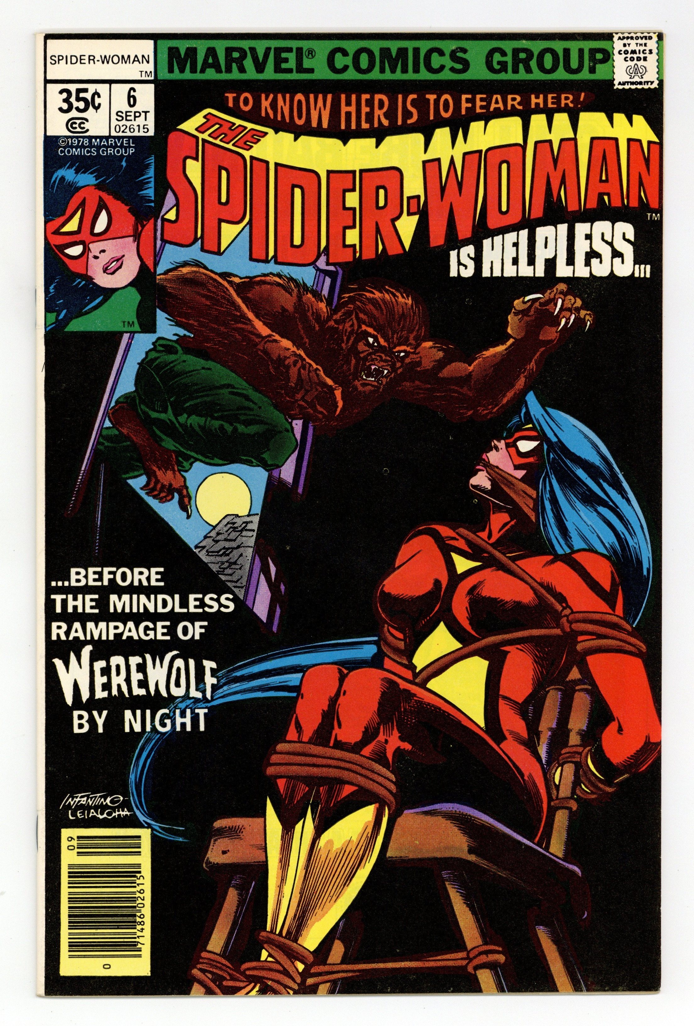 Cover pencils by Carmine Infantino, inks by Steve Leialoha. End of a Nightmare!!, script by Marv Wolfman, pencils by Carmine Infantino, inks by Rick Bryant; Spider-Woman [Jessica Drew] vs. Werewolf By Night [Jack Russell]. 32 pgs. $0.35. Cover price $0.35.