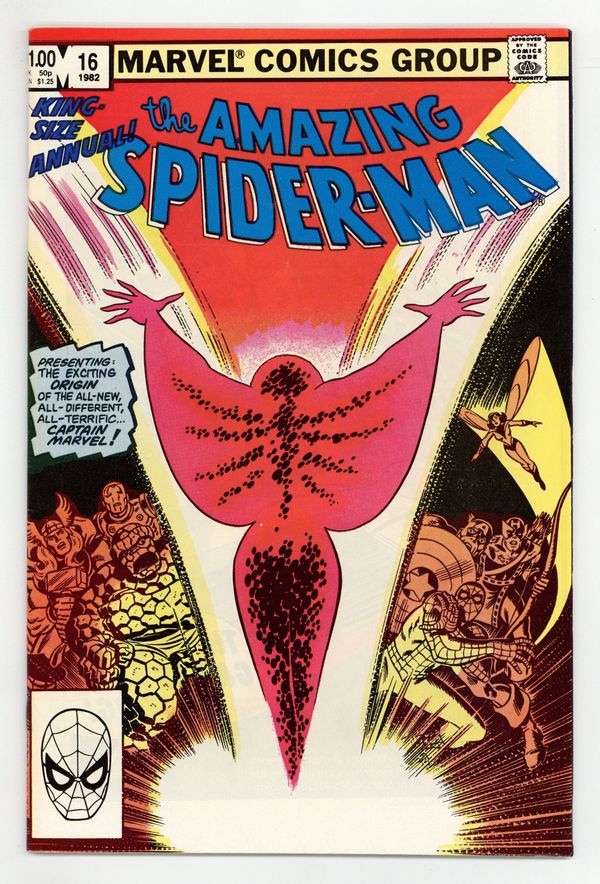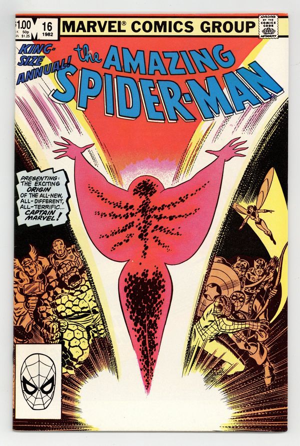 Direct Edition. "Who's That Lady?" First appearance of the second Captain Marvel, Monica Rambeau. Guest-starring the Avengers and the Thing. Script by Roger Stern. Art by John Romita Jr. (breakdowns) and John Romita Sr. (finishes). Cover by John Romita Jr. and John Romita Sr. It's the dazzling debut of the new Captain Marvel (aka Monica Rambeau)! After gaining her powers in a freak accident on an offshore oil rig, the New Orleans native needs help controlling her awesome new abilities! Monica travels to New York City in hopes of finding the Fantastic Four! But she bumps into the Spectacular Spider-Man first! After eluding the web-slinger, Captain Marvel zooms to the Baxter Building! However, Ben Grimm can only offer moral support, so he sends the distressed captain to Avengers Mansion! Once there Shell-head and the Wasp attempt to stabilize Captain Marvel's runaway powers, but the wall-crawler inadvertently interferes! Is the new Captain Marvel's superhero career going to be over...before it even starts? Cameo appearances by Harry Osborn and Liz (Allan) Osborn. Avengers Lineup: Captain America, Hawkeye, Iron Man, She-Hulk, Thor, and the Wasp. First backup feature: "The Many Loves of Peter Parker" One-page breakdown of the various loves of Peter Parker's life. Second backup feature: "The Daily Bugle" One-page illustration of the cast of characters at the Daily Bugle. (Note: Captain Marvel appears next in Avengers 227.) 52 pages. Cover price $1.00.
