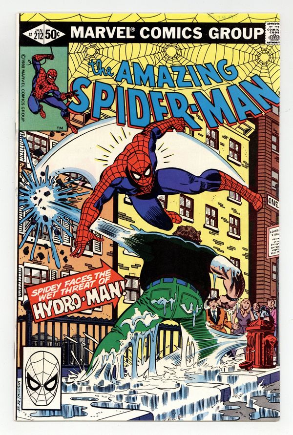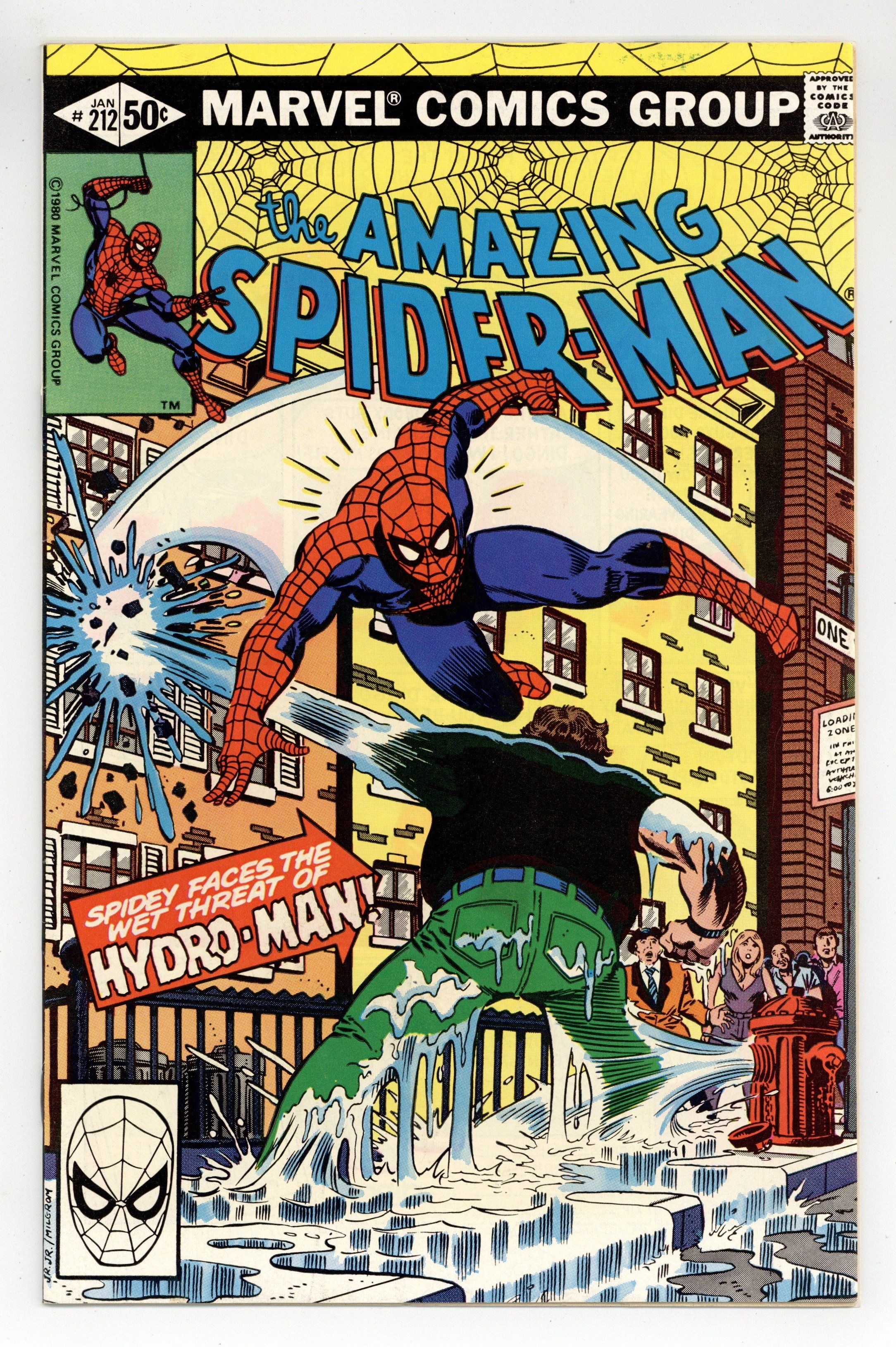 Tags: Marvel Legacy Numbering: Amazing Spider-Man (part 212), Spider-Man$45.00Direct Edition. "The Coming of Hydroman!" First appearance of Hydro-Man. Script by Denny O'Neil. Art by John Romita Jr. (breakdowns) and Jim Mooney (finishes). Cover by John Romita Jr. and Al Milgrom. The adventure with the Sub-Mariner is over! And now the cargo ship with the wall-crawling escort heads back into port. But before the vessel can dock, a bizarre accident sends a crewmember tumbling overboard near an experimental undersea generator! And instantly a new super-villain is born...Hydro-Man! Shortly thereafter Morrie Bench (aka Hydro-Man) starts settling scores with old enemies across the city! And Spider-Man is on his list! At high noon atop an NYC office building, Hydro-Man tries to drown the web-slinger! Does the amazing one need a life jacket? Cameo appearances by J. Jonah Jameson and Joe Robertson. (Notes: Hydro-Man returns in Amazing Spider-Man 217. This issue includes a full-page ad for Hostess Fruit Pies featuring Captain America and Nick Fury vs. the Trapster.) 36 pgs. Cover price $0.50.