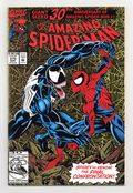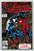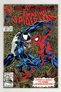 Direct Edition. 30th Anniversary issue of Amazing Spiderman #1. "The Bride of Venom" Part 2 of 2. Script by David Michelinie. Pencils by Mark Bagley. Inks by Randy Emberlin. Gold foil holografix cover by Mark Bagley and Randy Emberlin. Inside an abandoned Brooklyn amusement park, the Lethal Protector holds Richard and Mary Parker captive! The disturbed Venom thinks he's just doing what's best for Peter's parents! But that's not going to work! No way, no how! So, the wall-crawler heads to the park knowing a fierce fight awaits! However, the web-slinger may have help this time from a very unlikely source... Eddie Brock's ex-wife! Wow, will there be a family reunion atop the Ferris wheel? Or perhaps a funeral beneath it? One way or another, the Amazing Spider-Man and Venom battle for the last time! Cameo appearances by Silver Sable, Battlestar, Mary Jane Watson, and J. Jonah Jameson. Second story: "True Friends!" Script by Tom DeFalco. Pencils by Patrick Olliffee. Inks by Mark McKenna. Aware of what the Human Torch did to Empire State University, Spider-Man vows to bring his friend to justice. Cameo appearance by Silver Sable. Plot crosses over with Fantastic Four 373 & 374. Third story: "The Monster Within" Script by Eric Fein. Art by Dan Panosian. JJJ tries to get his son, John Jameson, started in the field of journalism. Fourth story: "Echoes..." Script by Terry Kavanagh. Pencils by Aaron Lopresti. Inks by Don Hudson. The Chameleon visits the grave of Kraven the Hunter. (Notes: Venom appears next in the first issue of his Lethal Protector (1993) series. The letters page includes a statement of ownership: average print run 660,958. average paid circulation 544,900.) 68 pages. Cover price $3.95.