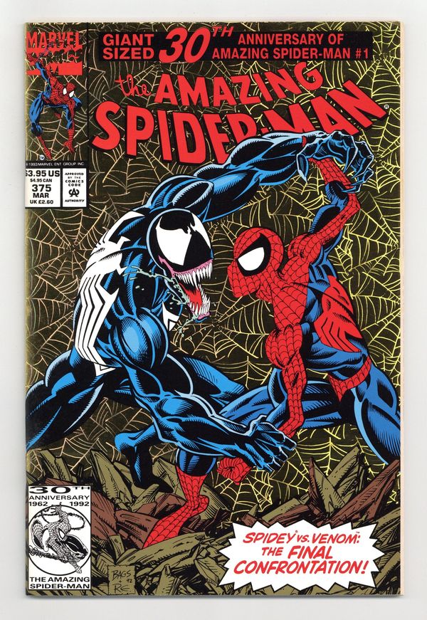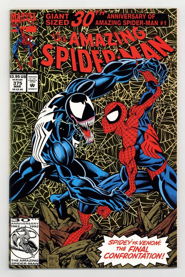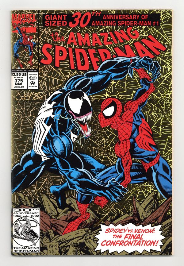 Tags: Marvel Legacy Numbering: Amazing Spider-Man (part 375), Print Run Statistics$13.00Direct Edition. 30th Anniversary issue of Amazing Spiderman #1. "The Bride of Venom" Part 2 of 2. Script by David Michelinie. Pencils by Mark Bagley. Inks by Randy Emberlin. Gold foil holografix cover by Mark Bagley and Randy Emberlin. Inside an abandoned Brooklyn amusement park, the Lethal Protector holds Richard and Mary Parker captive! The disturbed Venom thinks he's just doing what's best for Peter's parents! But that's not going to work! No way, no how! So, the wall-crawler heads to the park knowing a fierce fight awaits! However, the web-slinger may have help this time from a very unlikely source... Eddie Brock's ex-wife! Wow, will there be a family reunion atop the Ferris wheel? Or perhaps a funeral beneath it? One way or another, the Amazing Spider-Man and Venom battle for the last time! Cameo appearances by Silver Sable, Battlestar, Mary Jane Watson, and J. Jonah Jameson. Second story: "True Friends!" Script by Tom DeFalco. Pencils by Patrick Olliffee. Inks by Mark McKenna. Aware of what the Human Torch did to Empire State University, Spider-Man vows to bring his friend to justice. Cameo appearance by Silver Sable. Plot crosses over with Fantastic Four 373 & 374. Third story: "The Monster Within" Script by Eric Fein. Art by Dan Panosian. JJJ tries to get his son, John Jameson, started in the field of journalism. Fourth story: "Echoes..." Script by Terry Kavanagh. Pencils by Aaron Lopresti. Inks by Don Hudson. The Chameleon visits the grave of Kraven the Hunter. (Notes: Venom appears next in the first issue of his Lethal Protector (1993) series. The letters page includes a statement of ownership: average print run 660,958. average paid circulation 544,900.) 68 pages. Cover price $3.95.