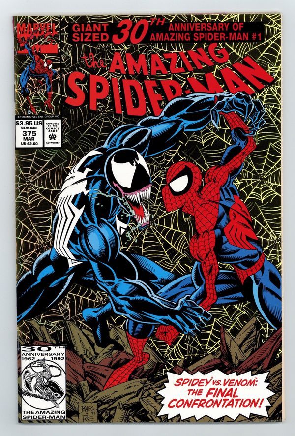 Tags: Marvel Legacy Numbering: Amazing Spider-Man (part 375), Print Run Statistics$24.00Direct Edition. 30th Anniversary issue of Amazing Spiderman #1. "The Bride of Venom" Part 2 of 2. Script by David Michelinie. Pencils by Mark Bagley. Inks by Randy Emberlin. Gold foil holografix cover by Mark Bagley and Randy Emberlin. Inside an abandoned Brooklyn amusement park, the Lethal Protector holds Richard and Mary Parker captive! The disturbed Venom thinks he's just doing what's best for Peter's parents! But that's not going to work! No way, no how! So, the wall-crawler heads to the park knowing a fierce fight awaits! However, the web-slinger may have help this time from a very unlikely source... Eddie Brock's ex-wife! Wow, will there be a family reunion atop the Ferris wheel? Or perhaps a funeral beneath it? One way or another, the Amazing Spider-Man and Venom battle for the last time! Cameo appearances by Silver Sable, Battlestar, Mary Jane Watson, and J. Jonah Jameson. Second story: "True Friends!" Script by Tom DeFalco. Pencils by Patrick Olliffee. Inks by Mark McKenna. Aware of what the Human Torch did to Empire State University, Spider-Man vows to bring his friend to justice. Cameo appearance by Silver Sable. Plot crosses over with Fantastic Four 373 & 374. Third story: "The Monster Within" Script by Eric Fein. Art by Dan Panosian. JJJ tries to get his son, John Jameson, started in the field of journalism. Fourth story: "Echoes..." Script by Terry Kavanagh. Pencils by Aaron Lopresti. Inks by Don Hudson. The Chameleon visits the grave of Kraven the Hunter. (Notes: Venom appears next in the first issue of his Lethal Protector (1993) series. The letters page includes a statement of ownership: average print run 660,958. average paid circulation 544,900.) 68 pages. Cover price $3.95.