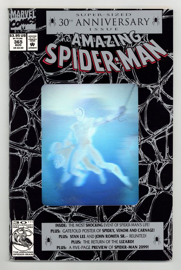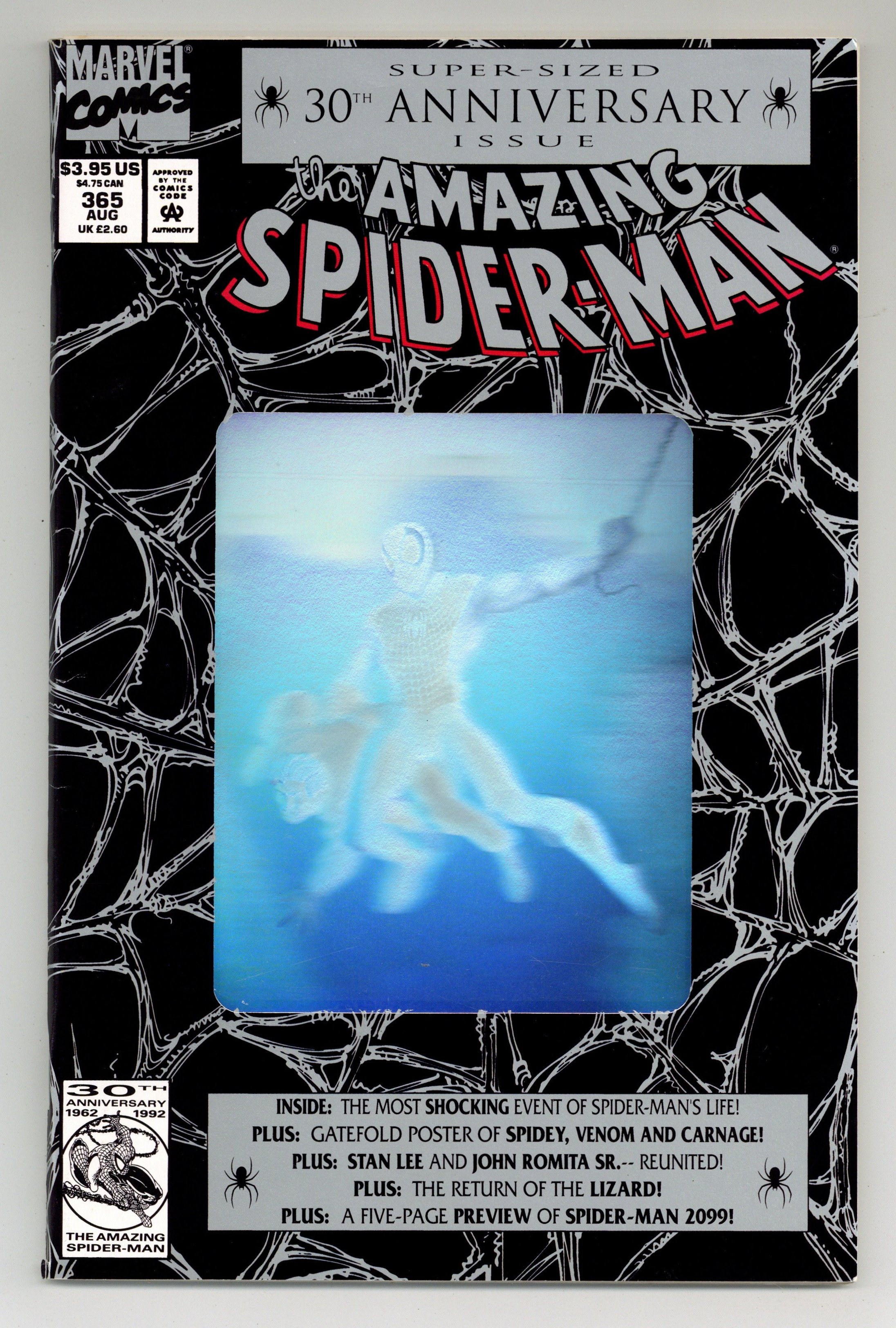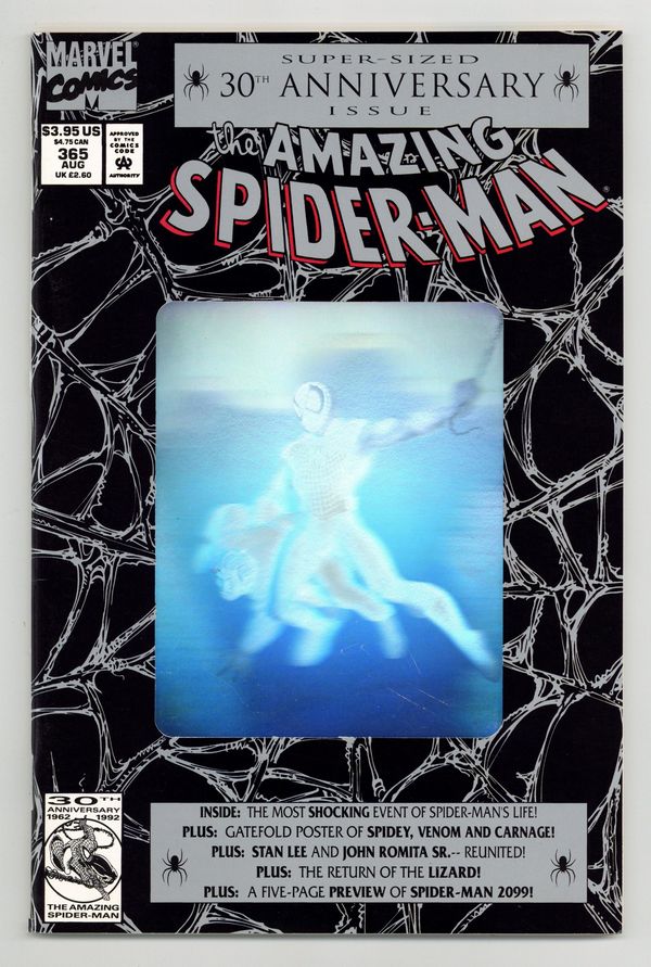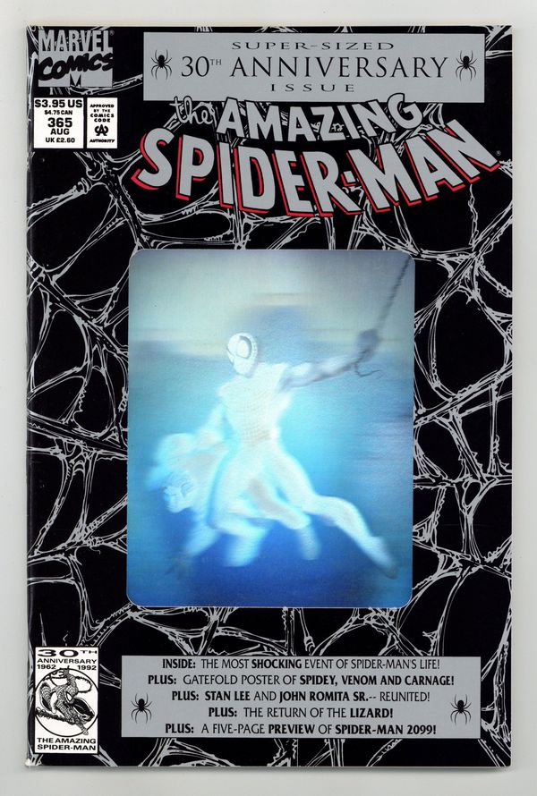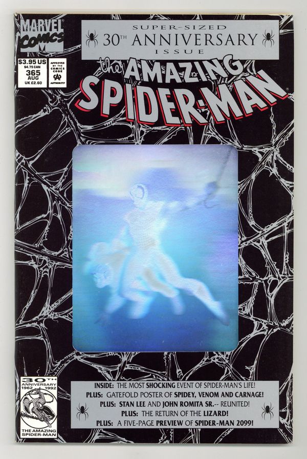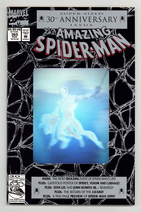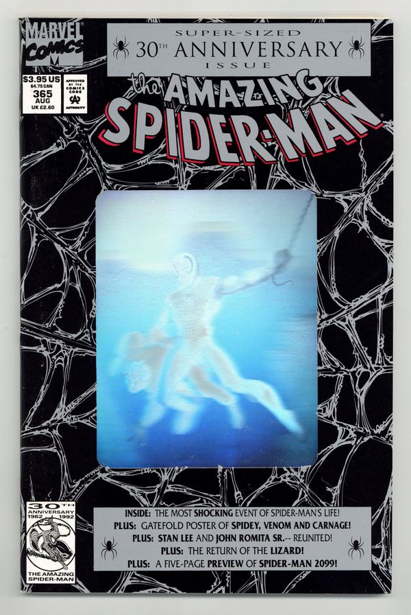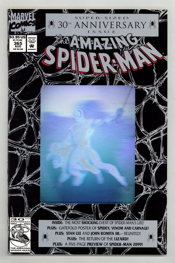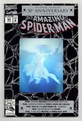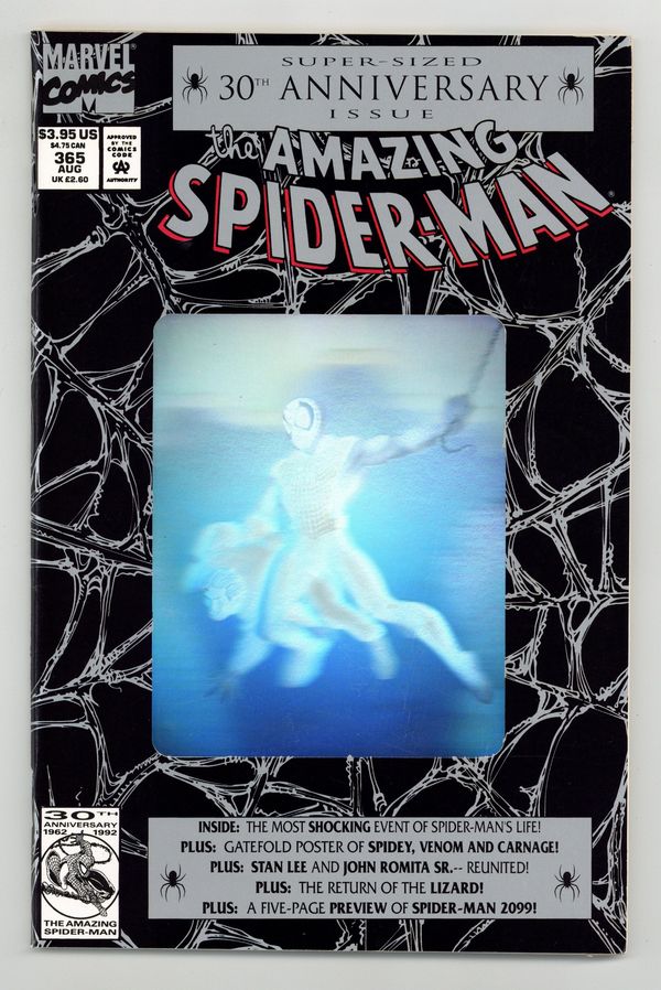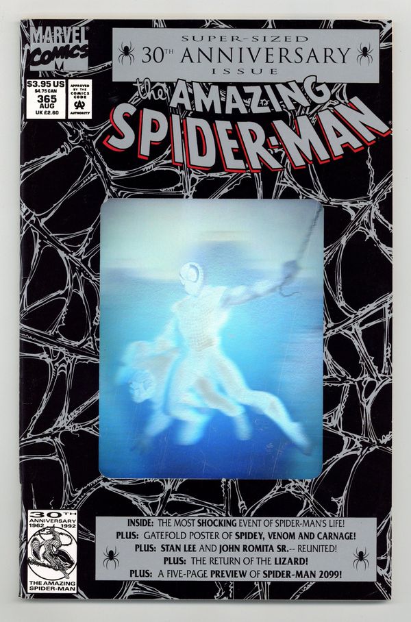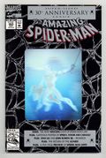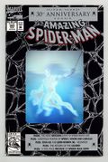Direct Edition. 80-page giant 30th Anniversary issue, with the first appearance of Spider-Man 2099! The Lizard returns in "Fathers and Sins." Script by David Michelinie, pencils by Mark Bagley, inks by Randy Emberlin. J. Jonah Jameson is featured in "How I Created Spider-Man!" Script by David Michelinie, art by Aaron Lopresti. Gwen Stacy takes center stage in "I Remember Gwen." Script by Stan Lee, plot by Tom DeFalco, art by John Romita Sr. (Cameos by the Green Goblin and Doctor Octopus.) The Prowler is also here in "A Friend in Need." Script by Tom DeFalco, pencils by Tod Smith, inks by Andrew Pepoy. There are also two text pieces, "The Saga of Spidey's Parents" by Stan Lee, and "Spider-Man: The First Thirty Years" by Peter Sanderson. Spider-Man 2099 gets a sneak preview, with a script by Peter David, pencils by Rick Leonardi, and inks by Al Williamson. This issue was originally released with a fold-out poster of Spidey versus Venom and Carnage (poster may be missing in lower grades). 84 pgs. Cover price $3.95.