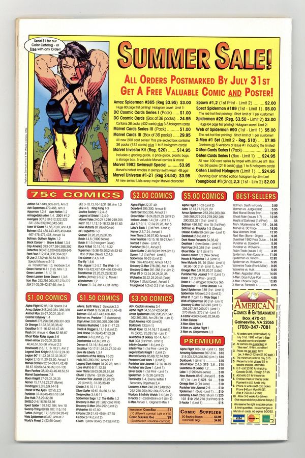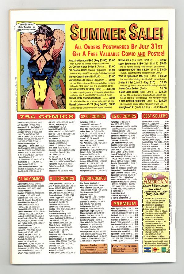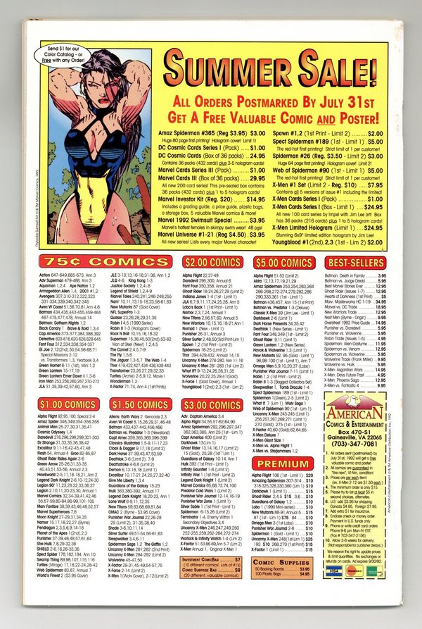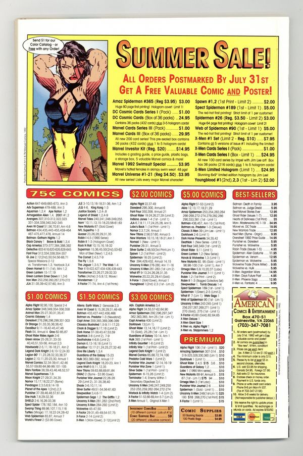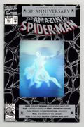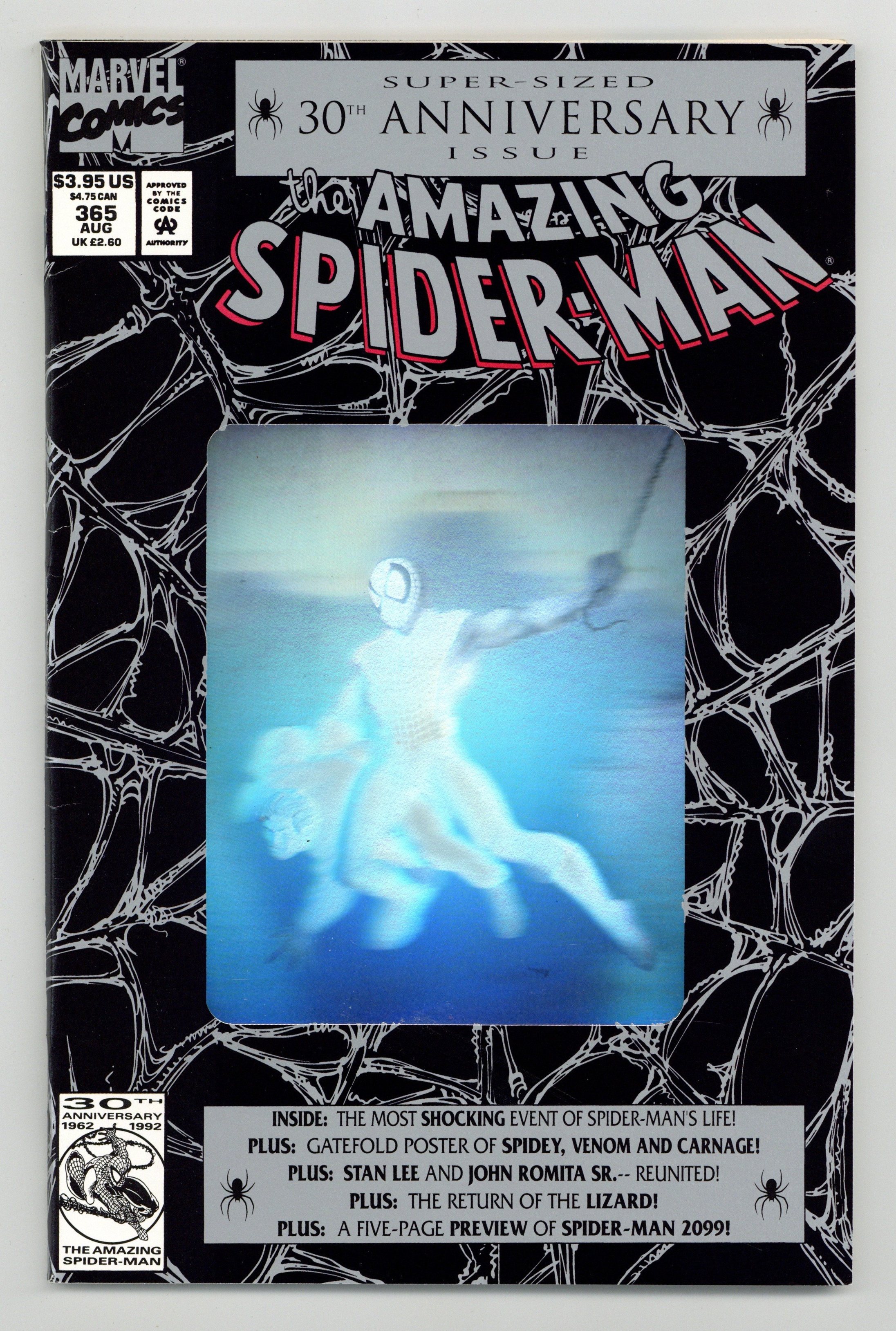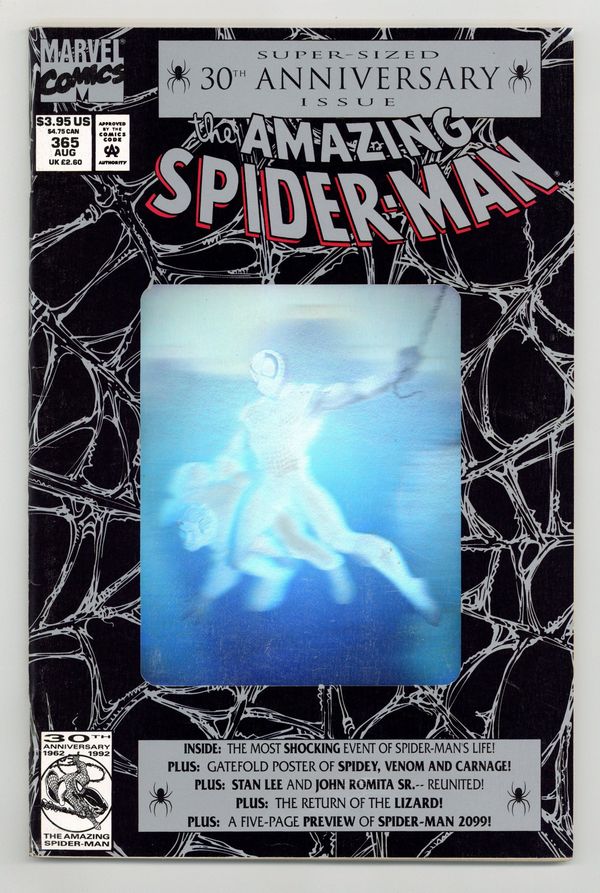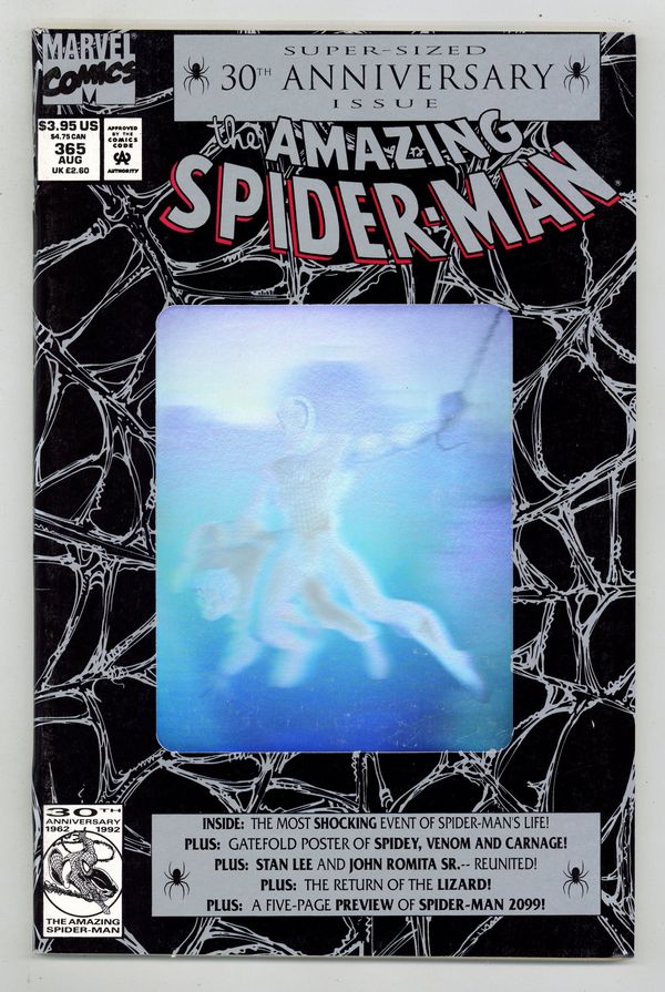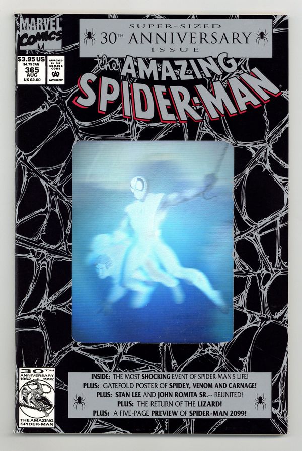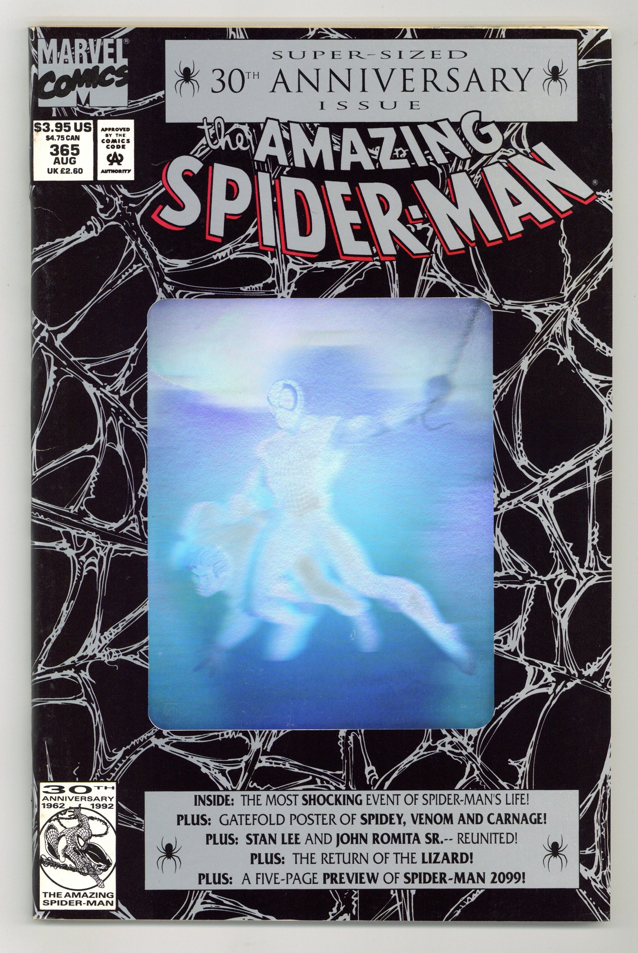 Direct Edition. 80-page giant 30th Anniversary issue, with the first appearance of Spider-Man 2099! The Lizard returns in "Fathers and Sins." Script by David Michelinie, pencils by Mark Bagley, inks by Randy Emberlin. J. Jonah Jameson is featured in "How I Created Spider-Man!" Script by David Michelinie, art by Aaron Lopresti. Gwen Stacy takes center stage in "I Remember Gwen." Script by Stan Lee, plot by Tom DeFalco, art by John Romita Sr. (Cameos by the Green Goblin and Doctor Octopus.) The Prowler is also here in "A Friend in Need." Script by Tom DeFalco, pencils by Tod Smith, inks by Andrew Pepoy. There are also two text pieces, "The Saga of Spidey's Parents" by Stan Lee, and "Spider-Man: The First Thirty Years" by Peter Sanderson. Spider-Man 2099 gets a sneak preview, with a script by Peter David, pencils by Rick Leonardi, and inks by Al Williamson. This issue was originally released with a fold-out poster of Spidey versus Venom and Carnage (poster may be missing in lower grades). 84 pgs. Cover price $3.95.