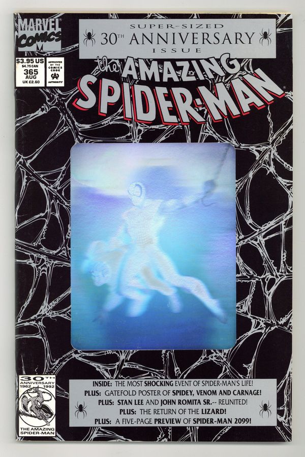 Starts Dec 15 Direct Edition. 80-page giant 30th Anniversary issue, with the first appearance of Spider-Man 2099! The Lizard returns in "Fathers and Sins." Script by David Michelinie, pencils by Mark Bagley, inks by Randy Emberlin. J. Jonah Jameson is featured in "How I Created Spider-Man!" Script by David Michelinie, art by Aaron Lopresti. Gwen Stacy takes center stage in "I Remember Gwen." Script by Stan Lee, plot by Tom DeFalco, art by John Romita Sr. (Cameos by the Green Goblin and Doctor Octopus.) The Prowler is also here in "A Friend in Need." Script by Tom DeFalco, pencils by Tod Smith, inks by Andrew Pepoy. There are also two text pieces, "The Saga of Spidey's Parents" by Stan Lee, and "Spider-Man: The First Thirty Years" by Peter Sanderson. Spider-Man 2099 gets a sneak preview, with a script by Peter David, pencils by Rick Leonardi, and inks by Al Williamson. This issue was originally released with a fold-out poster of Spidey versus Venom and Carnage (poster may be missing in lower grades). 84 pgs. Cover price $3.95.