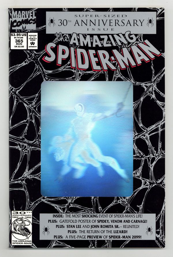 Starts Jan 26 Direct Edition. 80-page giant 30th Anniversary issue, with the first appearance of Spider-Man 2099! The Lizard returns in "Fathers and Sins." Script by David Michelinie, pencils by Mark Bagley, inks by Randy Emberlin. J. Jonah Jameson is featured in "How I Created Spider-Man!" Script by David Michelinie, art by Aaron Lopresti. Gwen Stacy takes center stage in "I Remember Gwen." Script by Stan Lee, plot by Tom DeFalco, art by John Romita Sr. (Cameos by the Green Goblin and Doctor Octopus.) The Prowler is also here in "A Friend in Need." Script by Tom DeFalco, pencils by Tod Smith, inks by Andrew Pepoy. There are also two text pieces, "The Saga of Spidey's Parents" by Stan Lee, and "Spider-Man: The First Thirty Years" by Peter Sanderson. Spider-Man 2099 gets a sneak preview, with a script by Peter David, pencils by Rick Leonardi, and inks by Al Williamson. This issue was originally released with a fold-out poster of Spidey versus Venom and Carnage (poster may be missing in lower grades). 84 pgs. Cover price $3.95.