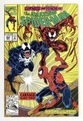 First Printing. Direct Edition. "Savage Alliance!" Part 2 of 3. Guest-starring the Human Torch. Script by David Michelinie. Pencils by Mark Bagley. Inks by Randy Emberlin. Cover by Mark Bagley and Randy Emberlin. After getting a taste of Carnage's raw power last issue, the wall-crawler knows he needs serious help! To that end the amazing one does the unthinkable! He pays a visit to Venom! Wow, is that a good idea? However as a precaution the web-slinger brings Johnny Storm along for the ride to Venom's deserted island! And following an intense battle, Venom surprisingly agrees to help his good pal Spidey! So in a truly unlikely pairing, the Spectacular Spider-Man and the Lethal Protector join forces to take down Carnage! You have to see it to believe it! Cameo appearance by J. Jonah Jameson. (Note: The issue includes a full-page ad for the Toxic Crusaders (1992) series with art by Sam Kieth.) 36 pages. $1.25 cover price. Cover price $1.25.