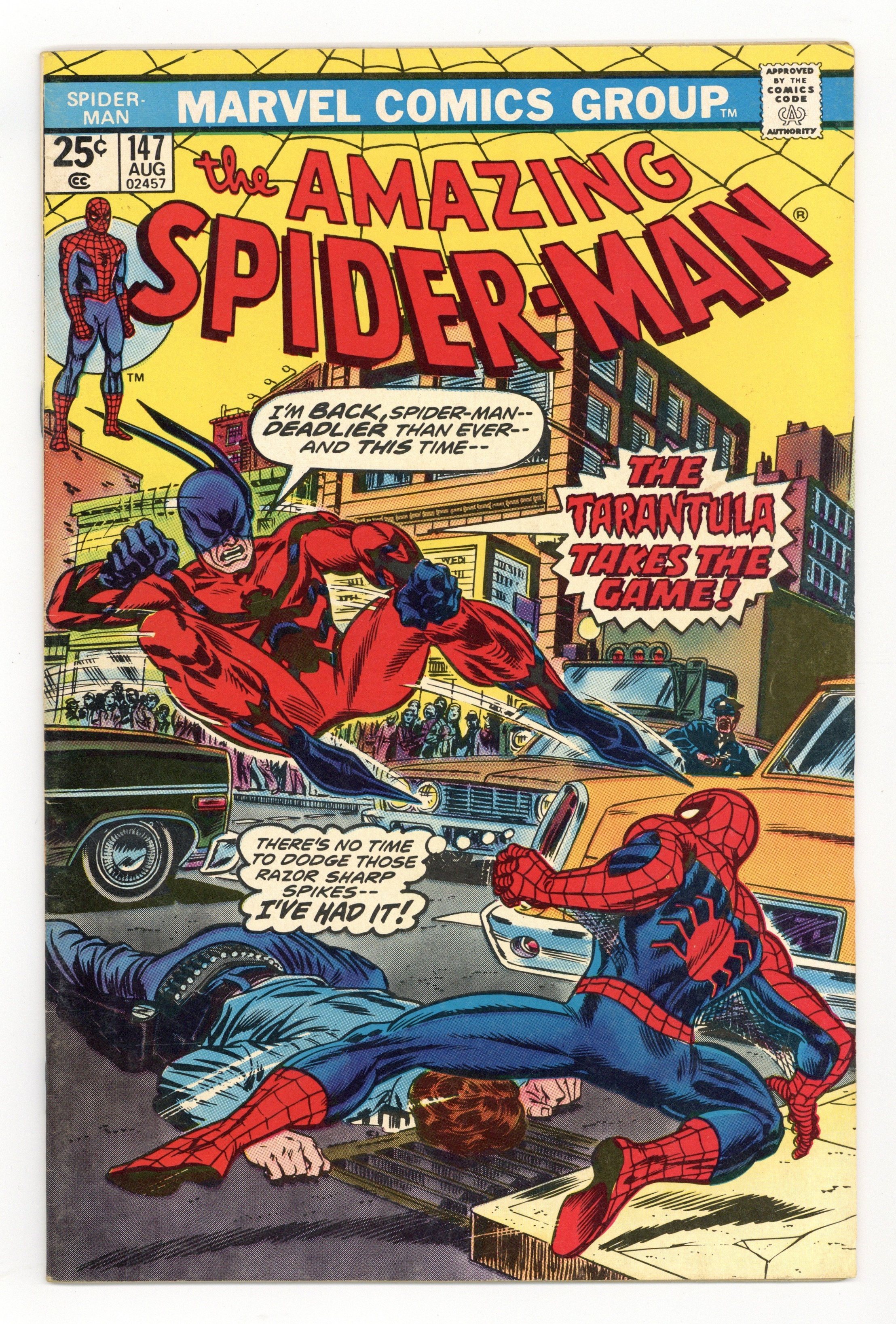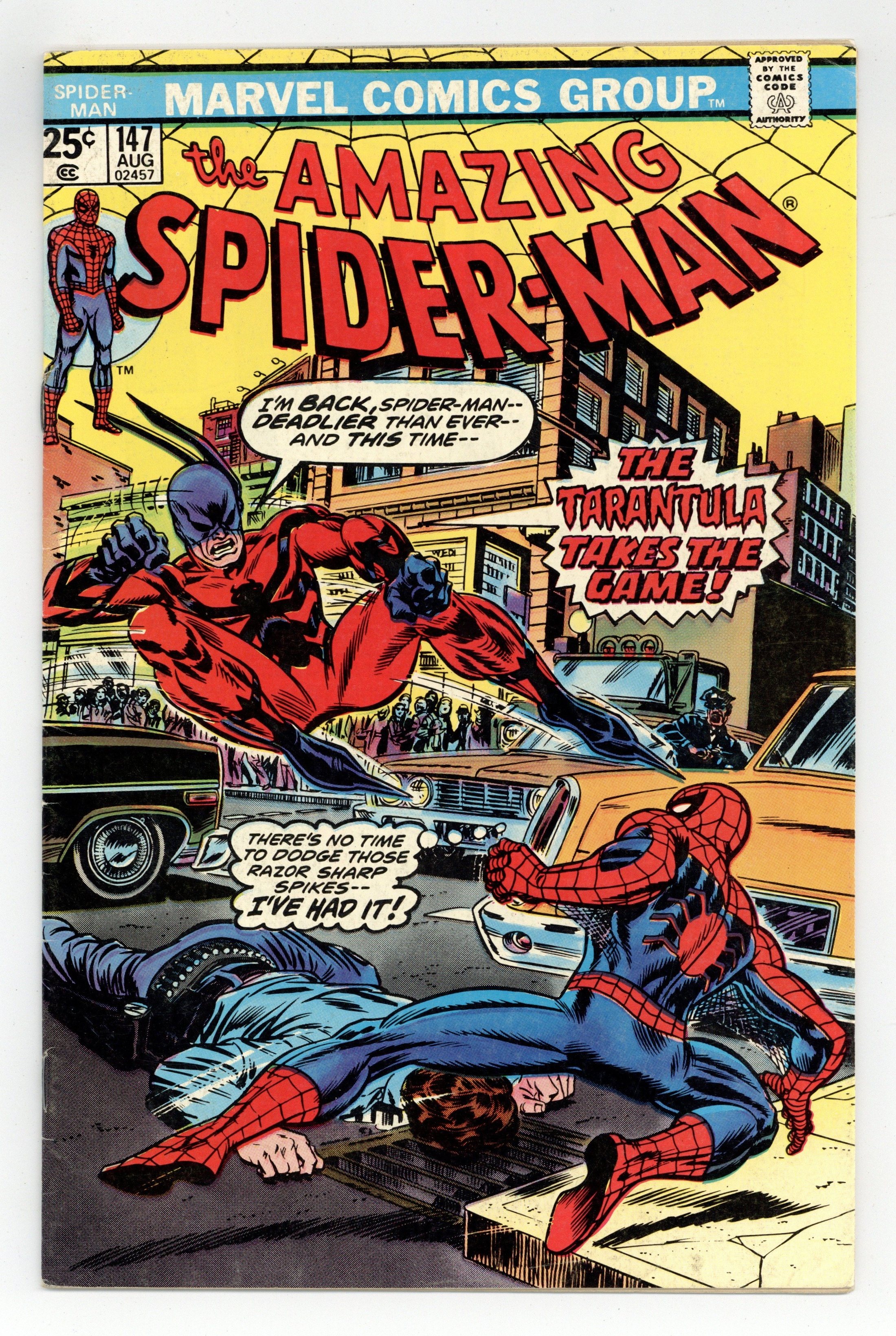 Tags: Marvel Legacy Numbering: Amazing Spider-Man (part 147), Spider-Man Clone Saga (part 00H)$16.00"The Tarantula is a Very Deadly Beast!" Script by Gerry Conway. Pencils by Ross Andru. Inks by Mike Esposito and Dave Hunt (backgrounds). Cover by John Romita Sr. Following his adventure in the Everglades (in Giant-Size Spider-Man 5), the wondrous wall-crawler returns to New York City! However everything is just as chaotic as when he left, thanks to the Gwen Stacy clone...and the Tarantula! The South American super-villain ambushes the spectacular one on the streets of Manhattan! And after a short skirmish, the Tarantula throws the web-slinger into a city bus! But this is no ordinary bus! For the driver is the Jackal...and the only passenger is Gwen Stacy! As for the bus' destination? Try the Brooklyn Bridge! Oh no, are the sins of the past coming back to haunt your friendly neighborhood Spider-Man? Cameo appearances by Mary Jane Watson, Ned Leeds, Aunt May, Anna Watson, and J. Jonah Jameson. Flashback cameo by Ben Parker. (Note: The Tarantula previously appeared in Amazing Spider-Man 135. The letters page includes Marvel Value Stamp series A #42 Man-Wolf by Gil Kane and Mike Esposito. This story was reprinted in Marvel Tales 124.) 36 pages. 25c cover price. Cover price $0.25.