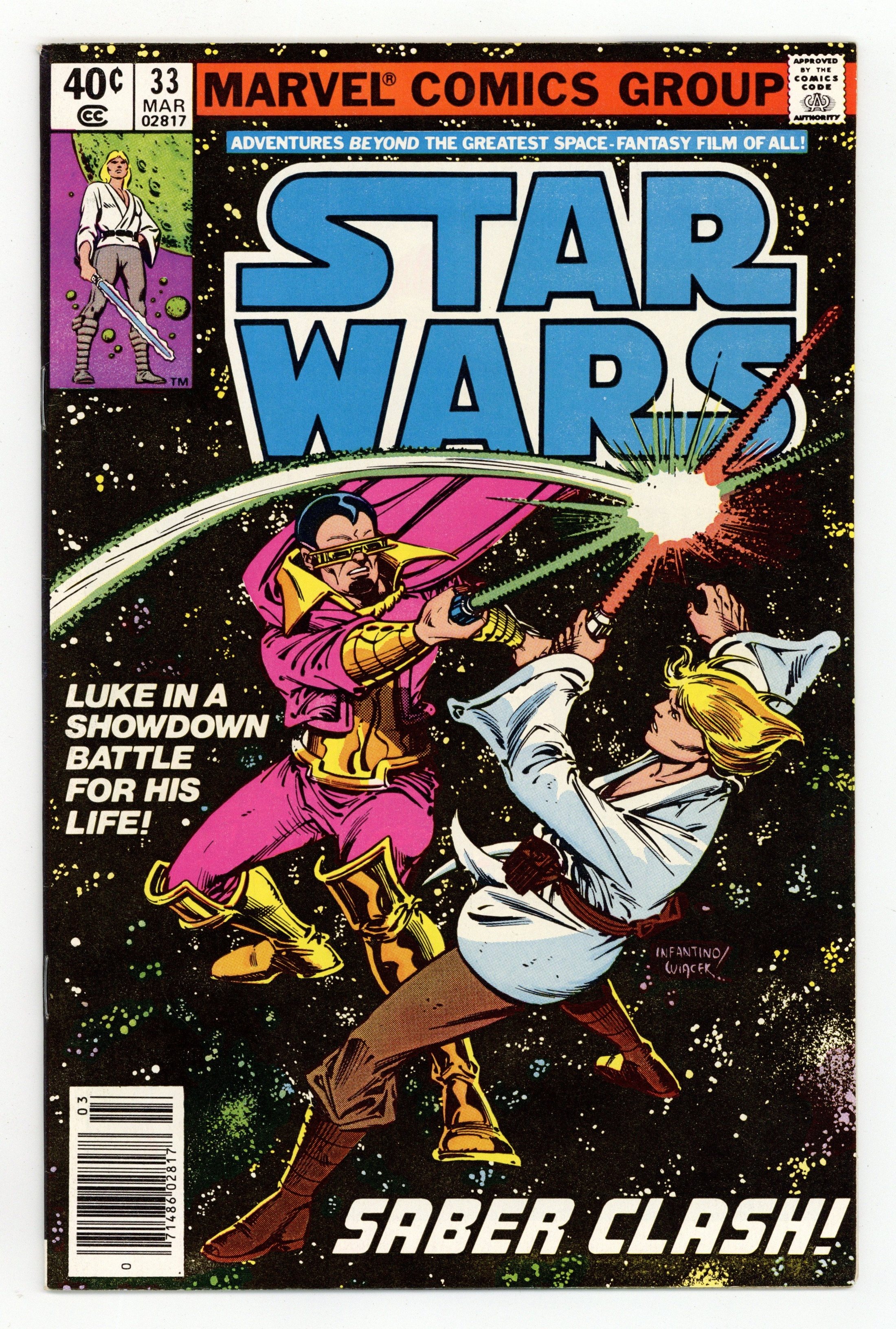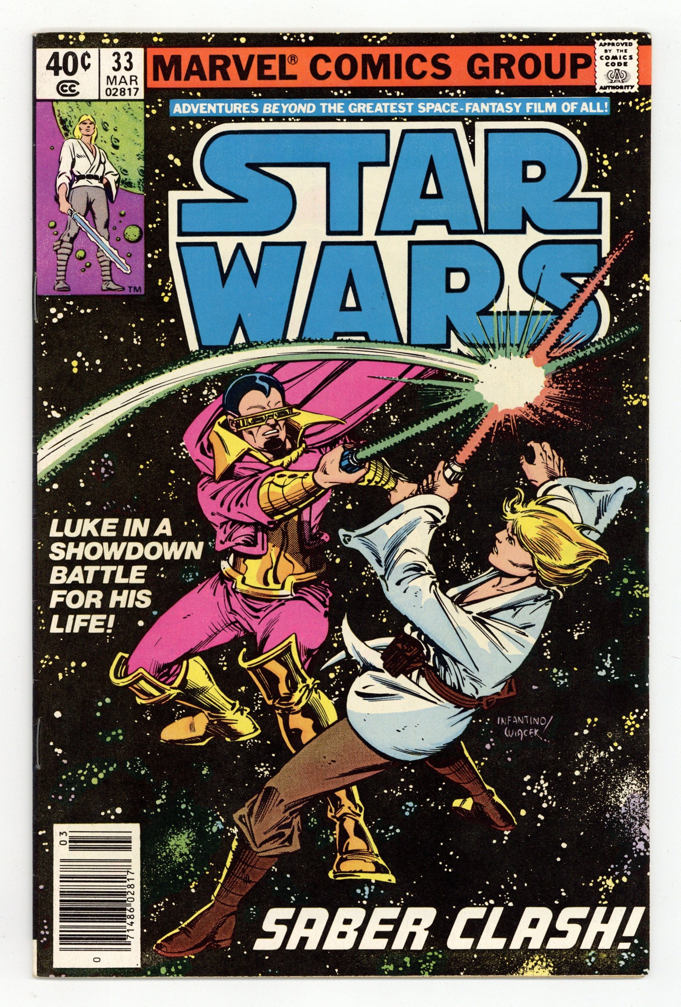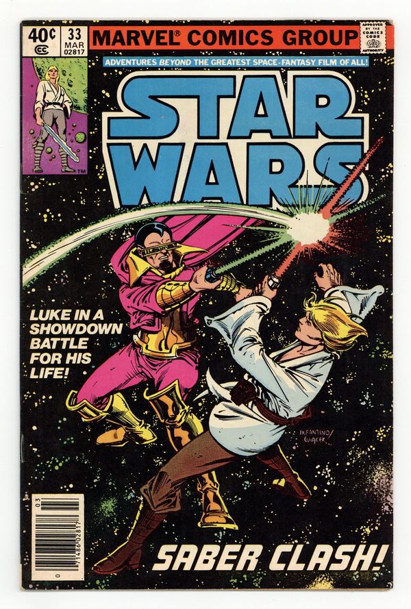 Newsstand Edition. "Sabre Clash!" Written by Archie Goodwin. Art by Carmine Infantino and Gene Day. Before his fateful lightsabre-duel with Darth Vader in The Empire Strikes Back, Luke Skywalker first faced the deadly sabre of Baron Orman! Cover price $0.40.