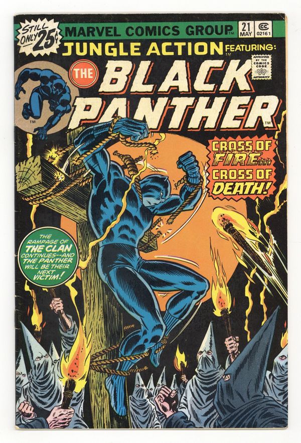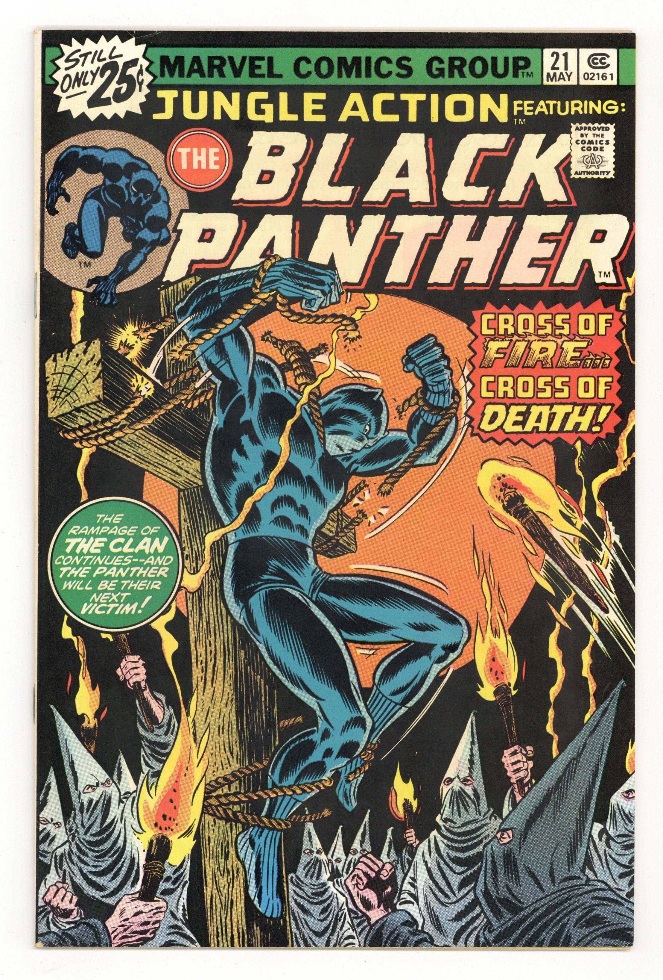 Cover pencils by Rich Buckler, inks by John Romita. The Black Panther stars in the Panther versus the Klan part 3, "A Cross Burning Darkly, Blackening the Night, script by Don McGregor, pencils by Billy Graham, inks by Bob McLeod; Sherrif Tate gives the details of Angela's death; The Panther interrupts a Klan rally. Letter from comics creator Mark Gasper. Marvel Value Stamp. 36 pgs., full color. Cover price $0.25.