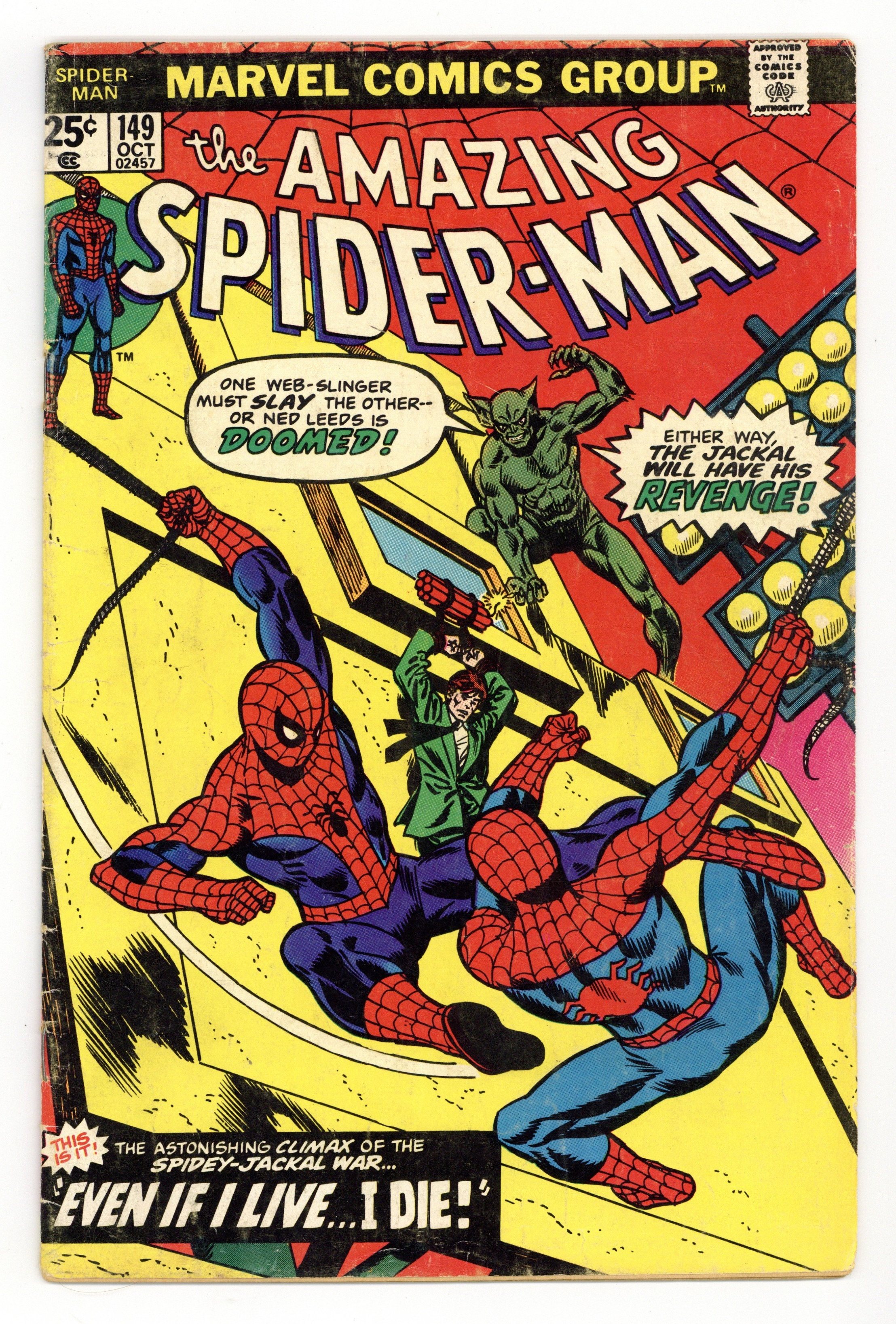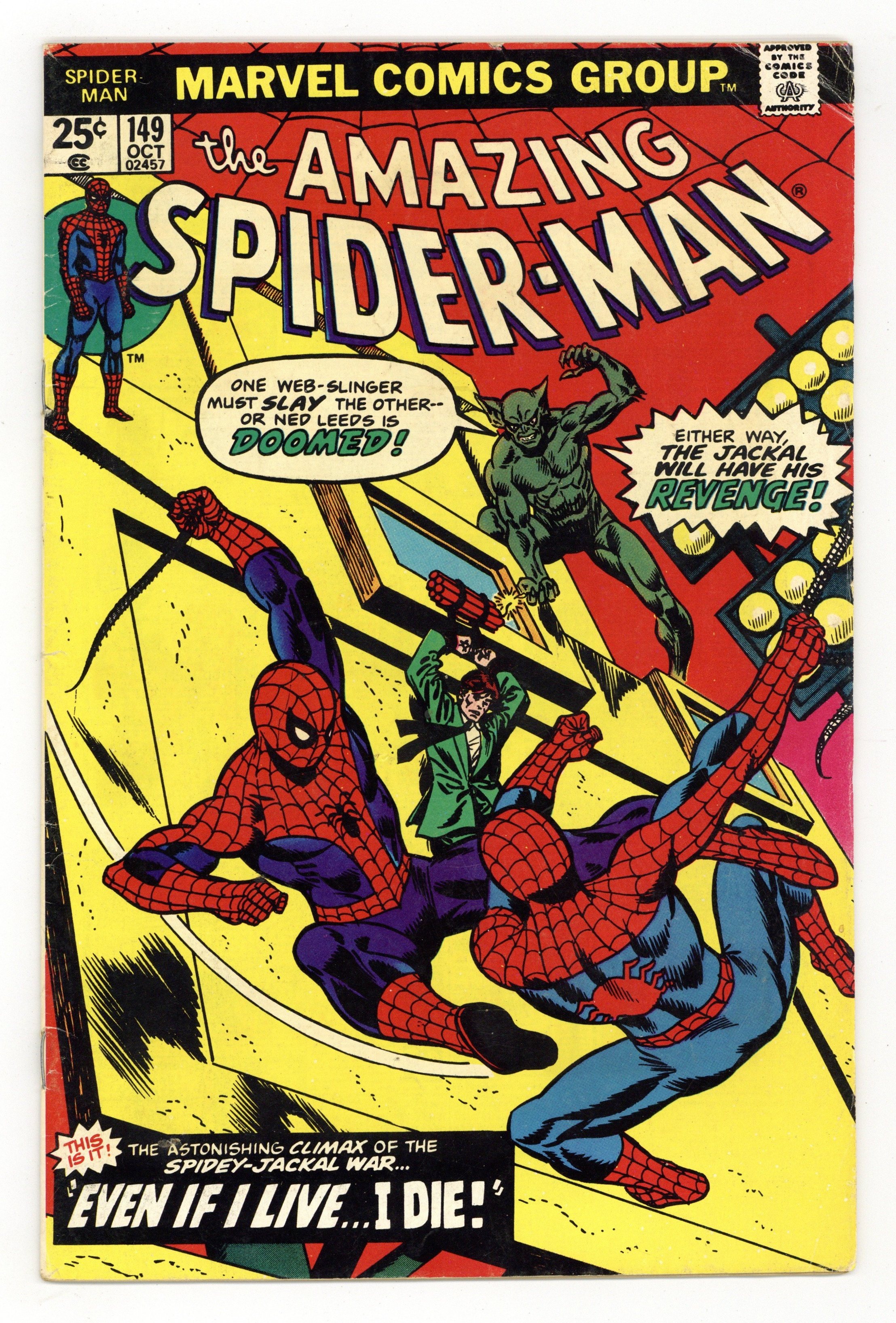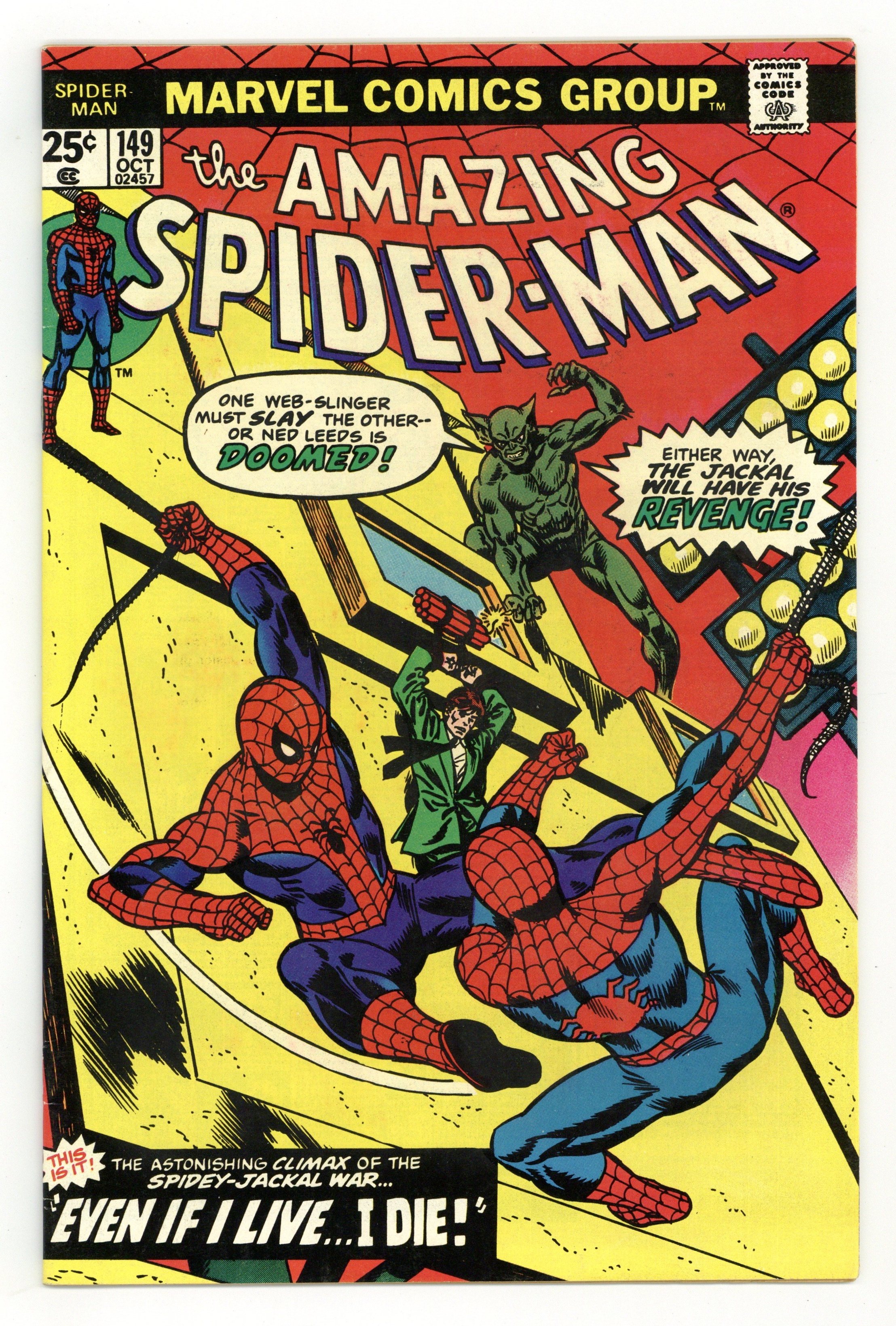 Tags: Marvel Legacy Numbering: Amazing Spider-Man (part 149), Spider-Man Clone Saga (part 00J)$37.50First appearance of the Spider-Man Clone in "Even If I Live, I Die!" Script by Gerry Conway. Pencils by Ross Andru. Inks by Mike Esposito and Dave Hunt (backgrounds). Cover by Gil Kane and Frank Giacoia. One of the classic web-slinger issues of the bronze age! At Shea Stadium in Queens, the master plan of the Jackal finally comes together! On the infield grass, the Amazing Spider-Man fights to the finish against a carbon copy of himself - the Spider-Clone! With Ned Leeds in mortal danger, can the wondrous wall-crawler triumph over his clone and the Jackal too? But even if he wins, your friendly neighborhood Spider-Man may still lose Gwen once again. An emotional ending for all. Origins of the Jackal and the Gwen Stacy clone. Apparent deaths of the Jackal and the Spider-Clone. Cameo appearances by Joe Robertson, J. Jonah Jameson, Betty Brant, Mary Jane Watson, and the Tarantula. Flashback cameos by Anthony Serba and Gwen Stacy. (Note: The Gwen Stacy clone returns many years later in Spectacular Spider-Man Annual 8. The next story arc relating to the clone saga takes place in Spectacular Spider-Man (1st series) 25-31 - the introduction of Carrion, the clone of Professor Miles Warren. This issue completes Gerry Conway's unforgettable 3-year run as the writer of the Amazing Spider-Man title - highlighted by the death of Gwen Stacy; the creation of the Punisher; and the Spider-Clone saga. Many future stories proceeded from Gerry Conway's bronze age scripts. The full clone saga was reprinted in 2011 in the trade paperback: The Amazing Spider-Man - The Original Clone Saga. This story was reprinted in Marvel Tales 126.) 36 pages. 25c cover price. Cover price $0.25.