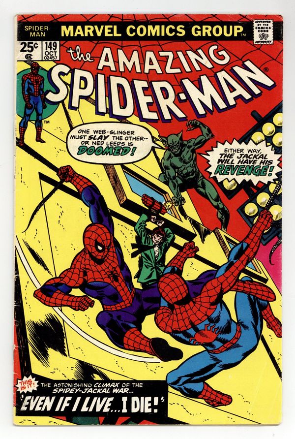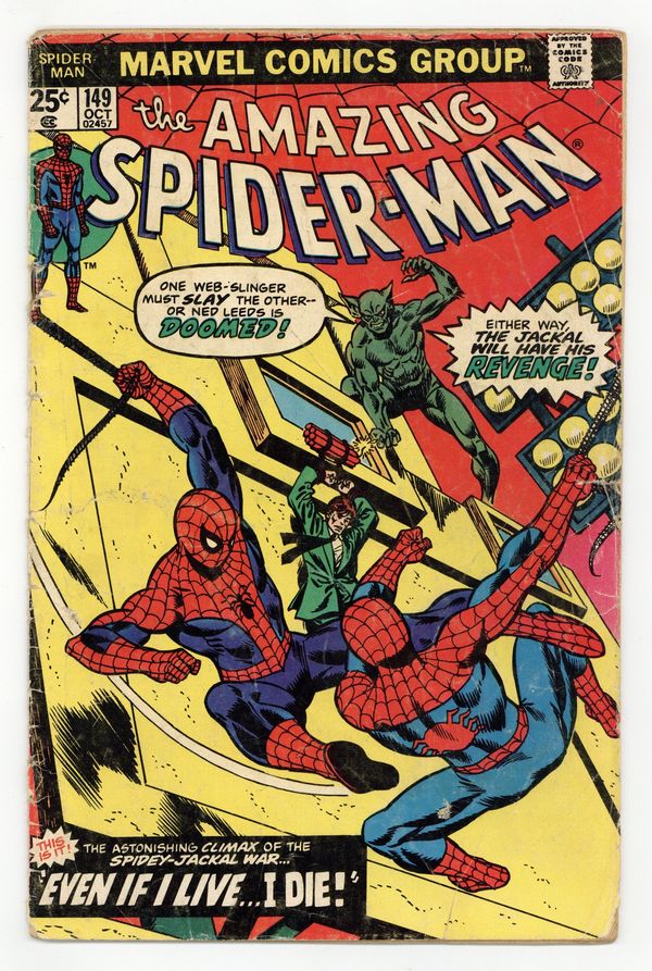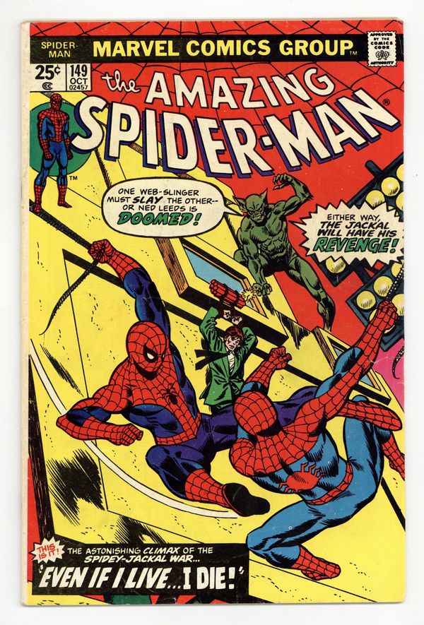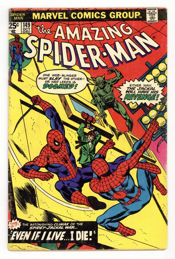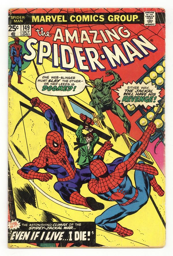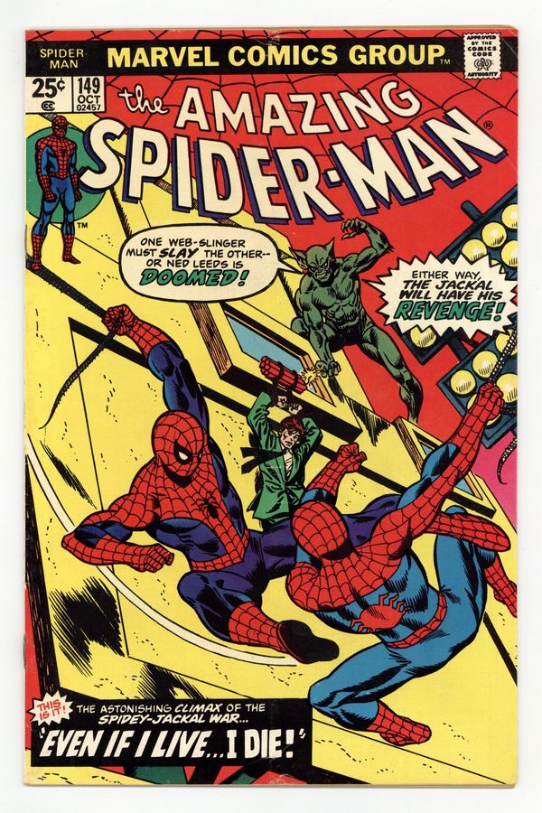 Tags: Marvel Legacy Numbering: Amazing Spider-Man (part 149), Spider-Man Clone Saga (part 00J)$37.50First appearance of the Spider-Man Clone in "Even If I Live, I Die!" Script by Gerry Conway. Pencils by Ross Andru. Inks by Mike Esposito and Dave Hunt (backgrounds). Cover by Gil Kane and Frank Giacoia. One of the classic web-slinger issues of the bronze age! At Shea Stadium in Queens, the master plan of the Jackal finally comes together! On the infield grass, the Amazing Spider-Man fights to the finish against a carbon copy of himself - the Spider-Clone! With Ned Leeds in mortal danger, can the wondrous wall-crawler triumph over his clone and the Jackal too? But even if he wins, your friendly neighborhood Spider-Man may still lose Gwen once again. An emotional ending for all. Origins of the Jackal and the Gwen Stacy clone. Apparent deaths of the Jackal and the Spider-Clone. Cameo appearances by Joe Robertson, J. Jonah Jameson, Betty Brant, Mary Jane Watson, and the Tarantula. Flashback cameos by Anthony Serba and Gwen Stacy. (Note: The Gwen Stacy clone returns many years later in Spectacular Spider-Man Annual 8. The next story arc relating to the clone saga takes place in Spectacular Spider-Man (1st series) 25-31 - the introduction of Carrion, the clone of Professor Miles Warren. This issue completes Gerry Conway's unforgettable 3-year run as the writer of the Amazing Spider-Man title - highlighted by the death of Gwen Stacy; the creation of the Punisher; and the Spider-Clone saga. Many future stories proceeded from Gerry Conway's bronze age scripts. The full clone saga was reprinted in 2011 in the trade paperback: The Amazing Spider-Man - The Original Clone Saga. This story was reprinted in Marvel Tales 126.) 36 pages. 25c cover price. Cover price $0.25.