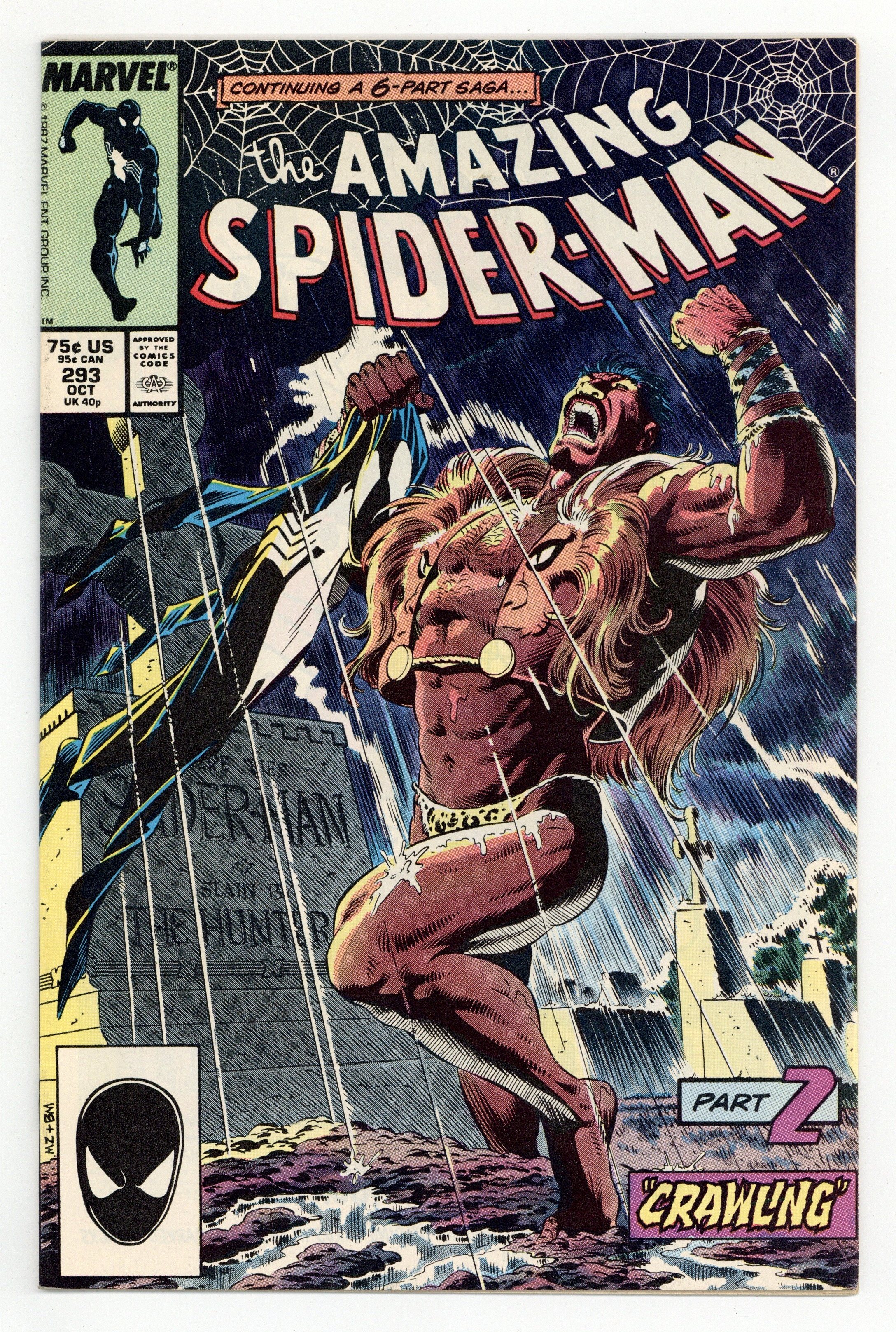 Tags: Marvel Legacy Numbering: Amazing Spider-Man (part 293), Spider-Man Kraven's Last Hunt (part 2)$16.75Direct Edition. Kraven's Last Hunt: Part 2 of 6 -- "Crawling" Script by J.M. DeMatteis. Pencils by Mike Zeck. Inks by Bob McLeod. Cover by Mike Zeck and Bob McLeod. Story continues from Web of Spider-Man 31. In a shocking development, Kraven the Hunter has buried the Amazing Spider-Man six feet under! And now the deranged hunter is wearing his own spider costume and fighting crime on the streets of New York City! Unbelievable! What in the world is going on?! That's what Mary Jane would like to know as she desperately searches for her newlywed husband! And to make matters worse, there's something horrific coming up from the sewers: Vermin! Story continues in Spectacular Spider-Man 131. (Note: Vermin previously appeared in Marvel Team-Up 128.) 36 pages. Cover price $0.75.
