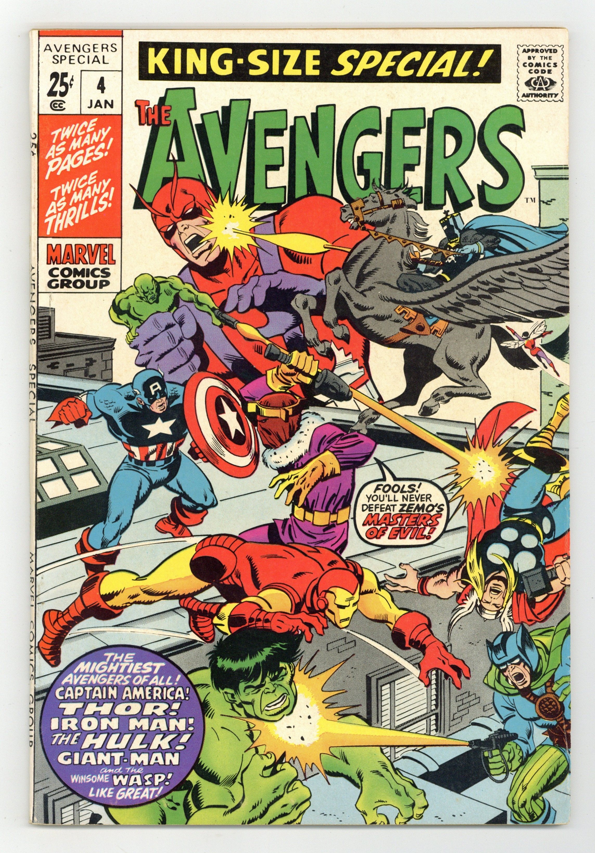 $16.00This annual features two reprint stories and a new cover by Sal Buscema. First story reprinted from Avengers (1st series) 5: "The Invasion of the Lava Men!" Script by Stan Lee. Pencils by Jack Kirby. Inks by Paul Reinman. The Avengers travel to the Southwestern United States to investigate mysterious underground tremors! Who's causing the subsurface vibrations? The Lava Men! And they want to conquer the surface world! But the Avengers stand in their way! Cameo appearance by the Hulk. Second story reprinted from Avengers (1st series) 6: "Masters of Evil" Script by Stan Lee. Pencils by Jack Kirby. Inks by Chic Stone. It's the first epic clash between the Masters of Evil and the mighty Avengers! Baron Zemo, the Melter, Black Knight, and Radioactive Man vs. Captain America, Iron Man, Thor, Giant-Man and the Wasp! (Notes: This annual includes an Avengers pin-up gallery featuring the covers of Avengers 1, 2, 3, 4, 5, and 6. This annual also contains full-page ads for X-Men Annual 1 & Amazing Spider-Man Annual 7 and Thor Annual 3 & Marvel's Greatest Comics 29.) 68 pgs. Cover price $0.25.