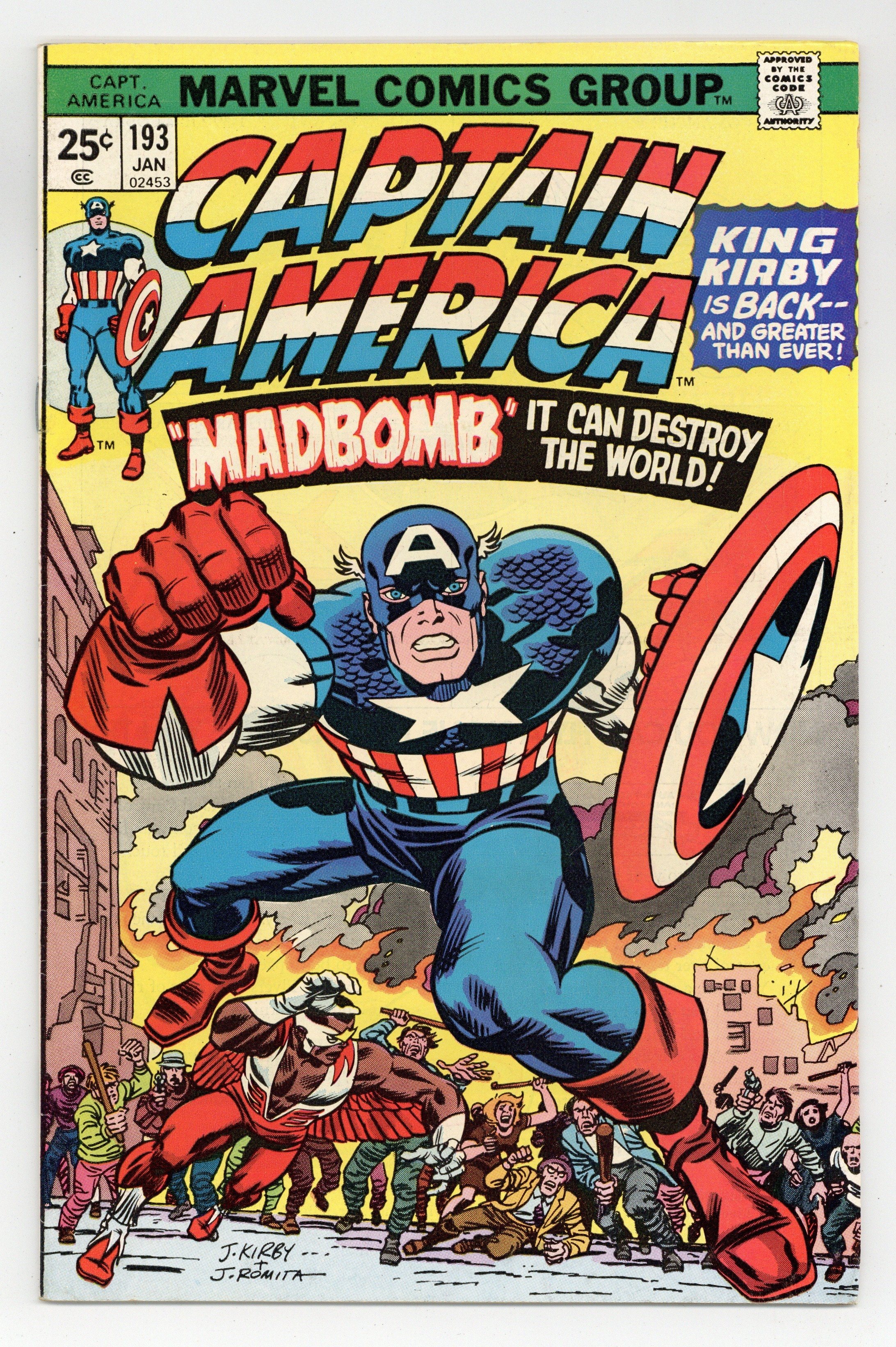 Starts Jan 3 "The Madbomb - Screamer in the Brain!" Part 1 of 8. Script by Jack Kirby. Pencils by Jack Kirby. Inks by Frank Giacoia and Mike Esposito. Cover by Jack Kirby and John Romita Sr. (inks). The King returns to Marvel as Jack Kirby takes the reins of the Captain America title for the U.S.A.'s bicentennial year! Steve Rogers and Sam Wilson are visiting Leila Taylor's apartment in the Bronx when they hear a ruckus outside! The people in the streets are going crazy and destroying everything in sight! What is happening? Cap immediately leaps into action and engages the insane rioters! After taking several blows, the shield-slinger spots a strange device in the alleyway. It's a small madbomb! But not the big Madbomb! Once order is restored a SHIELD agent takes the Sentinel of Liberty and his partner to a secret base to meet Secretary of State Henry Kissinger. Where the duo learns of the giant Madbomb and its incredible destructive power! Cap and the Falcon will begin hunting for its next issue! (Notes: This issue begins Jack Kirby's 2-year run as the writer and penciler of the Captain America series. The letters page includes a letter from comics publisher Dean Mullaney. The letters page also contains Marvel Value Stamp series B #1 (Spider-Man).) 36 pages. Cover price $0.25.