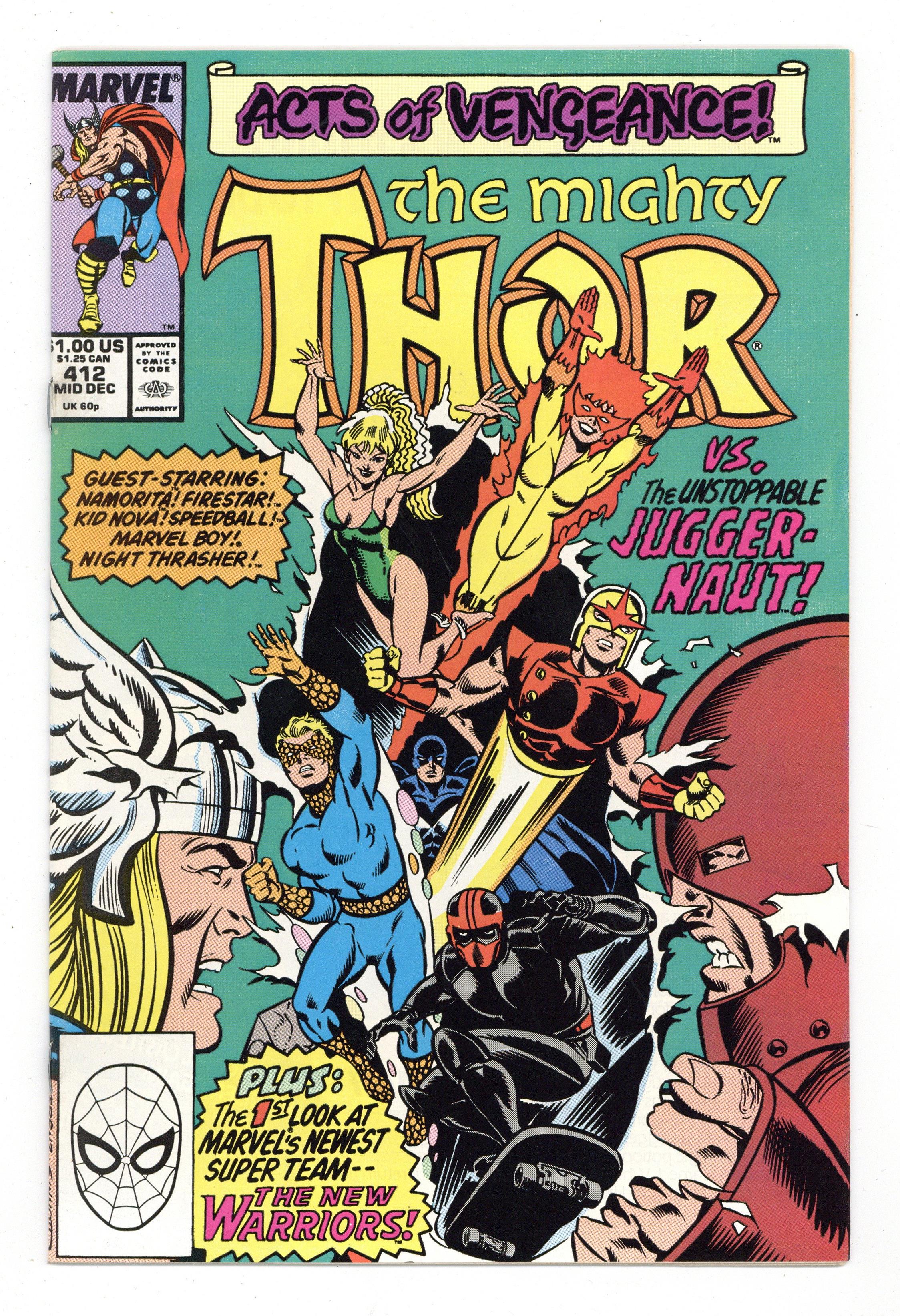 Tags: Acts of Vengeance (part 34), Marvel Legacy Numbering: Thor (part 412), Beta Ray Bill, Juggernaut, Namorita, Thor$12.00Direct Edition. Cover pencils by Ron Frenz, inks by Joe Sinnott. Acts of Vengeance crossover. First full appearance of the New Warriors in "Introducing the New Warriors," script by Ron Frenz (Co-plot) and Tom DeFalco, pencils by Ron Frenz (layouts), inks by Joe Sinnott (finished art); With Thor down for the count, the New Warriors arrive and battle the Juggernaut; Thor recovers his strength and joins the fray as he and the kids are finally able to banish Juggy to another dimension. Beta Ray Bill back-up, "Freedom Is Only A Choice Away," script by Tom DeFalco, pencils by Ron Lim, inks by Mike DeCarlo; Bill has been trapped and is being used to help power a spaceship that feeds off of psychic energy; When the people of his race are threatened, however, he breaks free and faces Captain Orack. 36 pgs., full color. $1.00. Cover price $1.00.