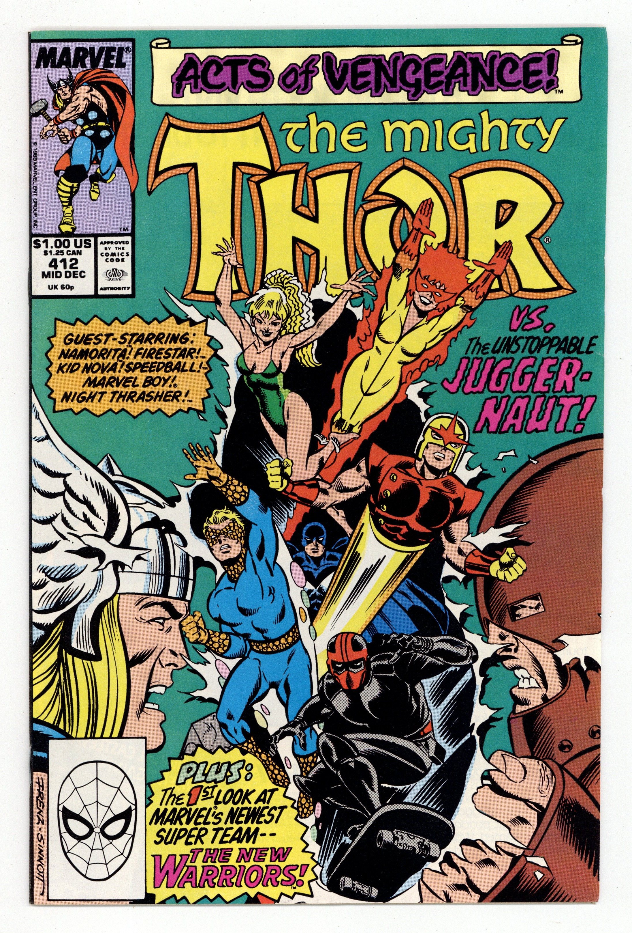 Direct Edition. Cover pencils by Ron Frenz, inks by Joe Sinnott. Acts of Vengeance crossover. First full appearance of the New Warriors in "Introducing the New Warriors," script by Ron Frenz (Co-plot) and Tom DeFalco, pencils by Ron Frenz (layouts), inks by Joe Sinnott (finished art); With Thor down for the count, the New Warriors arrive and battle the Juggernaut; Thor recovers his strength and joins the fray as he and the kids are finally able to banish Juggy to another dimension. Beta Ray Bill back-up, "Freedom Is Only A Choice Away," script by Tom DeFalco, pencils by Ron Lim, inks by Mike DeCarlo; Bill has been trapped and is being used to help power a spaceship that feeds off of psychic energy; When the people of his race are threatened, however, he breaks free and faces Captain Orack. 36 pgs., full color. $1.00. Cover price $1.00.