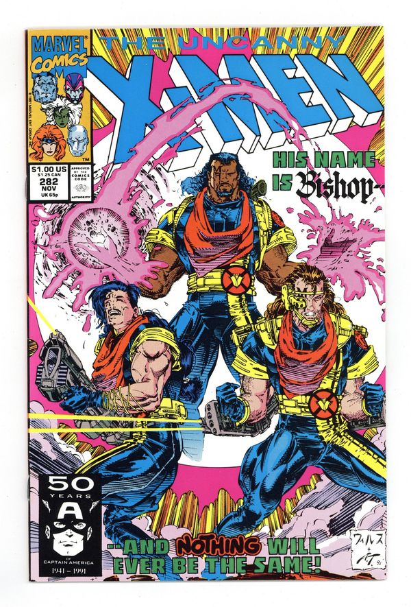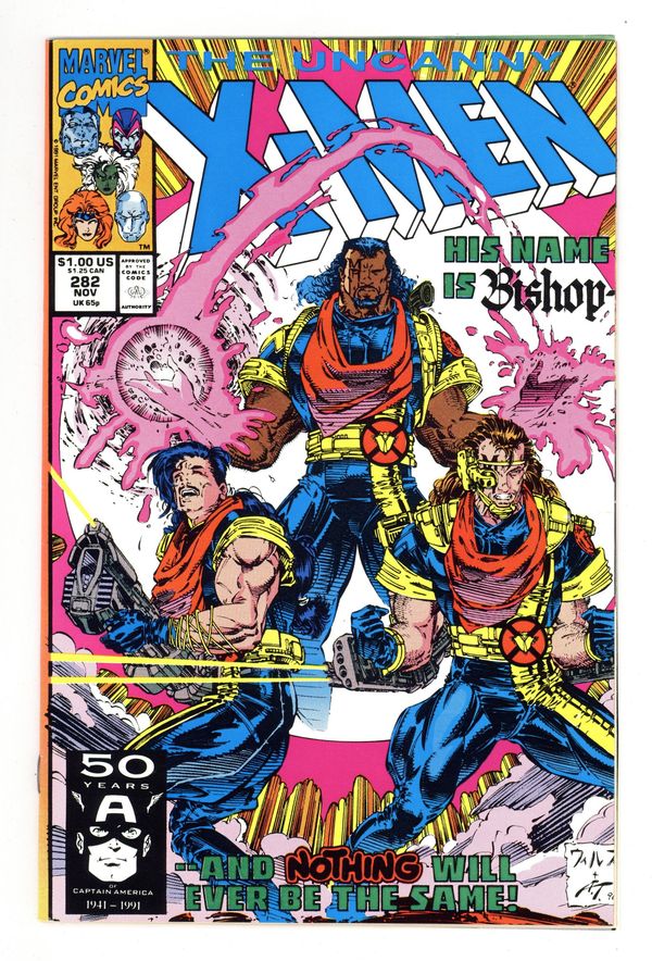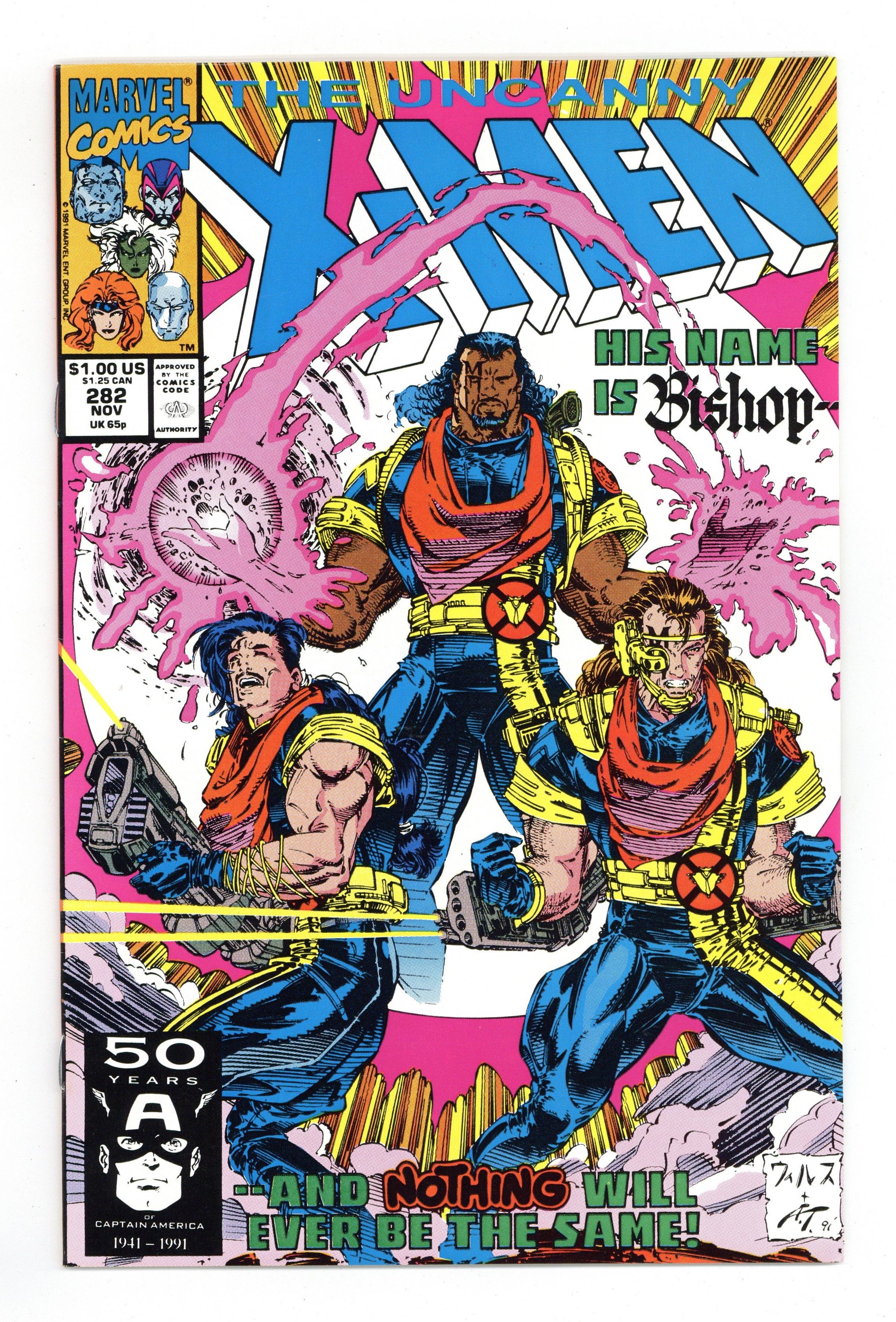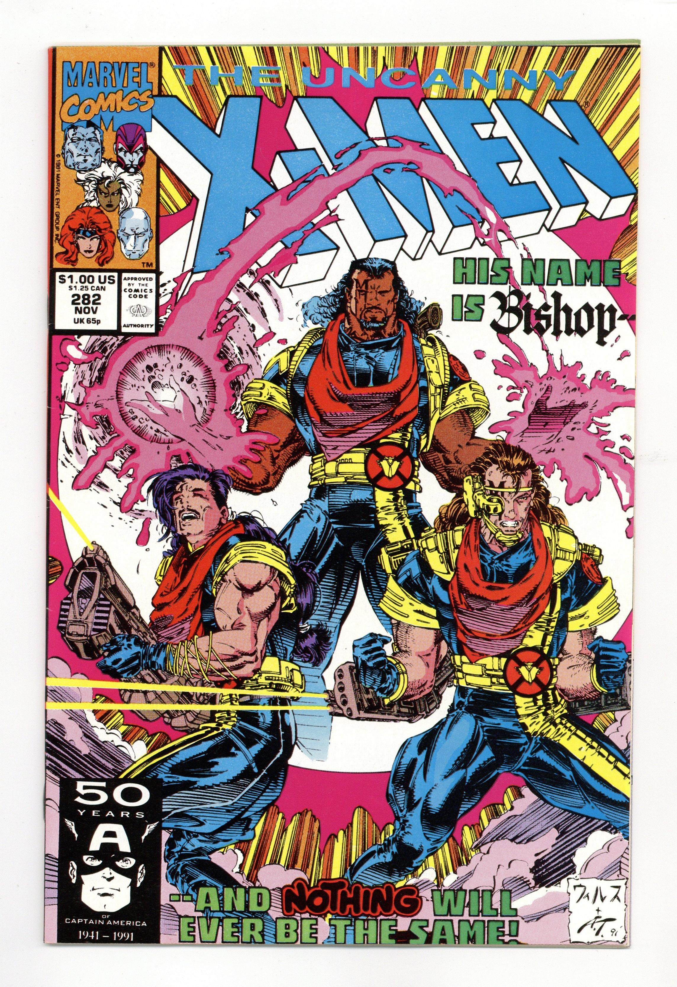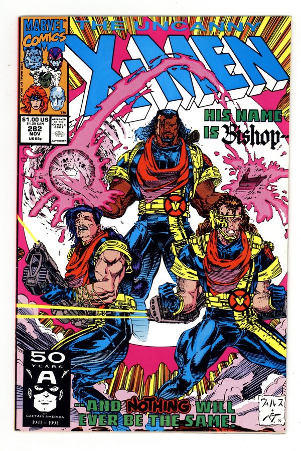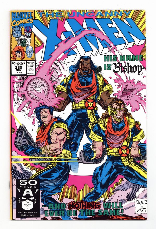 Direct Edition. "Payback!" Story by Whilce Portacio and John Byrne. Art by Whilce Portacio and Art Thibert. In one fell swoop the Upstarts have destroyed the Reavers and crippled the Hellfire Club. Next up, the Mutant Liberation Front. Who can stop these powerful new foes? Enter: Bishop! NOTE: 1st appearance of Bishop. 40 pgs. Cover price $1.00.