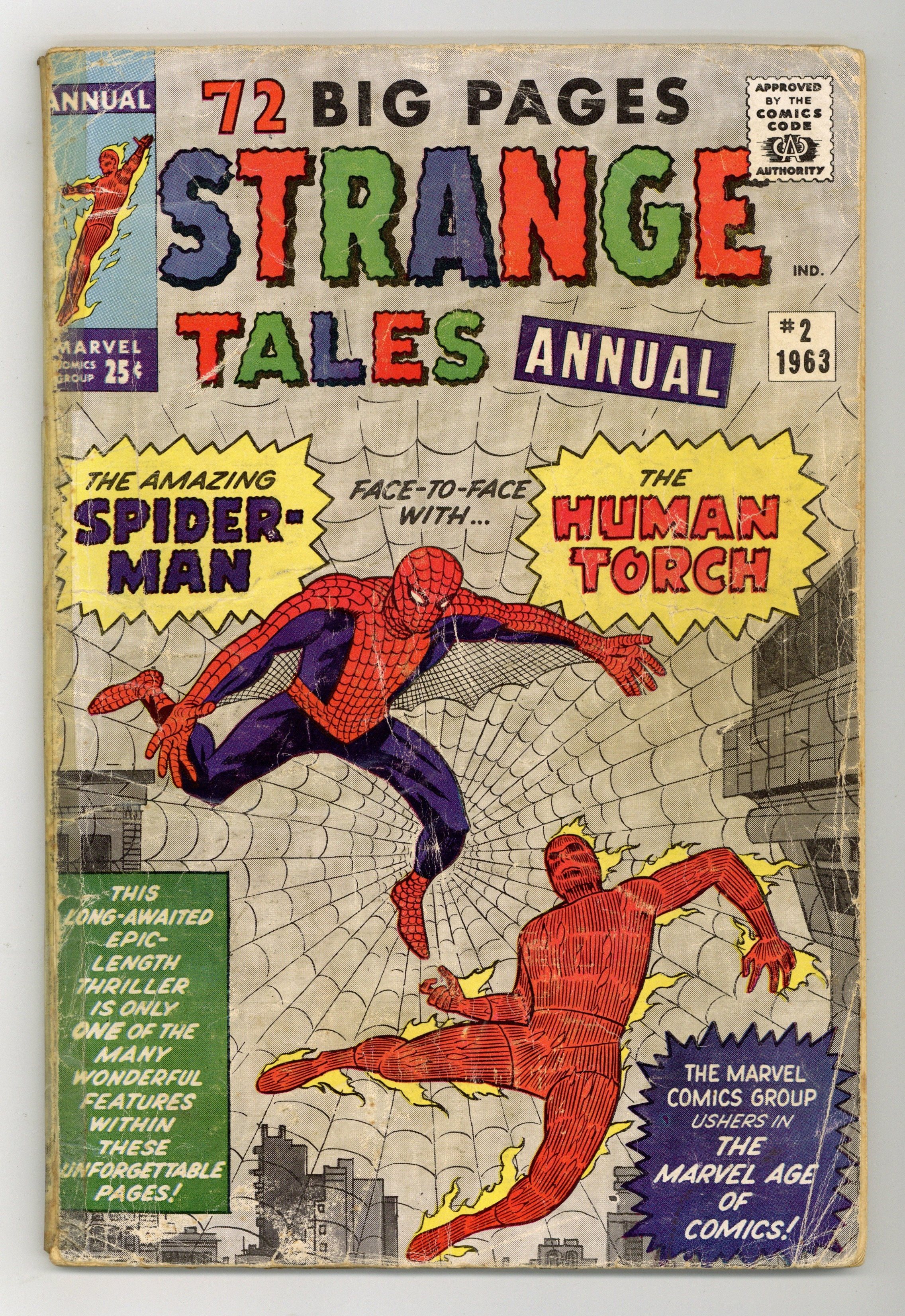 New 18-page Human Torch versus Spider-Man (4th appearance) story , "On the Trail of the Amazing Spider-Man!" Script by Stan Lee, pencils by Jack Kirby, inks by Steve Ditko. Sue Storm appearance. The rest of the issue contains reprints: "I Was the Invisible Man!" Script by Lee, pencils by Kirby, inks perhaps by Paul Reinman (from Strange Tales 67); "I Was a Prisoner on the Planet of Plunder!" Art by Don Heck (from Strange Worlds 2); "I Am Robot!" Art by Joe Sinnott (from SW 1); "Worlds Within Worlds" (from World of Fantasy 16); "I Was the Man Who Lived Twice!" Art by John Buscema (from SW 3); "I Fly to the Stars!" Script by Lee, pencils by Kirby, inks perhaps by Dick Ayers (from SW 3); "Prisoner 2000 A.D." Script by Lee, pencils by Kirby, inks perhaps by Ayers (WOF 16); "I Am the Scourge of Atlantis!" Art by Ayers (from SW 2); "Nightmare Planet!" Art by Sinnott (from WOF 16); and "I Captured the Abominable Snowman!" Script by Lee, art by Ditko (from SW 1). Kirby/Ditko cover. 76 pages, full color. Cover price $0.25.