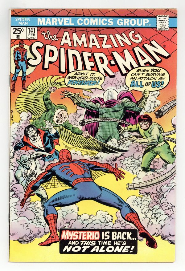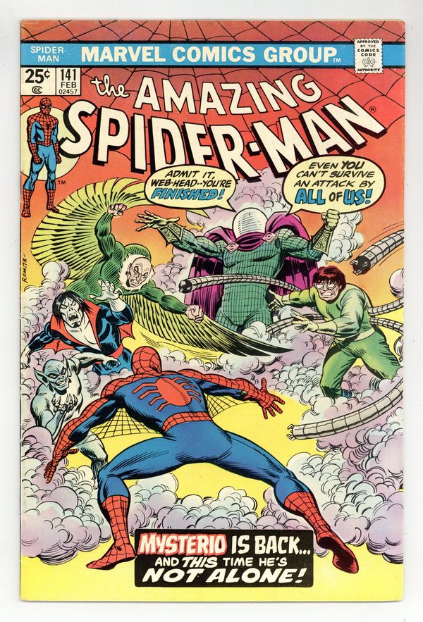 Starts Jan 3 First appearance of the second Mysterio (aka Danny Berkhart) in "The Man's Name Appears to Be...Mysterio!" Part 1 of 2. Script by Gerry Conway. Pencils by Ross Andru. Inks by Frank Giacoia and Dave Hunt (backgrounds). Cover by John Romita. The Amazing Spider-Man decides to take the Spider-Mobile for a spin! But after evading New York's Finest, he accidentally crashes into the Hudson River! Scratch one Spider-Mobile! The mist and fog tricked the web-slinger! The next day when the wall-crawler sees apparitions on his deadly foes including the Green Goblin, Dr. Octopus, and the Molten Man; he realizes that the Master of Illusion has returned! Can Spider-Man stop the madness...before he goes mad himself? Cameo appearances by Mary Jane Watson, Betty Brant, Ned Leeds, Joe Robertson, J. Jonah Jameson, and Professor Miles Warren. (Notes: The web-slinger previously battled the original Mysterio in Amazing Spider-Man 67. The letters page includes Marvel Value Stamp series A #35 Killraven by Herb Trimpe and Frank Giacoia. This story was reprinted in Marvel Tales 118.) 36 pages. 25c cover price. Cover price $0.25.