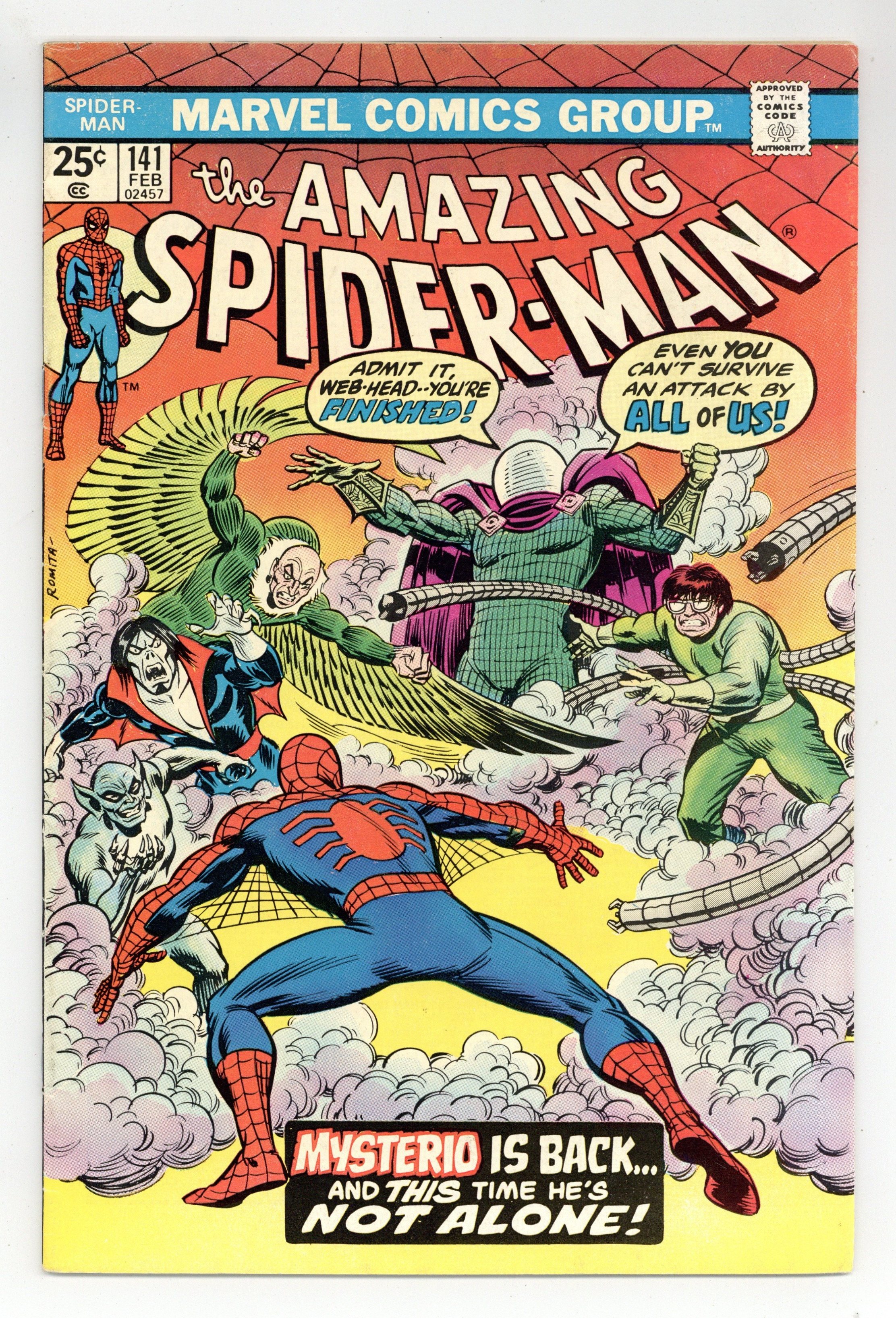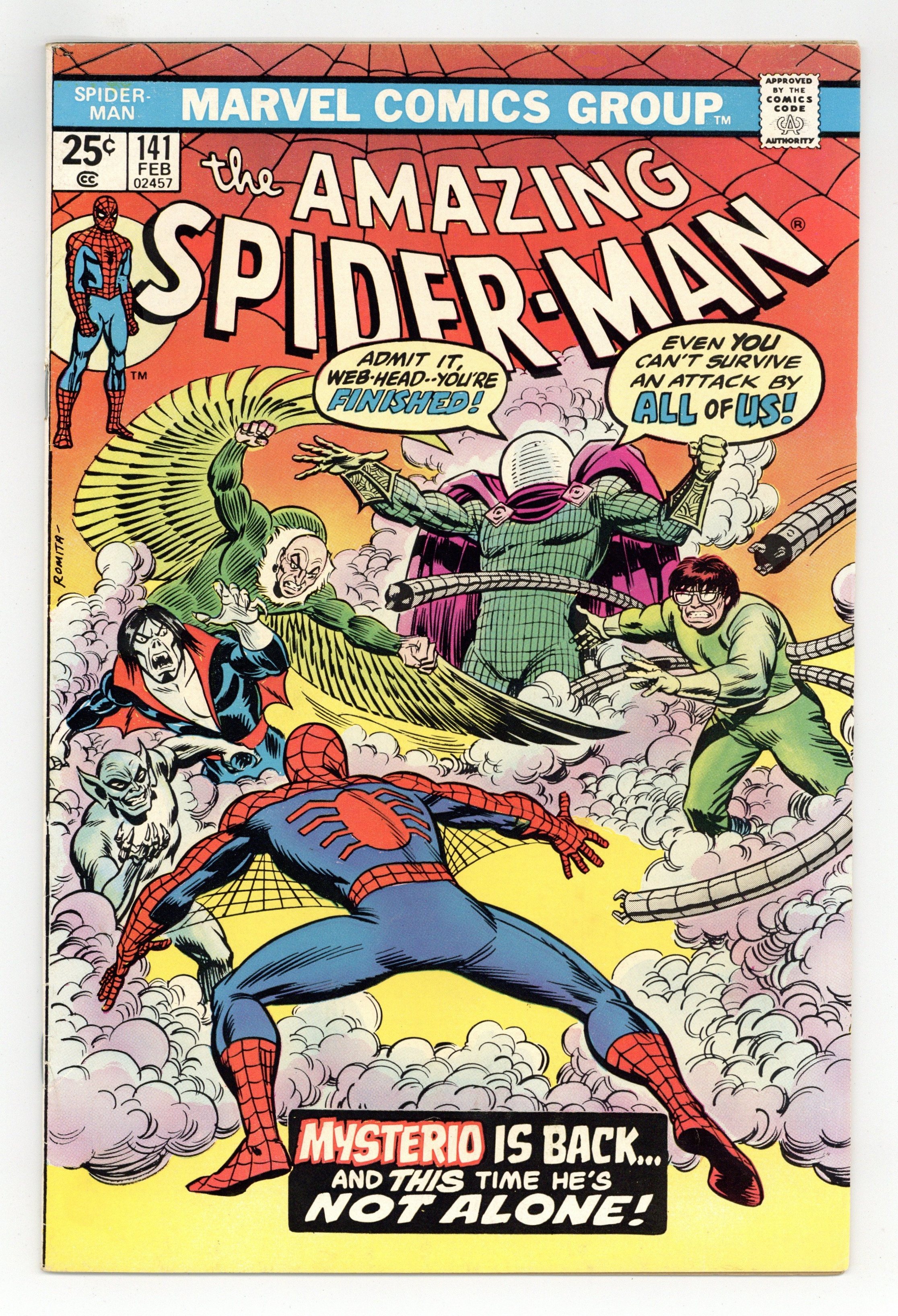 First appearance of the second Mysterio (aka Danny Berkhart) in "The Man's Name Appears to Be...Mysterio!" Part 1 of 2. Script by Gerry Conway. Pencils by Ross Andru. Inks by Frank Giacoia and Dave Hunt (backgrounds). Cover by John Romita. The Amazing Spider-Man decides to take the Spider-Mobile for a spin! But after evading New York's Finest, he accidentally crashes into the Hudson River! Scratch one Spider-Mobile! The mist and fog tricked the web-slinger! The next day when the wall-crawler sees apparitions on his deadly foes including the Green Goblin, Dr. Octopus, and the Molten Man; he realizes that the Master of Illusion has returned! Can Spider-Man stop the madness...before he goes mad himself? Cameo appearances by Mary Jane Watson, Betty Brant, Ned Leeds, Joe Robertson, J. Jonah Jameson, and Professor Miles Warren. (Notes: The web-slinger previously battled the original Mysterio in Amazing Spider-Man 67. The letters page includes Marvel Value Stamp series A #35 Killraven by Herb Trimpe and Frank Giacoia. This story was reprinted in Marvel Tales 118.) 36 pages. 25c cover price. Cover price $0.25.