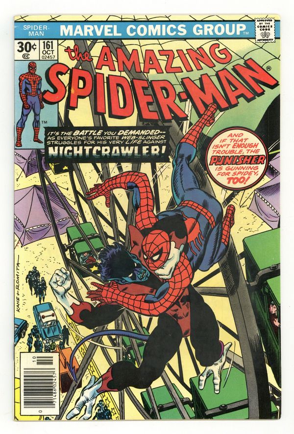 "And the Nightcrawler Came Prowling, Prowling" Part 1 of 2. Guest-starring Nightcrawler. Script by Len Wein. Art by Ross Andru (breakdowns), Mike Esposito (finishes), and Dave Hunt (backgrounds). Cover by Gil Kane and John Romita. Someone is going around New York City impersonating the Punisher! The Amazing Spider-Man thinks the sniper might be Nightcrawler! While the new X-Man believes the shooter could be the web-slinger! First at Coney Island and later at the Roosevelt Island Tramway, Nightcrawler and the wall-crawler clash amid their mutual confusion! But the situation becomes crystal clear once the heroes find themselves in the crosshairs...of the real Punisher! The bullets fly next issue! Cameo appearances by the Punisher, Wolverine, Colossus, Mary Jane Watson, Harry Osborn, Liz Allan, Joe Robertson, and J. Jonah Jameson. (Notes: This issue features the first meeting between Spider-Man and Nightcrawler. The web-slinger meets all of the new X-Men for the first time in Marvel Team-Up Annual 1. This story was reprinted in Marvel Tales 214.) 36 pages. Cover price $0.30.