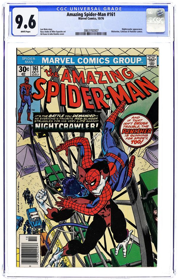 $27.50"And the Nightcrawler Came Prowling, Prowling" Part 1 of 2. Guest-starring Nightcrawler. Script by Len Wein. Art by Ross Andru (breakdowns), Mike Esposito (finishes), and Dave Hunt (backgrounds). Cover by Gil Kane and John Romita. Someone is going around New York City impersonating the Punisher! The Amazing Spider-Man thinks the sniper might be Nightcrawler! While the new X-Man believes the shooter could be the web-slinger! First at Coney Island and later at the Roosevelt Island Tramway, Nightcrawler and the wall-crawler clash amid their mutual confusion! But the situation becomes crystal clear once the heroes find themselves in the crosshairs...of the real Punisher! The bullets fly next issue! Cameo appearances by the Punisher, Wolverine, Colossus, Mary Jane Watson, Harry Osborn, Liz Allan, Joe Robertson, and J. Jonah Jameson. (Notes: This issue features the first meeting between Spider-Man and Nightcrawler. The web-slinger meets all of the new X-Men for the first time in Marvel Team-Up Annual 1. This story was reprinted in Marvel Tales 214.) 36 pages. Cover price $0.30.