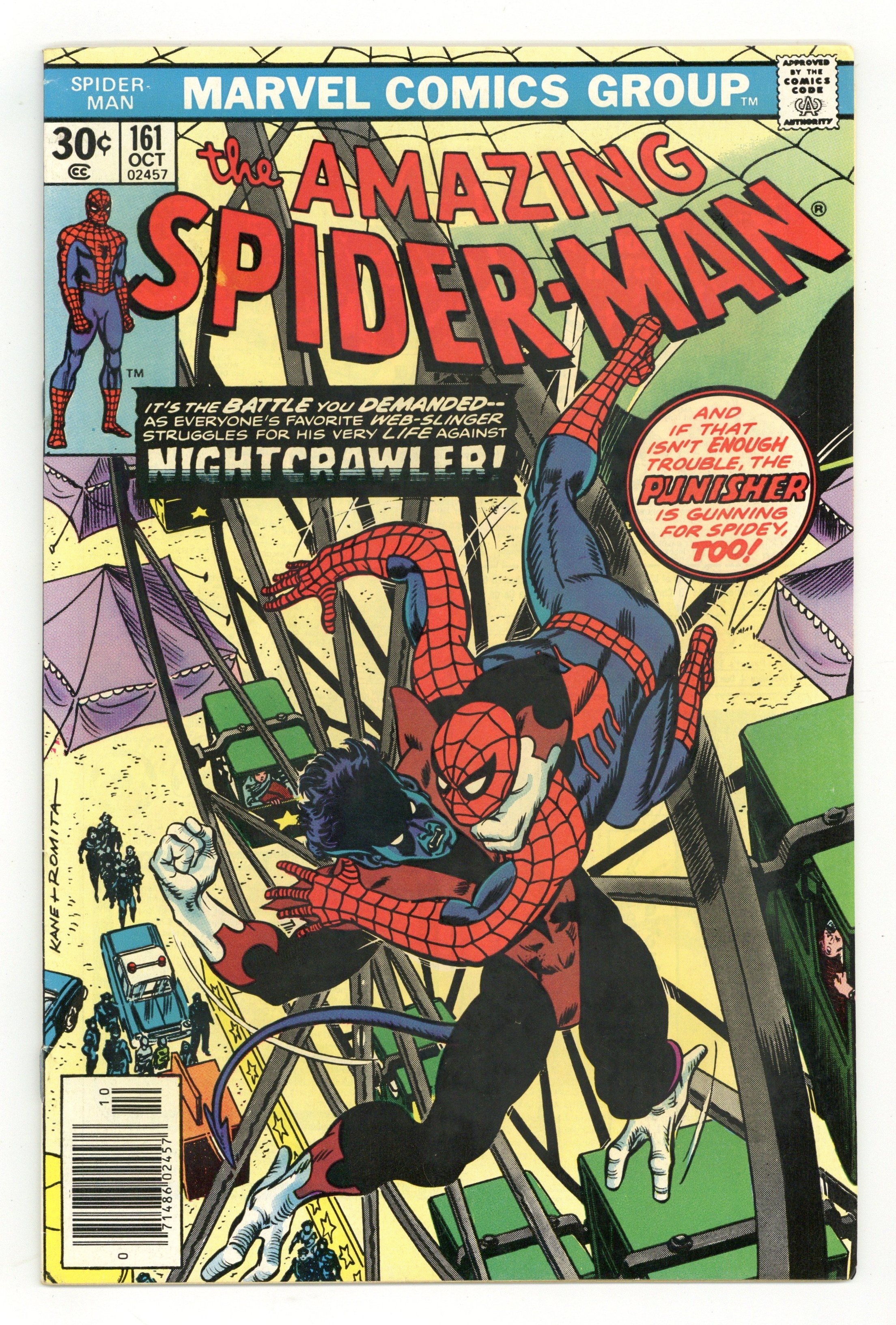 Starts Dec 15 "And the Nightcrawler Came Prowling, Prowling" Part 1 of 2. Guest-starring Nightcrawler. Script by Len Wein. Art by Ross Andru (breakdowns), Mike Esposito (finishes), and Dave Hunt (backgrounds). Cover by Gil Kane and John Romita. Someone is going around New York City impersonating the Punisher! The Amazing Spider-Man thinks the sniper might be Nightcrawler! While the new X-Man believes the shooter could be the web-slinger! First at Coney Island and later at the Roosevelt Island Tramway, Nightcrawler and the wall-crawler clash amid their mutual confusion! But the situation becomes crystal clear once the heroes find themselves in the crosshairs...of the real Punisher! The bullets fly next issue! Cameo appearances by the Punisher, Wolverine, Colossus, Mary Jane Watson, Harry Osborn, Liz Allan, Joe Robertson, and J. Jonah Jameson. (Notes: This issue features the first meeting between Spider-Man and Nightcrawler. The web-slinger meets all of the new X-Men for the first time in Marvel Team-Up Annual 1. This story was reprinted in Marvel Tales 214.) 36 pages. Cover price $0.30.