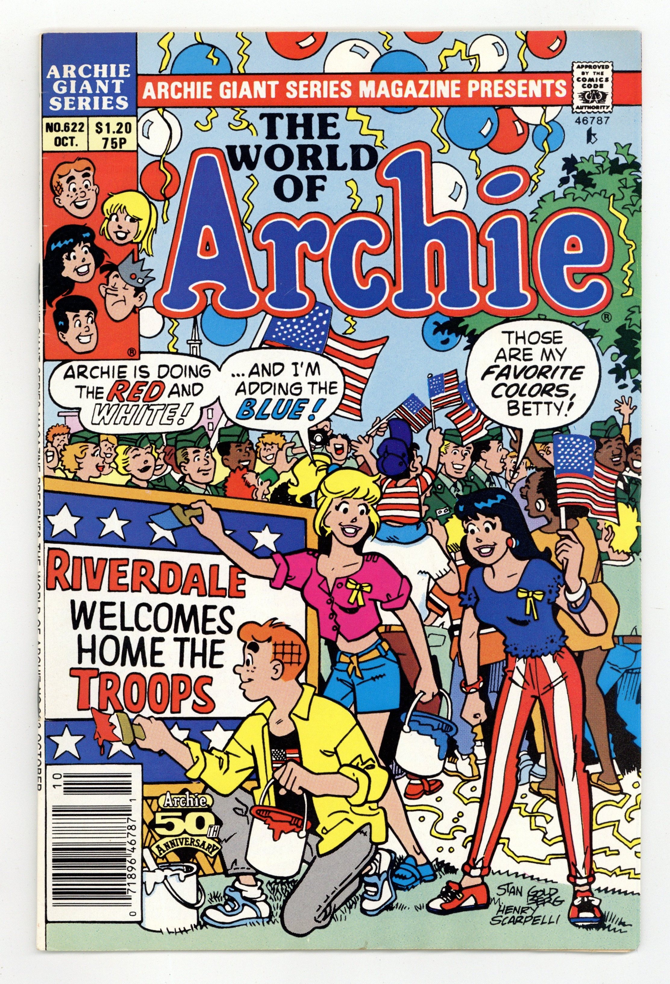 Canadian Price Variant. $1.20 cover price. World of Archie. Cover pencils by Stan Goldberg, inks by Henry Scarpelli. "When Johnny…and Jenny Come Marching Home Again," script by George Gladir, pencils by Stan Goldberg, inks by Henry Scarpelli; Service men and women back from the war have a parade through Riverdale. Keep Our Beaches Clean Archie's Environmental Tip 4 public service announcement. Archie's Club News. "Freedom's Fight," script by George Gladir, pencils by Stan Goldberg, inks by Henry Scarpelli; Betty tells her cousin Vanessa about the history of women in the armed forces. "Another Viewpoint," script by George Gladir, pencils by Stan Goldberg, inks by Henry Scarpelli; An exchange student from Eastern Europe helps Archie and Jughead appreciate the freedom and quality of life in the US. 36 pgs., full color. Cover price $1.20.