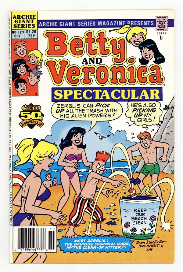 Published Oct 1991 by Archie Publications.$4.49Canadian Price Variant. $1.20 cover price. Betty and Veronica Spectacular. Cover pencils by Dan DeCarlo, inks by Dan Parent and Alison Flood. "Clean-Up Hitter," script by Frank Doyle, pencils by Dan DeCarlo (layouts) and Dan Parent, inks by Alison Flood; Betty and Veronica befriend an alien cleaning up the environment of Riverdale in preparation for the arrival of Queen Zelda from the planet Julius. Article in which Editor Gorelick promotes the Archie Comics staff appearance at the 1991 San Diego Comic Con, as well as Archie Giant Series #622 (World Of Archie) and #624 (Pep). Snip Six-Pack Rings public service announcement; Jughead and Hot Dog show readers how to make plastic pop can rings environmentally safe to dispose of. 36 pgs., full color. Cover price $1.20.