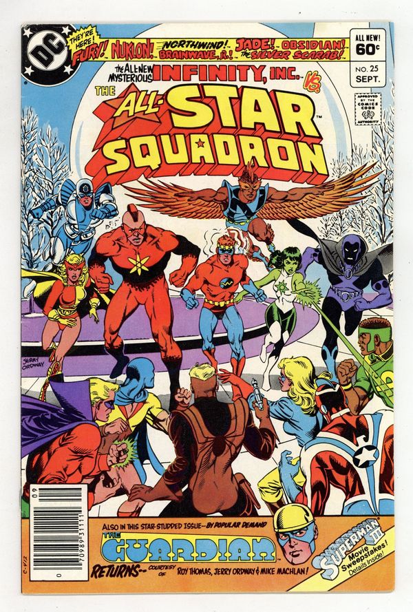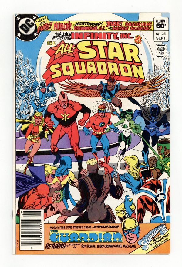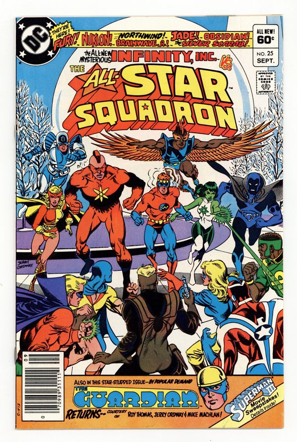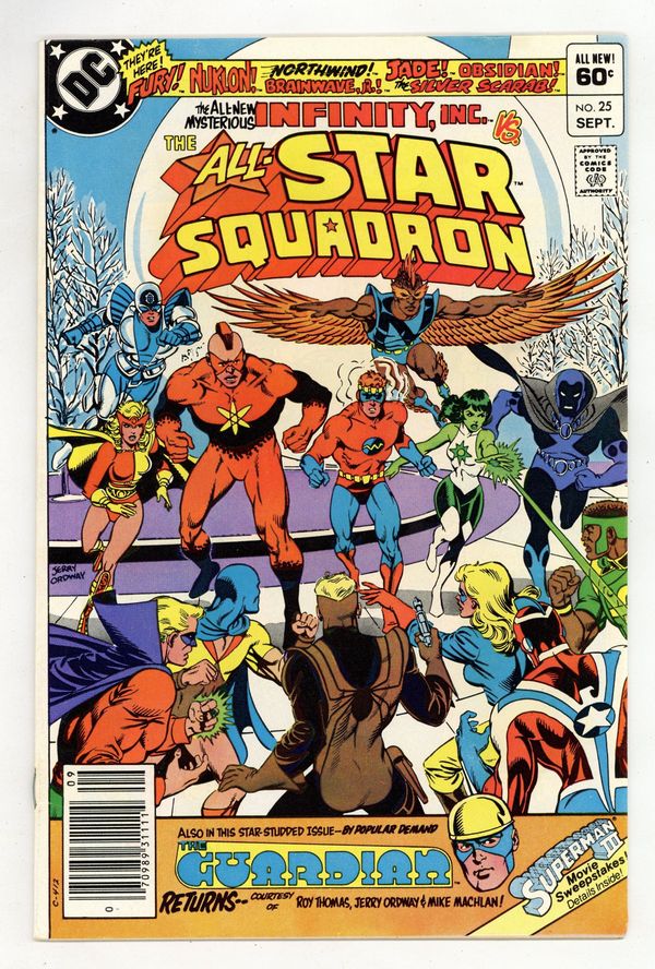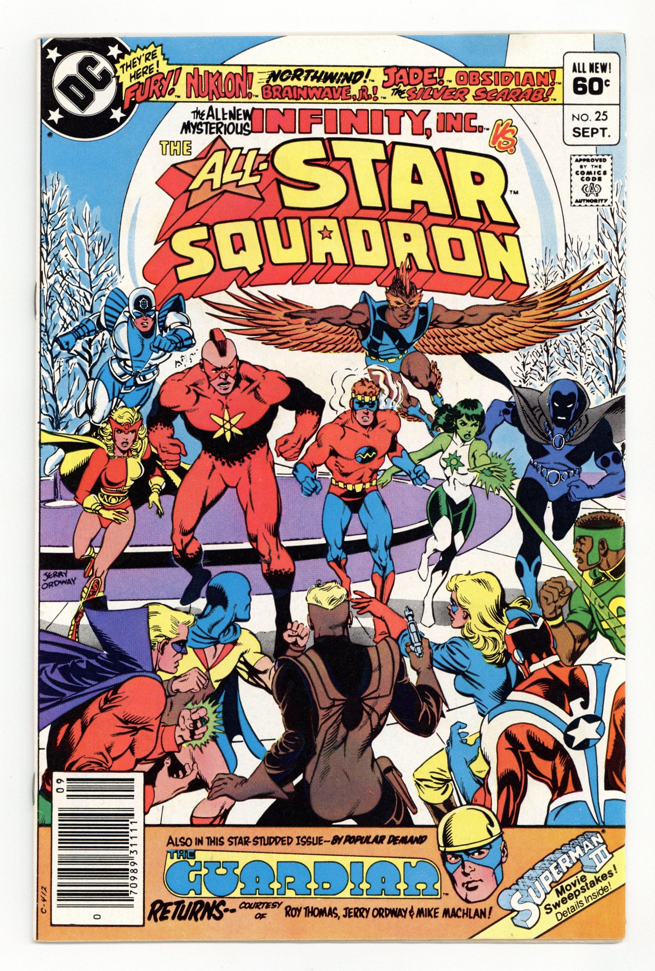 Newsstand Edition. Cover art by Jerry Ordway. The Infinity Syndrome!, script by Roy Thomas, pencils by Jerry Ordway, inks by Mike Machlan; the All-Star Squadron continue battling the Amazing Man; while at the War Department in Washington, the JSA learns of the Ultra-Humanite's plan to attack U.S. defense plants; the Amazing Man agrees to team with the All-Stars against the Ultra-Humanite. Letter from Sheldon Mayer. 36 pgs. $0.60. Cover price $0.60.
