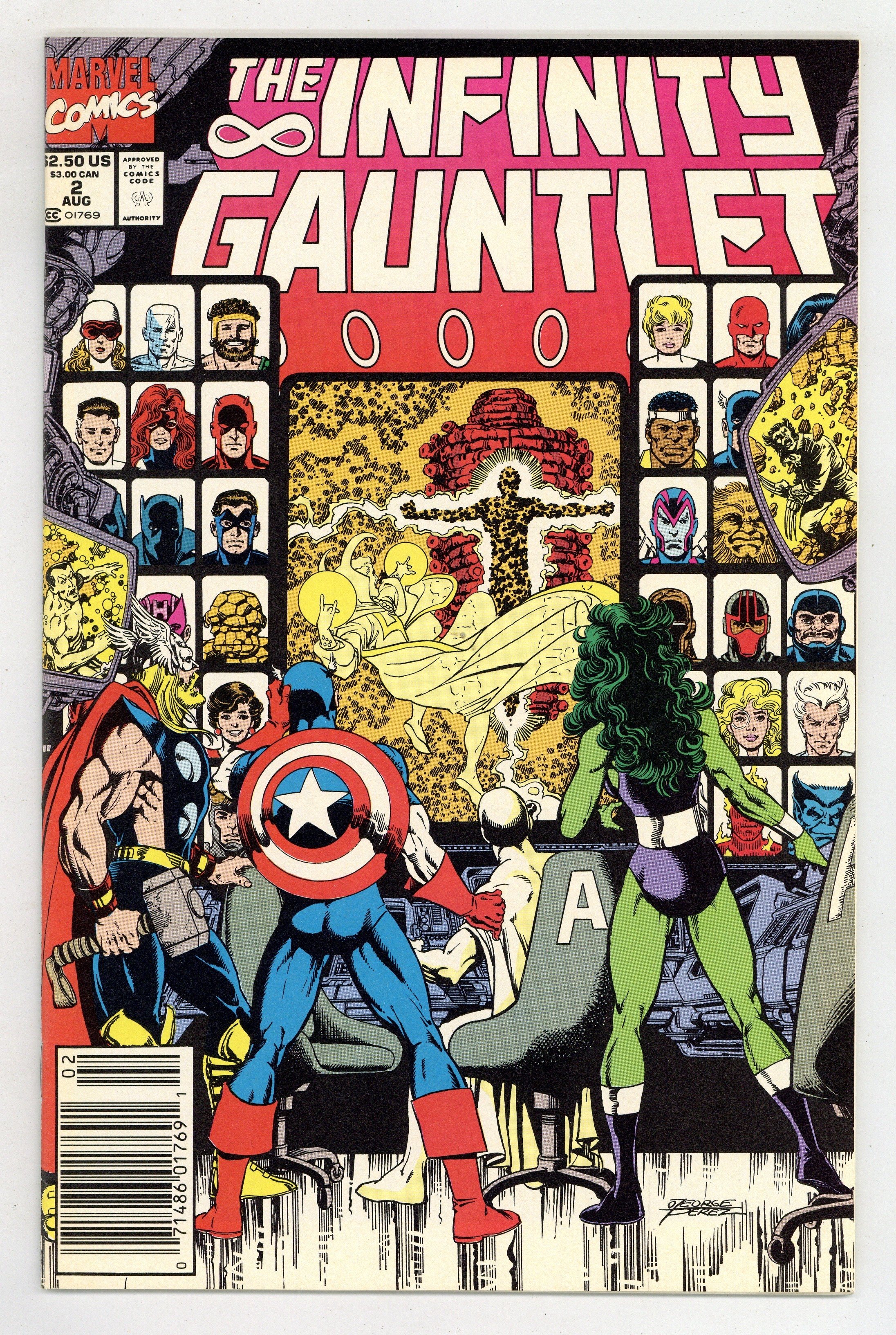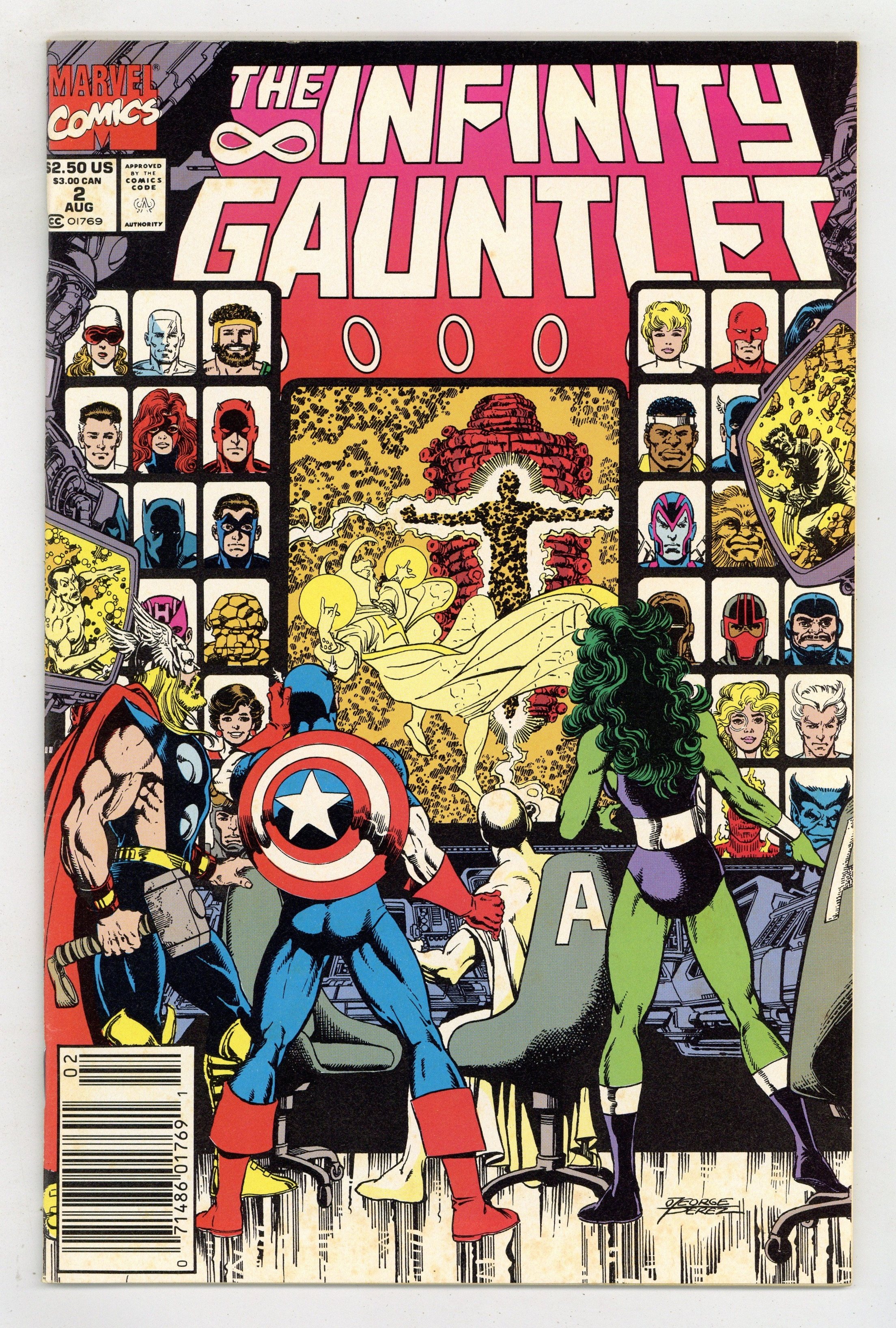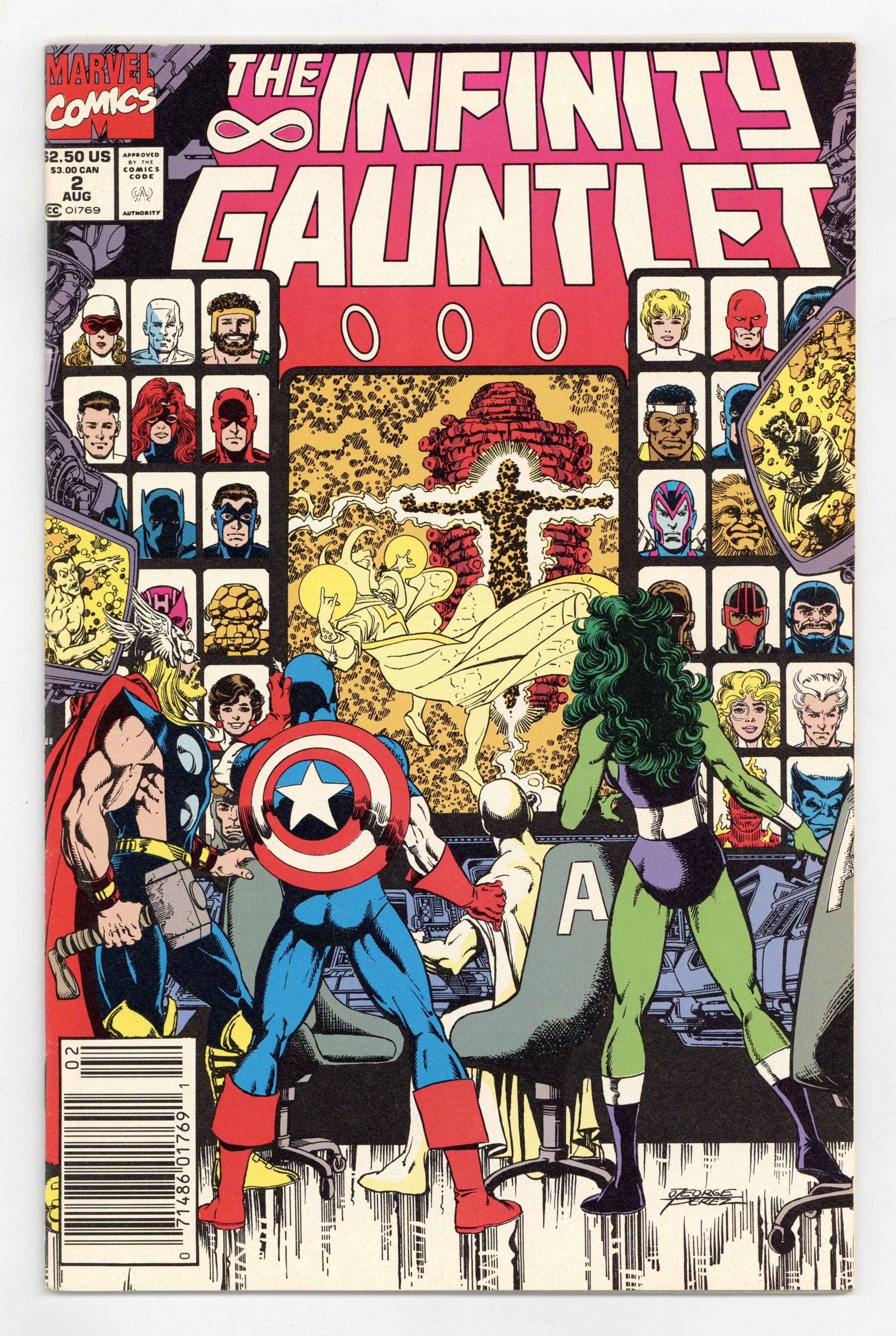 Tags: Hero/Villain Teams$16.00Newsstand Edition. Part 2 of 6. "From Bad to Worse!" Story by Jim Starlin. Art by George Perez and Joe Rubinstein. Wielding nigh-omnipotent power, the mad Titan, Thanos, eradicated half the population in the universe with but a snap of his fingers. Now, the surviving heroes of Earth are left to deal with the chaos that has ensued in the wake of such a catastrophe. Meanwhile, Odin the Lord of Asgard, calls a meeting of the Sky-Fathers (Zeus, Osiris, Manitou, and others) to discuss this disturbance in the universal order of things. Plus, the man who once brought an end to the Mad Titan returns from the grave to lend a hand. But can even the heroes trust the intentions of Adam Warlock? 48 pages. Cover price $2.50.