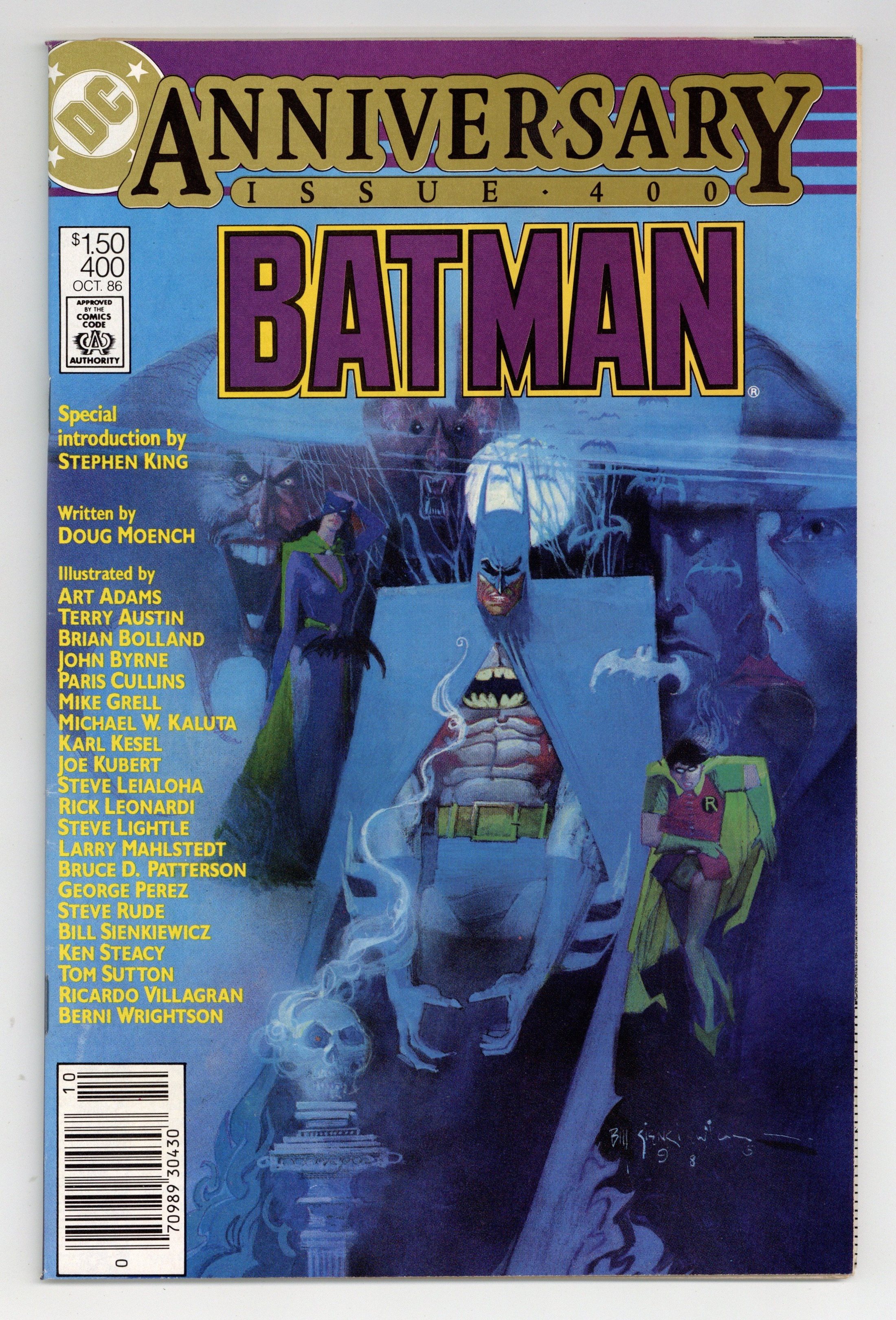 Newsstand Edition. 2-page introduction by Stephen King. As Batman ponders the note 'Know Your Foes' sent to him as a warning, all of his foes are sprung from Arkham Asylum in "Resurrection Night!" Script by Doug Moench. Art by John Byrne (1 page), Steve Lightle & Bruce D. Patterson (6 pages), George Perez (4 pages), Paris Cullins & Larry Mahlstedt (3 pages), Bill Sienkiewicz (7 pages), Arthur Adams & Terry Austin (8 pages), Tom Sutton & Ricardo Villagran (6 pages), Steve Leialoha (3 pages), Joe Kubert (4 pages), Ken Steacy (3 pages), Rick Leonardi & Karl Kesel (6 pages), Brian Bolland (9 pages). Plus: pin-ups by Mike Grell, Michael W. Kaluta, Bernie Wrightson, Steve Rude. Cover by Bill Sienkiewicz. 68 Pages, Full Color. Cover price $1.50.