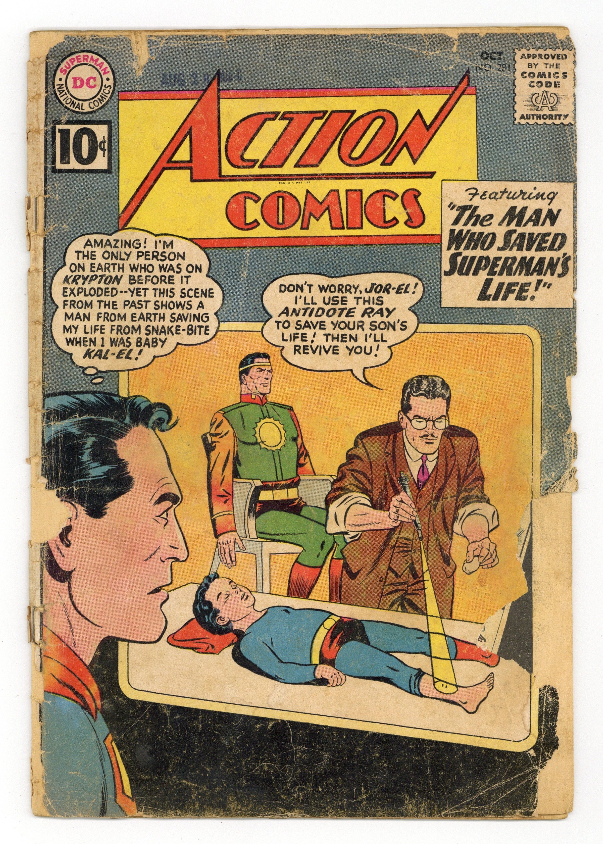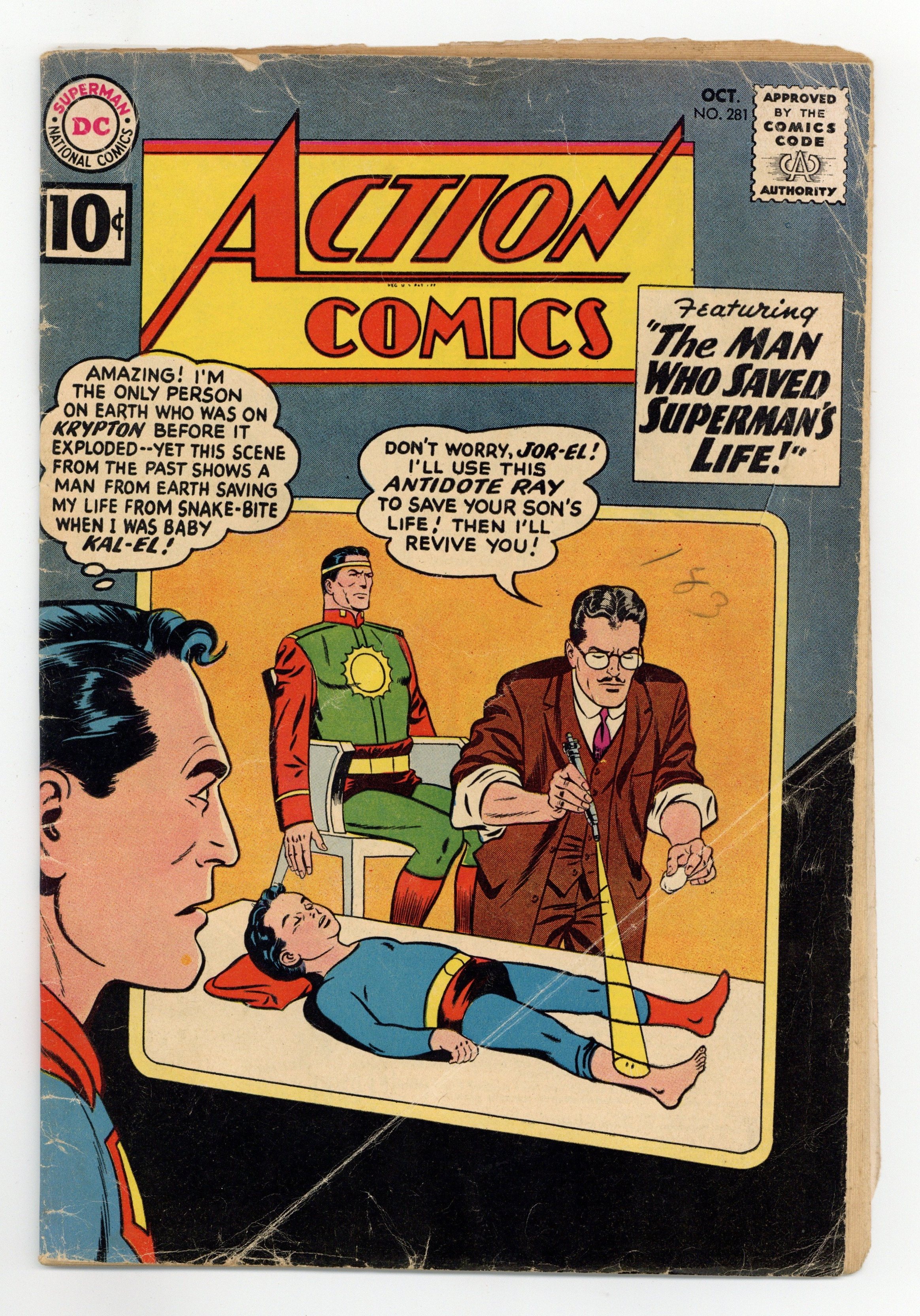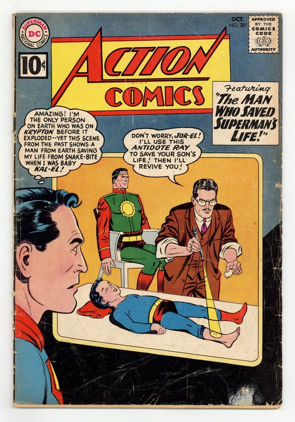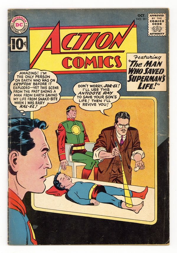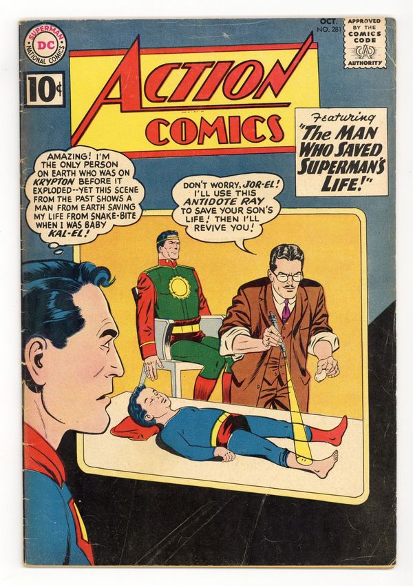 Cover pencils by Curt Swan, inks by Shelly Moldoff. "The Man Who Saved Kal-El's Life!", script by Robert Bernstein, art by Al Plastino; Superman meets Professor Dunn who visited Krypton and meet Jor-El before Krypton exploded. Using the Professor's "Matter-Radio" plans two crooks are on a crime spree. One-page Jerry the Jitterbug story by Henry Boltinoff. Did You Vote for a New Hair Style for Linda (Supergirl) Lee? illustration by Jim Mooney. "The Secret of the Time-Barrier!", script by Jerry Siegel, art by Jim Mooney; The effects of Lesla-Lar's ray have still stripped Supergirl of her powers, but when Superman takes her into the past it is discovered that her super powers return in other time periods. 36 Pages, Full Color. $.10 Cover price $0.10.