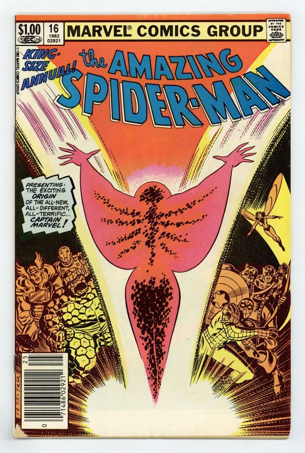 Newsstand Edition. "Who's That Lady?" First appearance of the second Captain Marvel, Monica Rambeau. Guest-starring the Avengers and the Thing. Script by Roger Stern. Art by John Romita Jr. (breakdowns) and John Romita Sr. (finishes). Cover by John Romita Jr. and John Romita Sr. It's the dazzling debut of the new Captain Marvel (aka Monica Rambeau)! After gaining her powers in a freak accident on an offshore oil rig, the New Orleans native needs help controlling her awesome new abilities! Monica travels to New York City in hopes of finding the Fantastic Four! But she bumps into the Spectacular Spider-Man first! After eluding the web-slinger, Captain Marvel zooms to the Baxter Building! However, Ben Grimm can only offer moral support, so he sends the distressed captain to Avengers Mansion! Once there Shell-head and the Wasp attempt to stabilize Captain Marvel's runaway powers, but the wall-crawler inadvertently interferes! Is the new Captain Marvel's superhero career going to be over...before it even starts? Cameo appearances by Harry Osborn and Liz (Allan) Osborn. Avengers Lineup: Captain America, Hawkeye, Iron Man, She-Hulk, Thor, and the Wasp. First backup feature: "The Many Loves of Peter Parker" One-page breakdown of the various loves of Peter Parker's life. Second backup feature: "The Daily Bugle" One-page illustration of the cast of characters at the Daily Bugle. (Note: Captain Marvel appears next in Avengers 227.) 52 pages. Cover price $1.00.