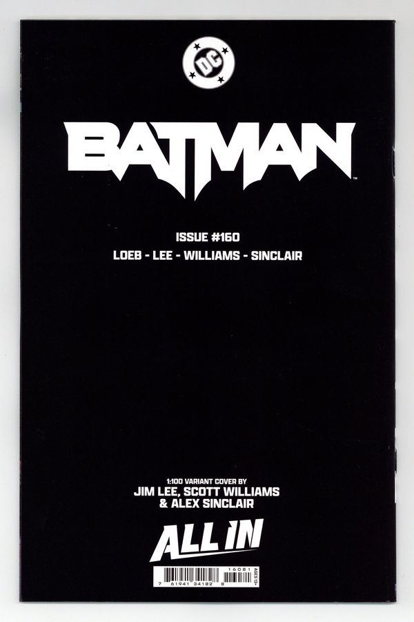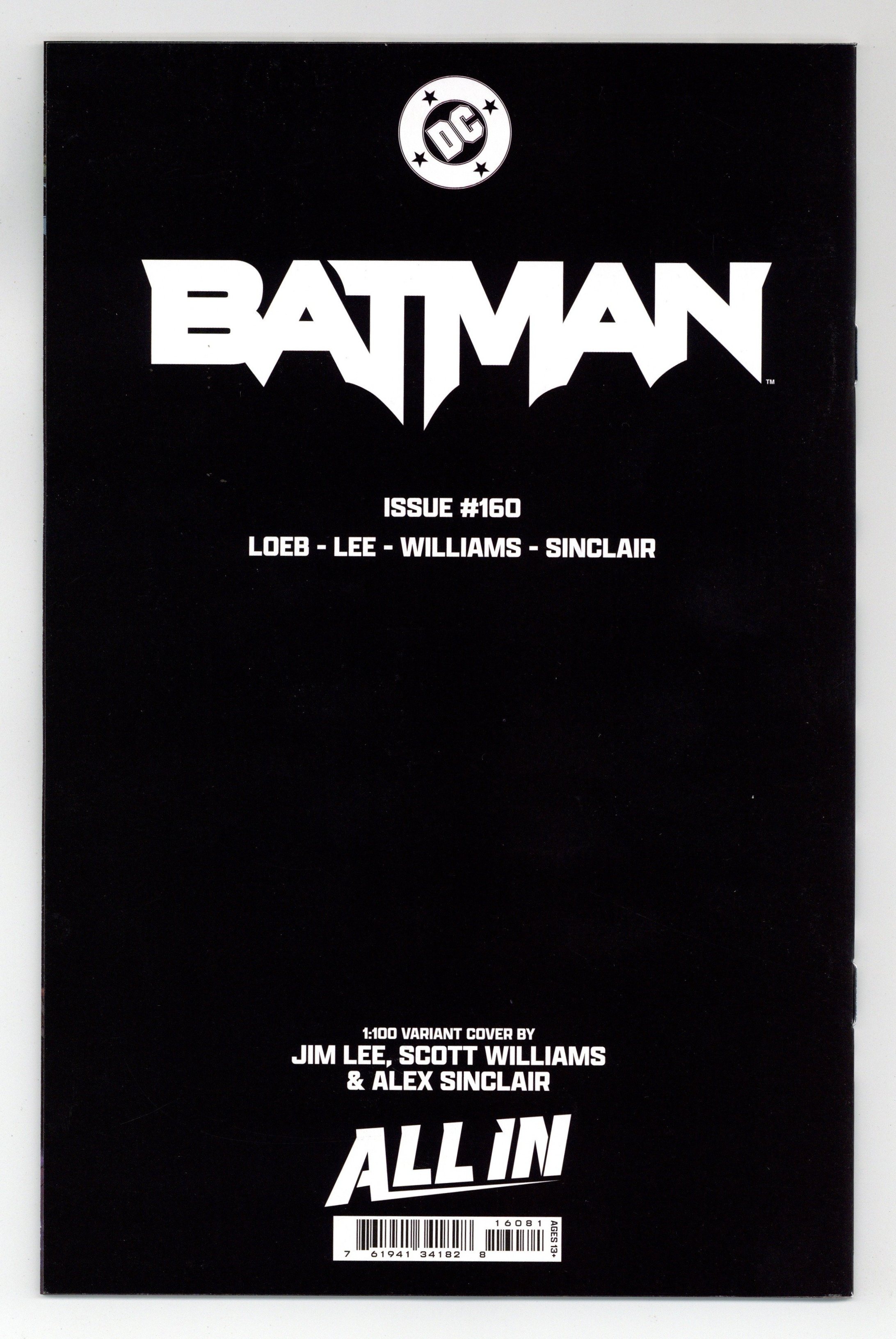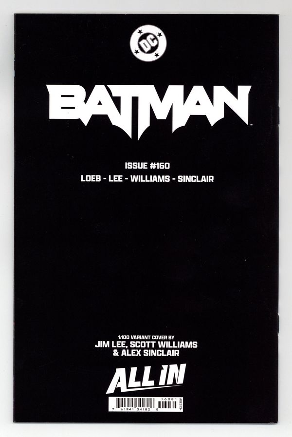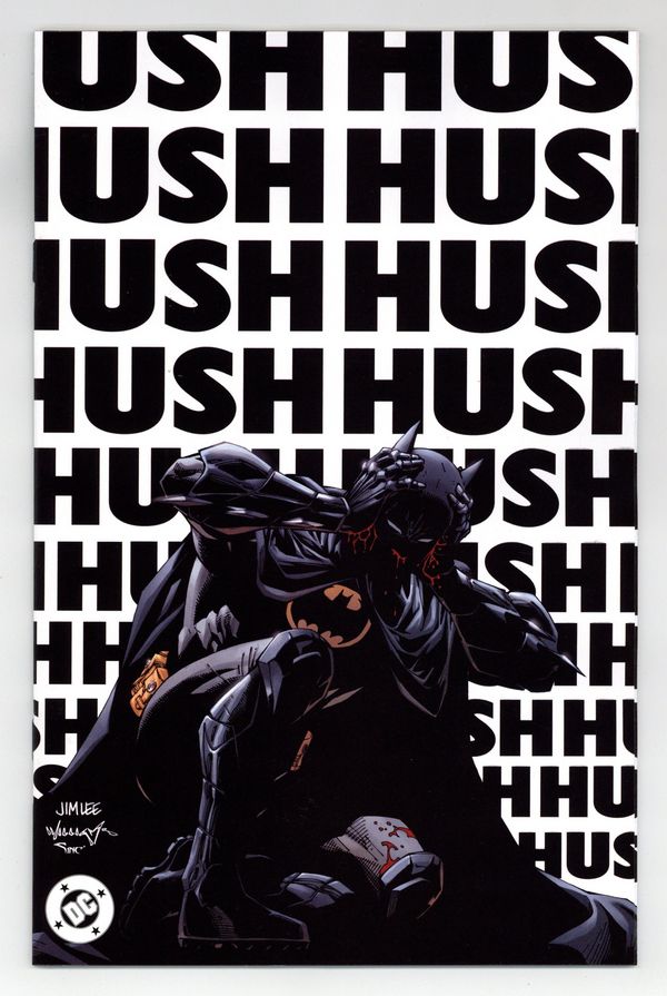 Limited 1 for 100 Retailer Incentive Variant Cover. Written by Jeph Loeb. Art by Jim Lee, Scott Williams. Cover by Jim Lee, Scott Williams. H2SH WITH JEPH LOEB AND JIM LEE PART 3! The gentleman's name is Silence, and his alliance with Hush will destroy Batman! 40 pages, full color. Rated T+ Cover price $5.99.