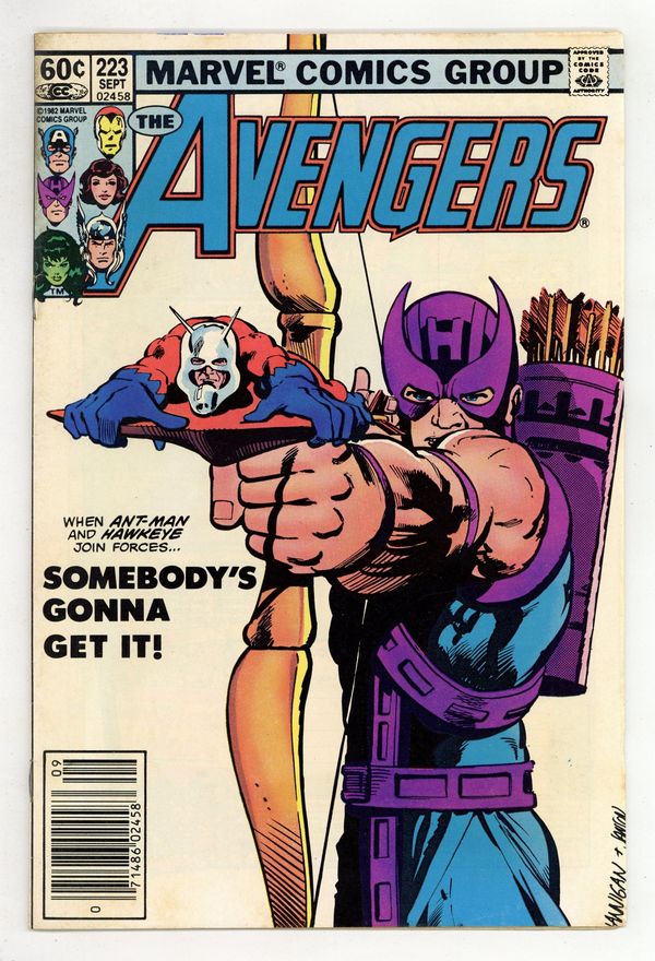 Tags: Avengers$17.50Newsstand Edition. "Of Robin Hoods and Roustabouts" Guest-starring Ant-Man. Script by David Michelinie. Pencils by Greg LaRocque. Inks by Brett Breeding and helpers. Cover by Ed Hannigan and Klaus Janson. On a sunny afternoon in Nassau County, Clint Barton and Scott Lang attend a traveling carnival. Scott is there having fun with his daughter enjoying the attractions, while Clint is following a lead concerning possible criminal activity! Hawkeye's and Ant-Man's paths collide when a super-villain is discovered at the carnival! It's the Taskmaster! The man with the photographic reflexes! And inside a giant circus tent, Ant-Man and the ace archer will try to cancel the Taskmaster's act! Cameo appearances by Captain America, Iron Man, She-Hulk, and the Wasp. (Notes: The Taskmaster previously appeared in Marvel Team-Up 103. The back cover features a Megaforce ad drawn by William Stout.) 36 pages Cover price $0.60.