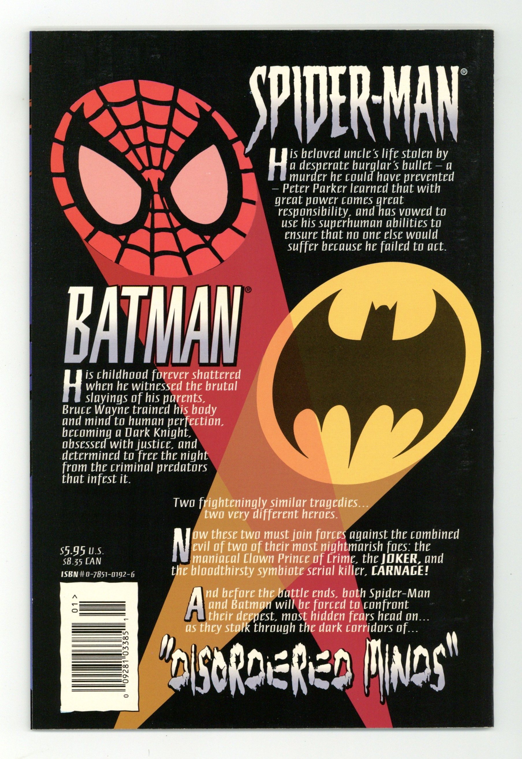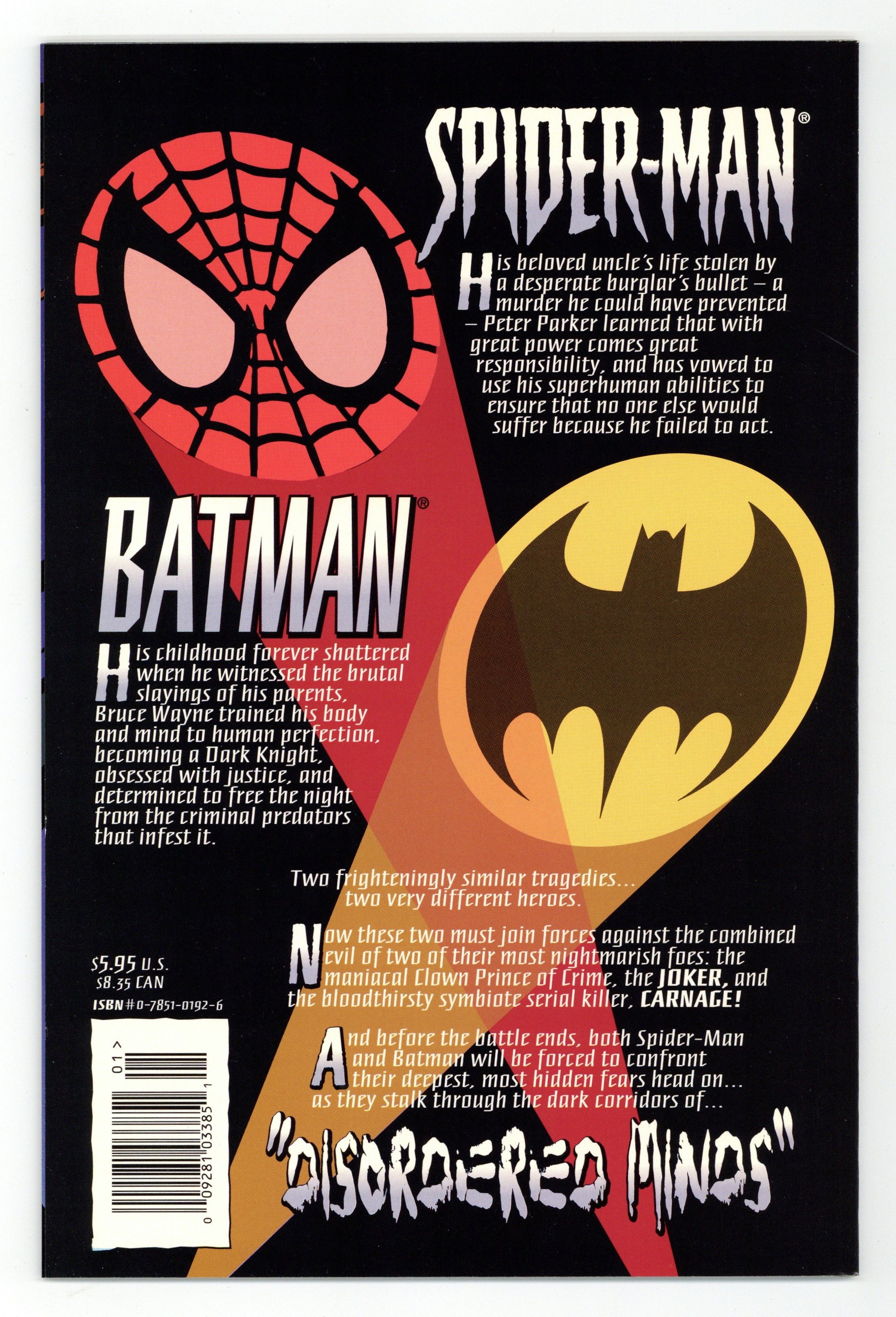 Newsstand Edition. "Disordered Minds!" Story by J.M. DeMatteis. Art by Mark Bagley, Scott Hanna, and Mark Farmer. Two of comic's biggest icons must team-up to take down two of their craziest villains. Can Batman, the Dark Knight Detective, and the Amazing Spider-Man set aside their differences long enough to stop the maniacal machinations of the psychotic Carnage and the Joker, Clown Prince of Crime? Squarebound edition with embossed cover. Cover price $5.95.