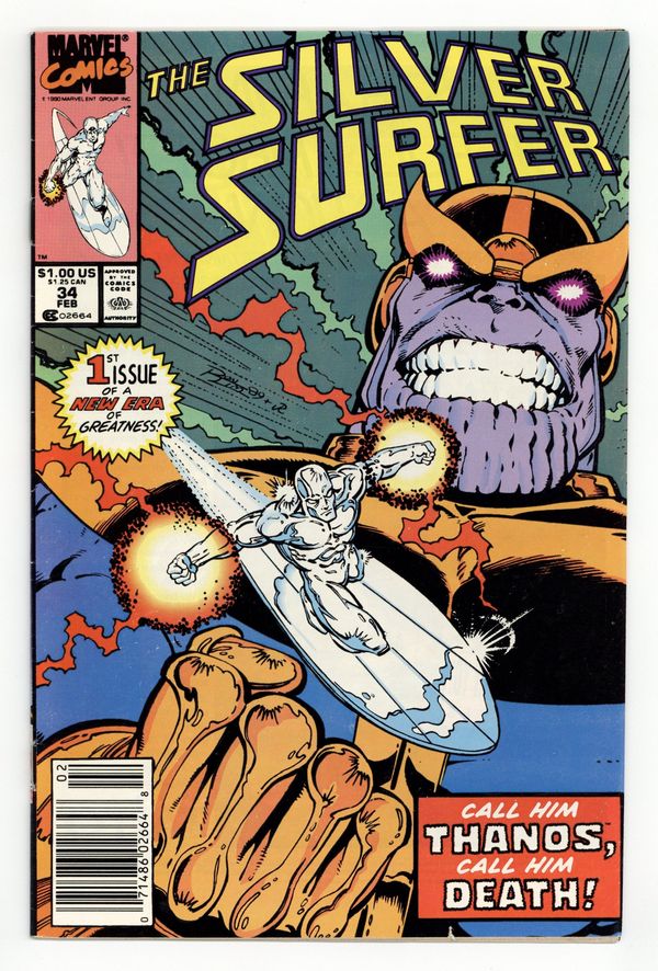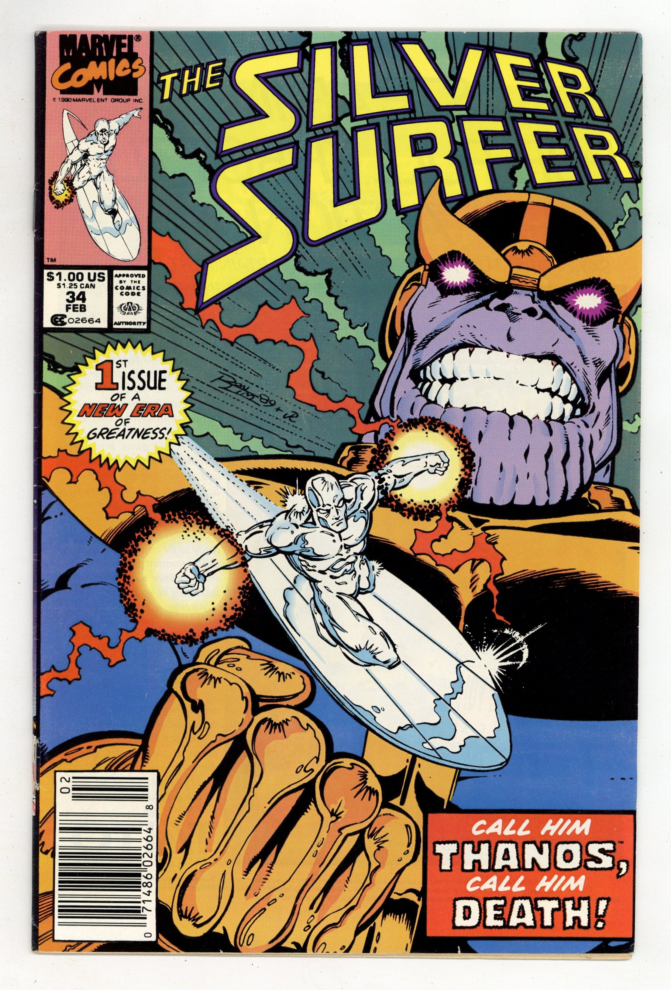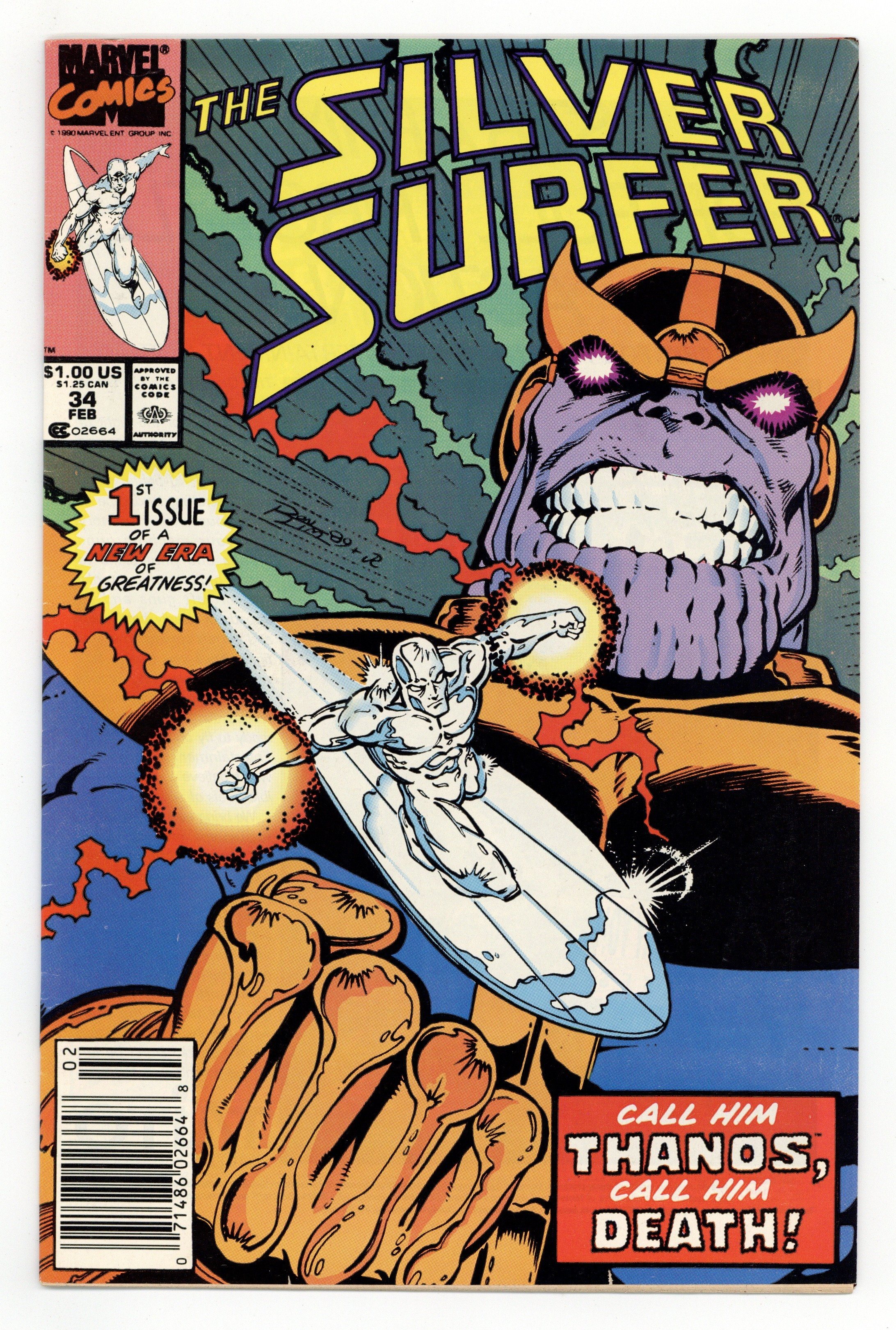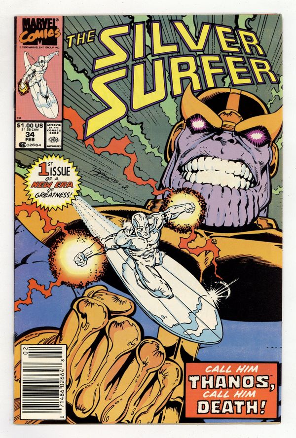 Tags: Silver Surfer$25.00Newsstand Edition. Infinity Gauntlet: Prelude - Rebirth of Thanos: Part 1 of 5 - "...Even Demigods must Dream!" Featuring the return of Thanos. Story by Jim Starlin. Art by Ron Lim and Tom Christopher. The Silver Surfer tours the realm of Death. And, by story's end, witness the triumphant return of one of the Marvel Universe's most dangerous villains, the Mad Titan, Thanos. 32 pages.