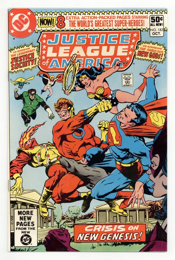 Jim Starlin cover cover. (story line runs through #183-185) The annual team-up for the Justice League of America and the Justice Society of America begins in this issue. This year the two teams, even with an assist from the New Gods, have their work cut out for them as they take on none other than Darkseid himself! Written by Gerry Conway with art by Dick Dillin and inks by Frank McLaughlin. This issue features Superman, Batman, Green Lantern, Doctor Fate, Powergirl, Mister Miracle, Geoforce, and the the Huntress. Cover price $0.50.