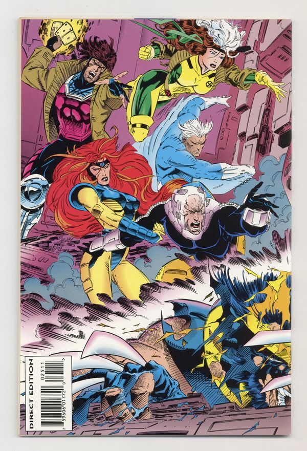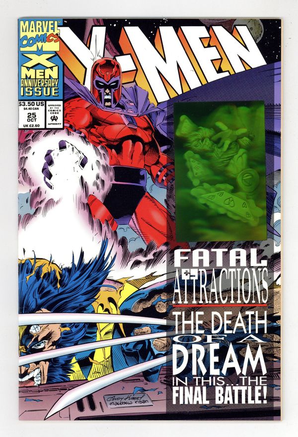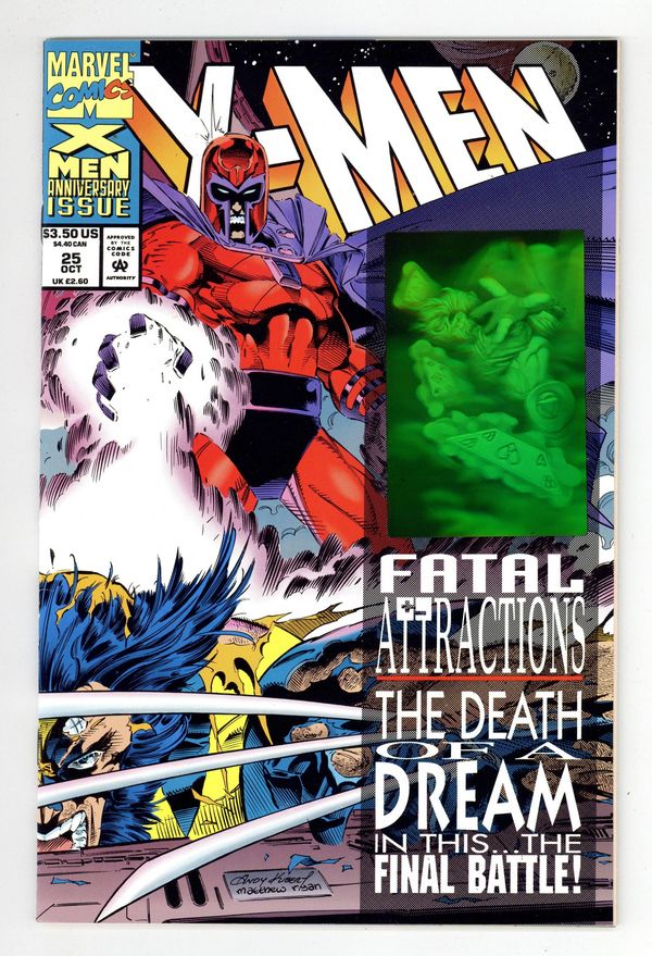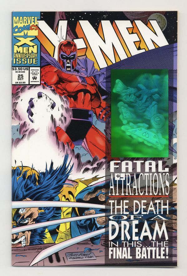 Direct Edition. Standard Gambit Hologram Cover by Andy Kubert. 48-page giant; Magneto pulls the adamantium out of Wolverine's body in this issue. Andy Kubert art. Fatal Attractions part 4 of 6: "Dreams Fade." Script by Fabian Nicieza, pencils by Andy Kubert, inks by Matthew Ryan. Cameos by the Thing and Mr. Fantastic (of the Fantastic Four) and Nick Fury. Kubert/Ryan wraparound cover. Cover price $3.50.