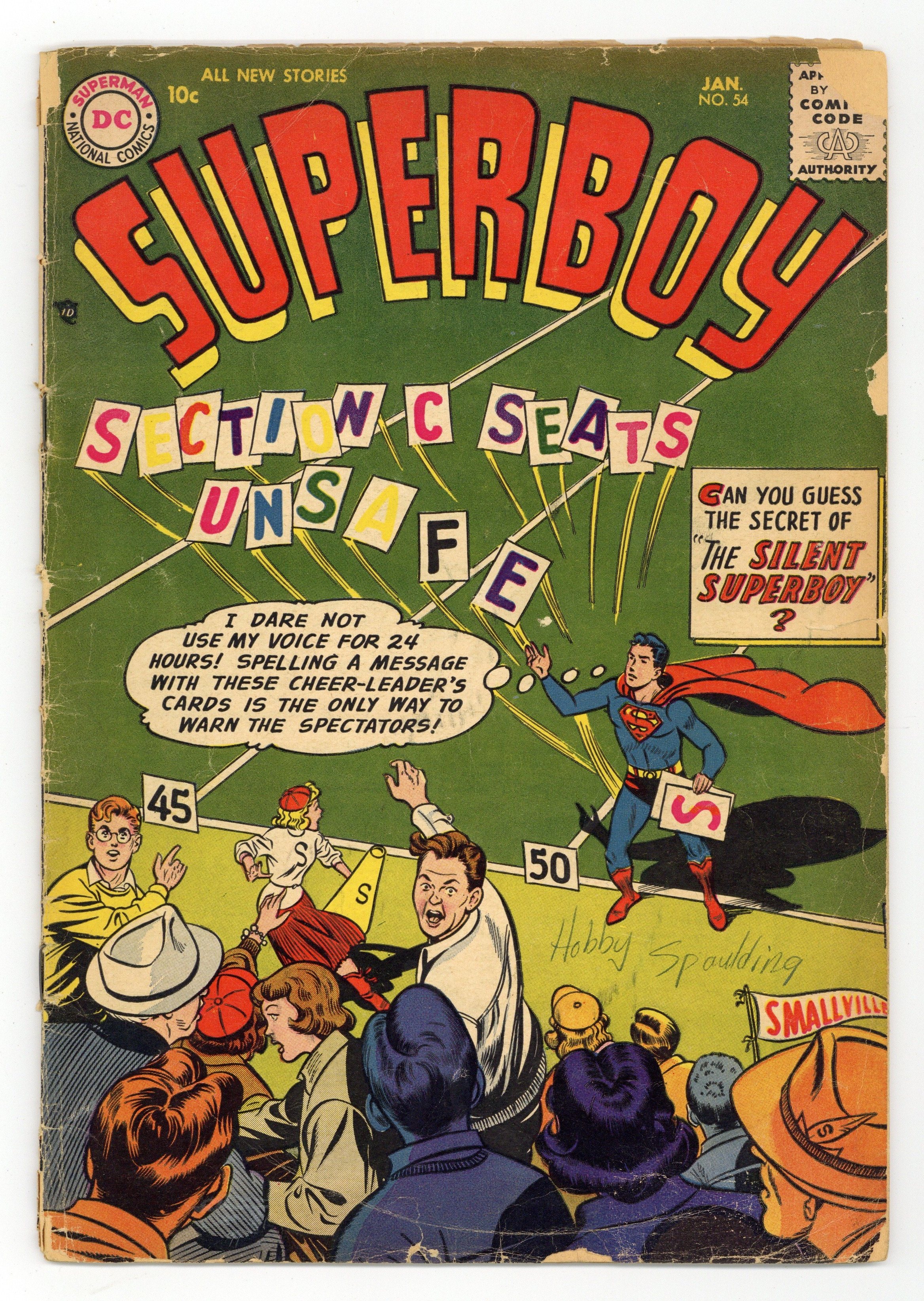 Cover pencils by Curt Swan, inks by Stan Kaye. Superboy's Substitute Suits, script by Otto Binder, art by Curt Swan; Doc Ellison steals Superboy's costume and is selling criminals invulnerable copies of it; Meanwhile, Superboy is wearing a costume made of regular cloth. Famous Books Quiz public service announcement starring Buzzy, script by Jack Schiff, art by Ruben Moreira. Shorty humor page by Henry Boltinoff. The Sixth Clark Kent, script by Alvin Schwartz, pencils by Curt Swan; Lawyers are searching for the heir to Phineas Baker's fortune—someone named "Clark Kent." The Silent Superboy, script by Otto Binder, art by John Sikela; A new type of H-bomb has sensitized the atmosphere to Superboy's voice so he cannot speak aloud for 24 hours. 36 Pages, Full Color. Cover price $0.10.