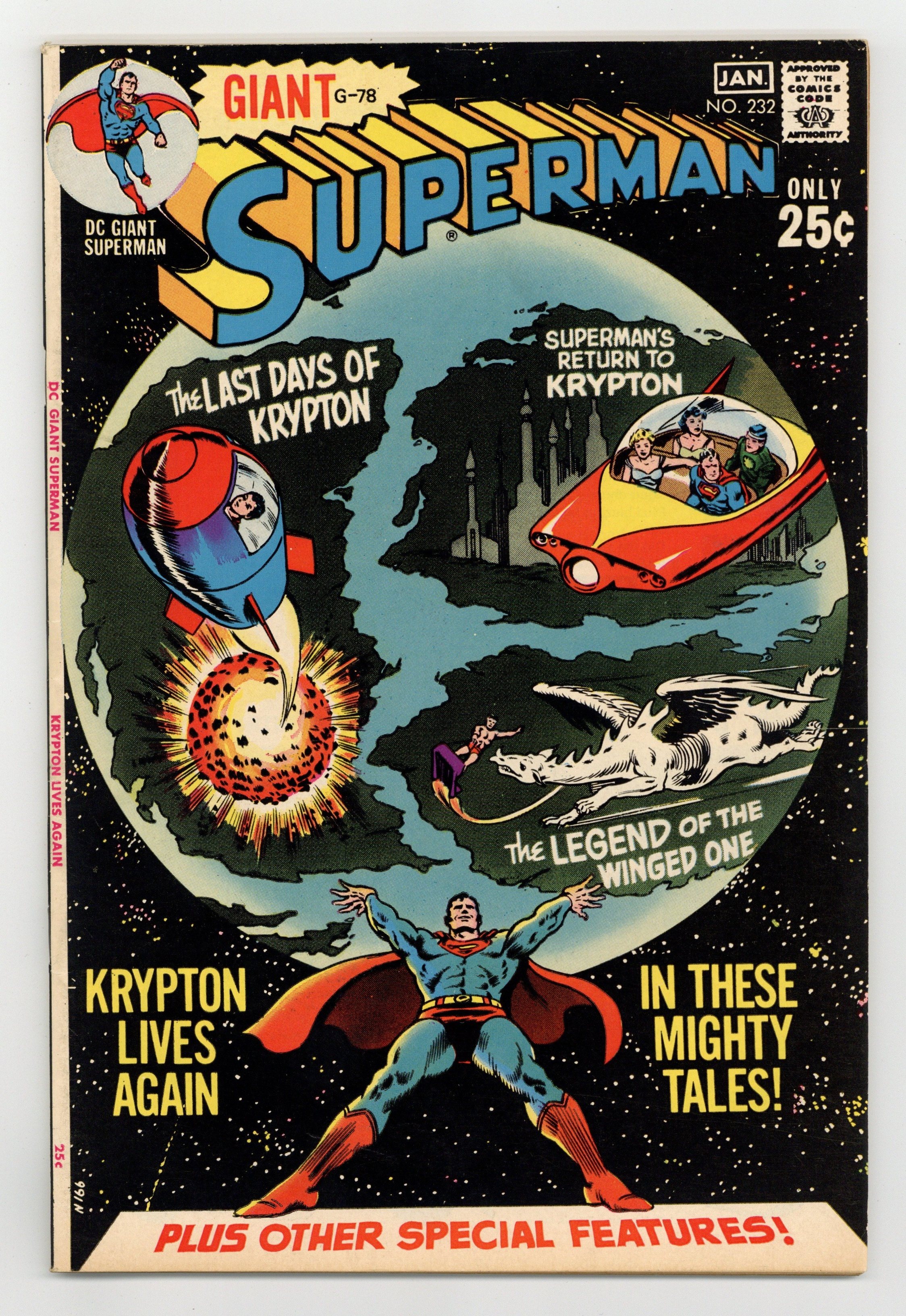 Cover pencils by Curt Swan, inks by Murphy Anderson. DC Giant featuring reprinted stories: Superman Meets Jor-El and Lara Again [Superman's Return to Krypton! part 1], script by Jerry Siegel, pencils by Wayne Boring, inks by Stan Kaye; Superman accidentally travels through time and across space to Krypton. Superman's Kryptonian Romance [Superman's Return to Krypton! part 2]; Superman romances Lyla and witnesses Jonathan Kent's proposal to Martha, while Brainiac shrinks and steals Kandor. The Surprise of Fate! [Superman's Return to Krypton! part 3]. Father's Day on Planet Krypton!, script by Leo Dorfman, art by George Papp. The Fugitive from the Phantom Zone!, script by Jerry Siegel, art by Al Plastino. The Wizard City starring Superboy, script by Bill Finger, pencils by Curt Swan, inks by George Klein. 68 Pages, Full Color. Cover price $0.25.