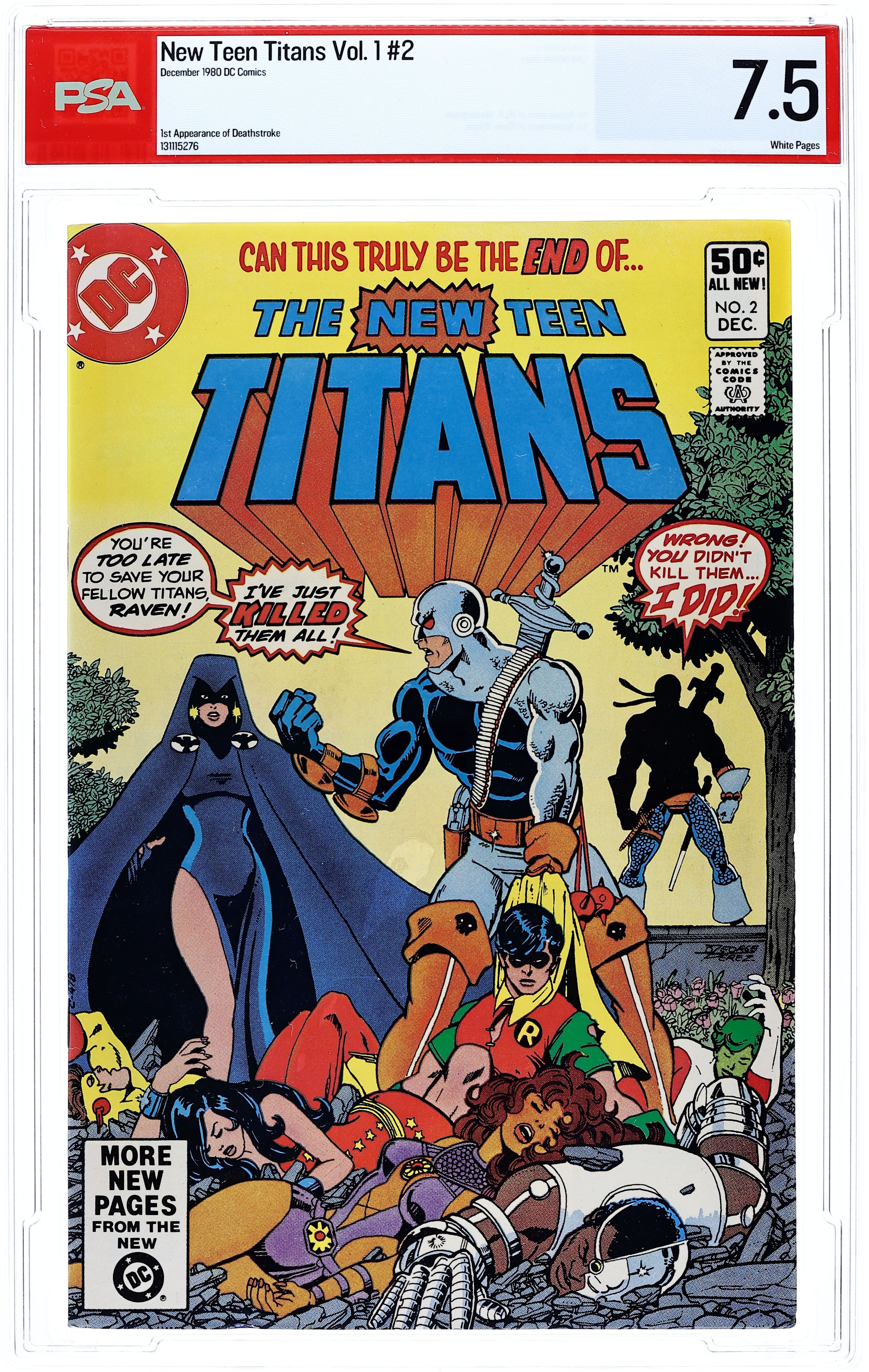 Tags: Teen Titans$185.00Direct Edition. First appearance of Deathstroke the Terminator in "Today...the Terminator!" Characters: Teen Titans [Robin; Kid Flash; Wonder Girl; Cyborg; Starfire; Raven; Changeling]; The Terminator [Slade Wilson] (1st; Later Deathstroke); The Ravager [Grant Wilson] (Intro; Death); Wintergreen (Intro); HIVE. Script by Marv Wolfman, with art by George Perez and Romeo Tanghal. Plus: an article by Marv Wolfman on the revival of the Teen Titans. Cover by George Perez. Cover price $0.50.