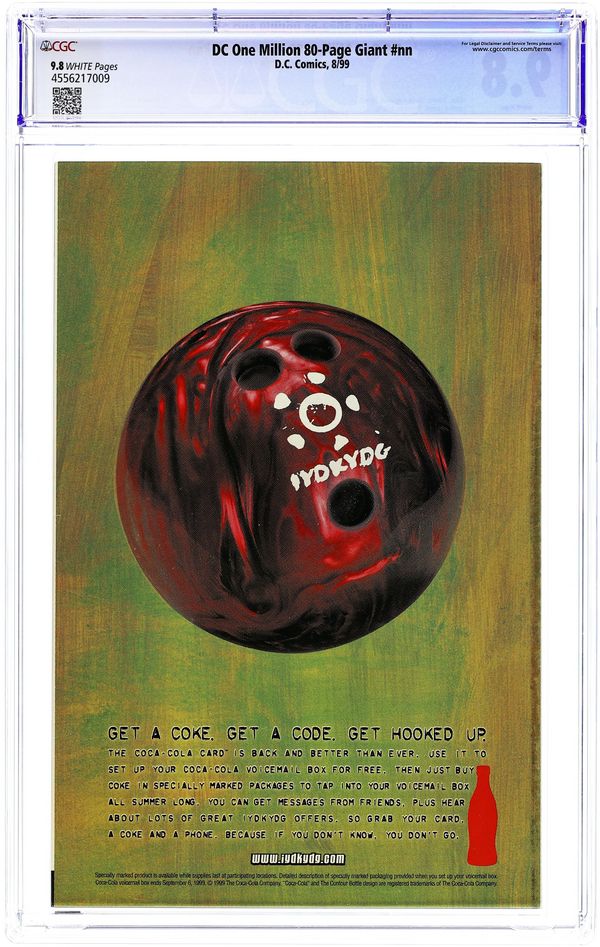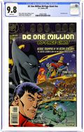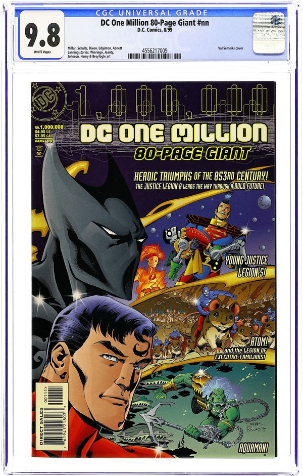 WRITTEN BY GRANT MORRISON, CHUCK DIXON, MARK MILLAR, AND VARIOUS; ART BY DUSTY ABELL, MIKE WIERINGO, NORM BREYFOGLE, AND VARIOUS; COVER BY VAL SEMEIKS AND PRENTIS ROLIINS In stores June 9. Return to the world of the 853rd century in an exciting one-shot! Worlds collide in "Crisis One Million" (written by Grant Morrison with art by Dusty Abell and Jim Royal), as Justice Legion A meets its Qwardian counterparts, rally the Simian Universe, and find hope in the past! Plus: The future's Superman and Batman team up for the first time in "System's Finest" (written by Mark Millar with art by Mike Wieringo and Richard Case); Superboy and Impulse try to help repair the damaged Toy Wonder (written by Chuck Dixon, with art by Drew Johnson and Rich Faber); and the Legion of Executive Familiars ? a team of super-hero animals ? looks for new recruits (written by Mark Schultz with art by Georges Jeanty and Dexter Vines). Also: The future's Aquaman explores his realm (written by Ian Edginton with art by Flint Henry); Superman and Resurrection Man join forces (written by Dan Abnett and Andy Lanning with art by Norm Breyfogle); and a new Atom makes his startling debut (written by Morrison, with art by Cully Hamner). This issue also features a stunning 2-page pinup by Phil Jimenez. For more information, see the feature article. FC, 80 PG.$4.95" Cover price $4.95.