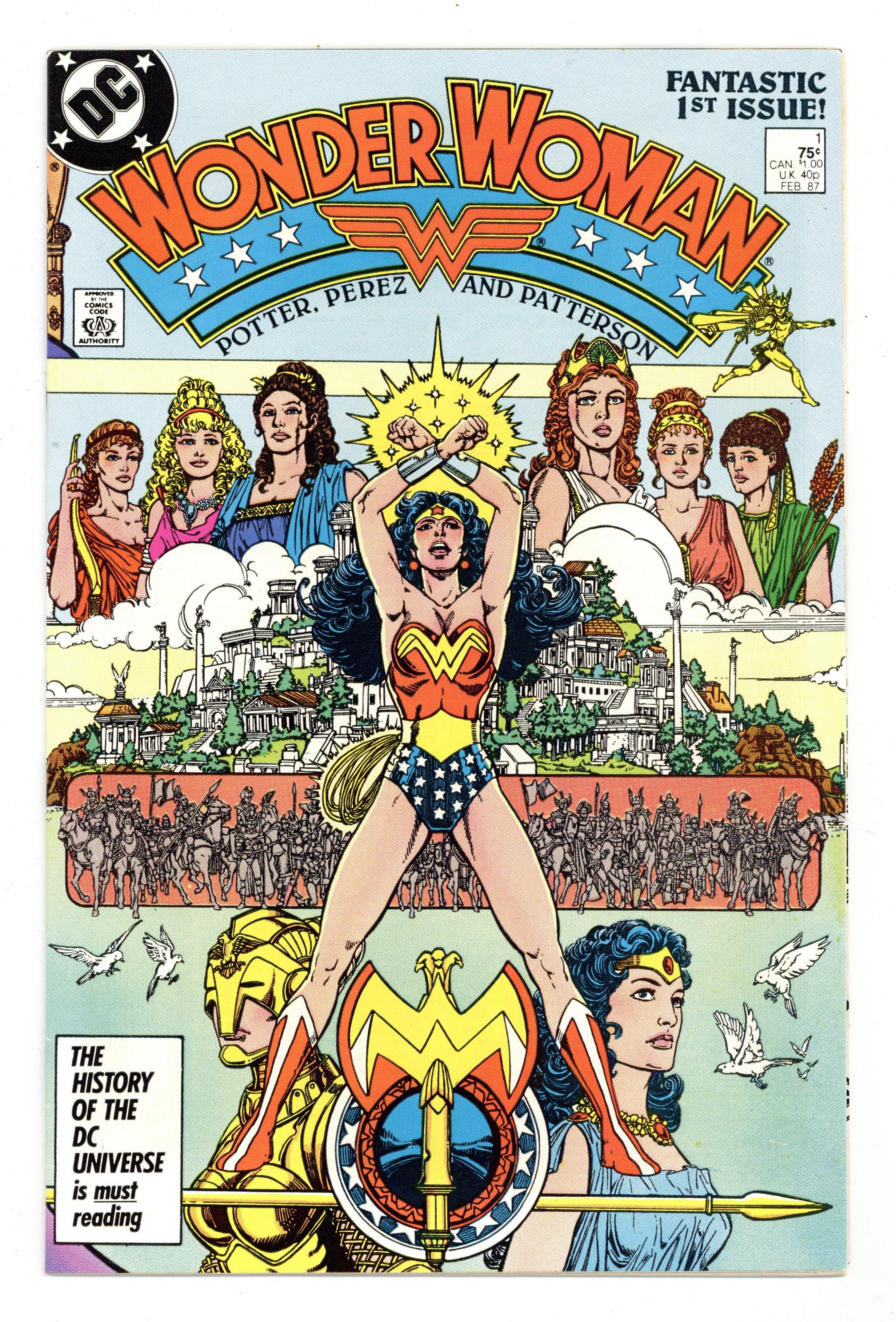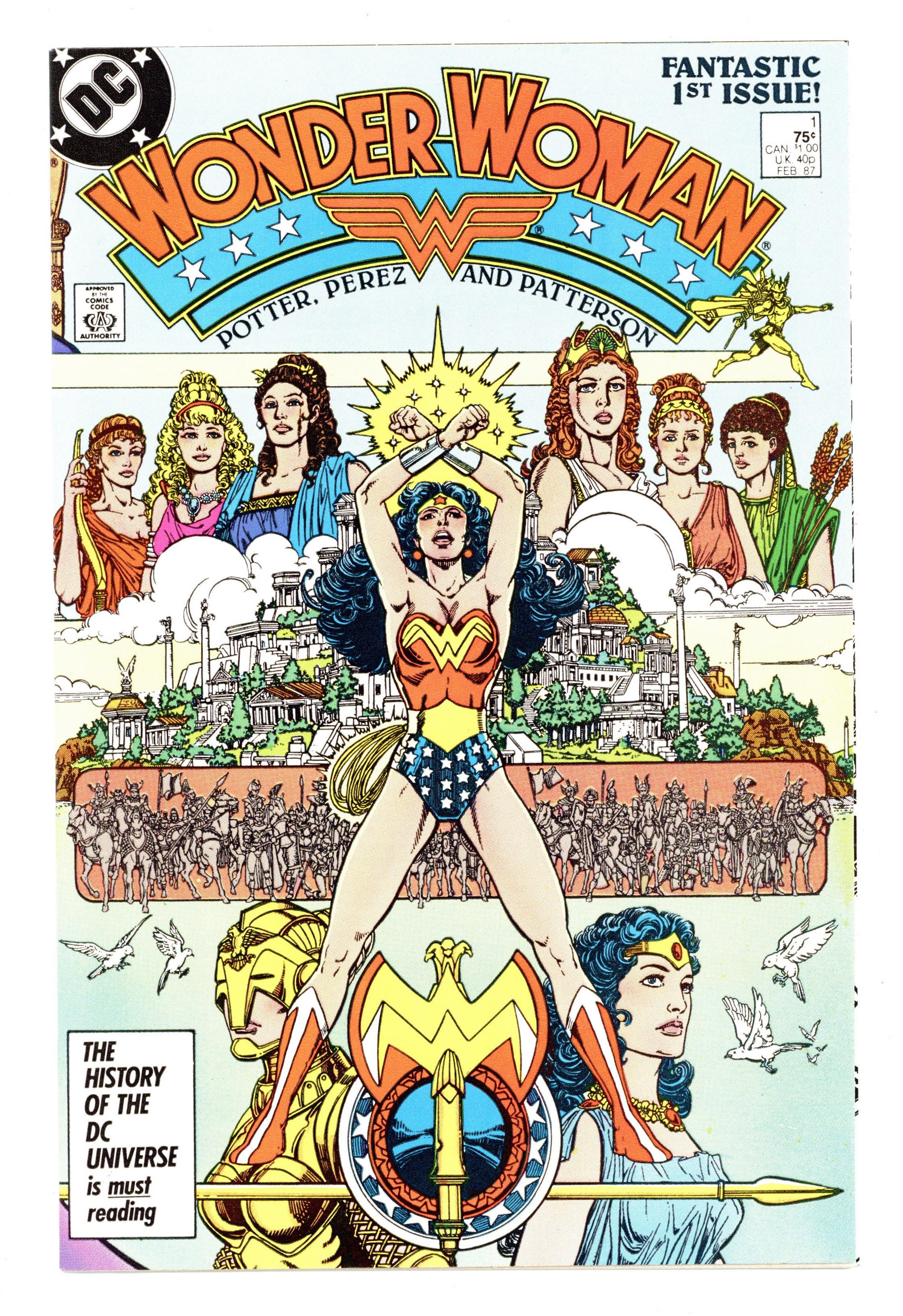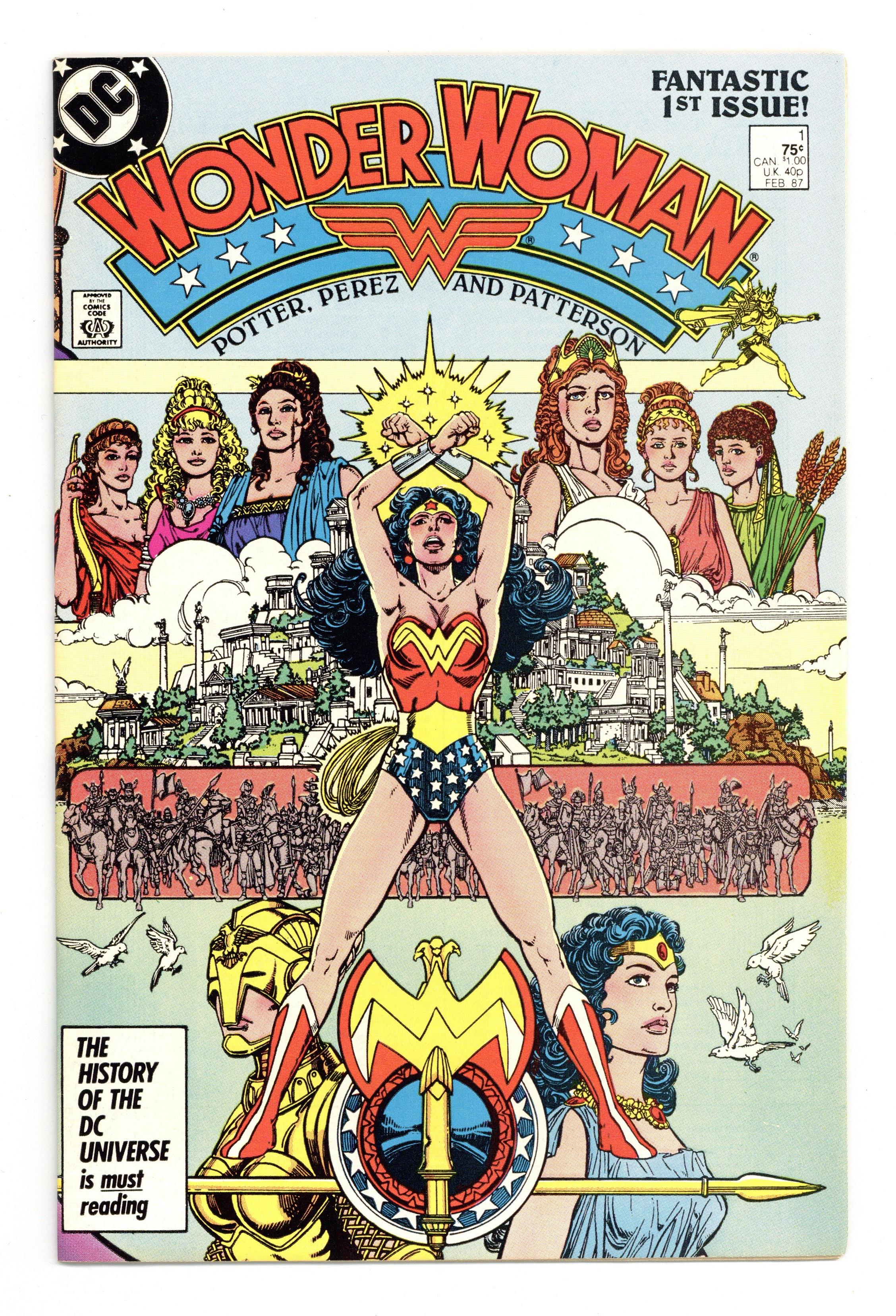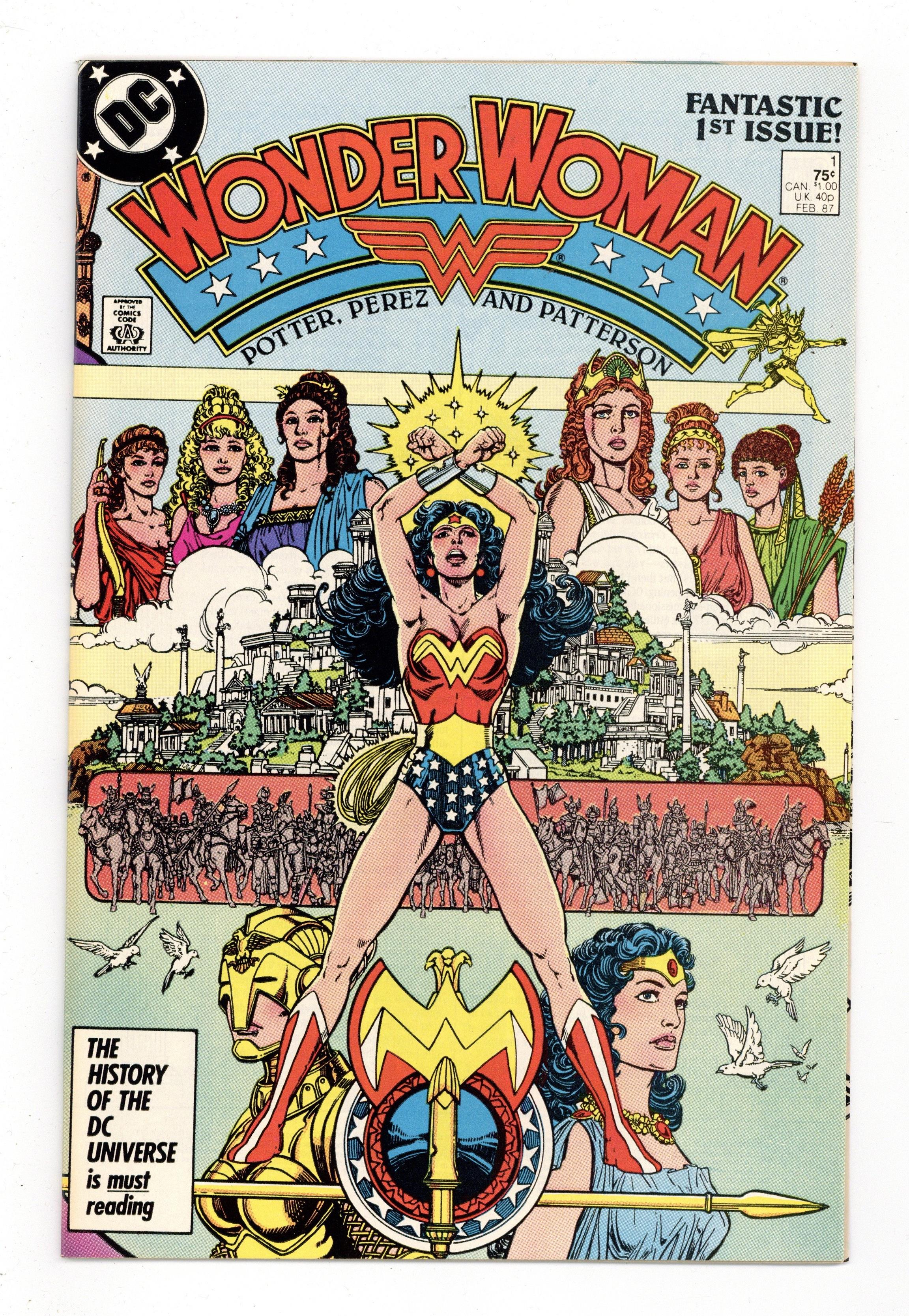 Starts Jan 3 Direct Edition. In this post-Crisis on Infinite Earths re-imagining of the Wonder Woman mythos, Diana is born of clay, growing on Paradise Island to become the champion of the Amazons. "The Princess and the Power!" Part 1 of 6, continued next issue. Script by Greg Potter, co-plot and pencils by George Perez, inks by Bruce Patterson. Perez inks first 2 pages and the final page. Wrap-around cover. No ads. Perez cover. 36 pgs. Cover price $0.75.